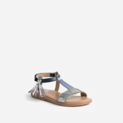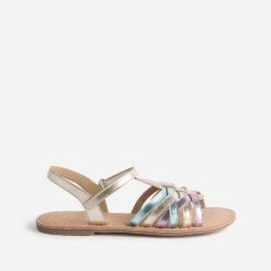 Confectionnée en cuir métallisé, cette sandale pour junior fille se décline en coloris or, rythmée de brides parme et turquoise. Un modèle à préférer avec des tenues estivales dans les tons pastel.
