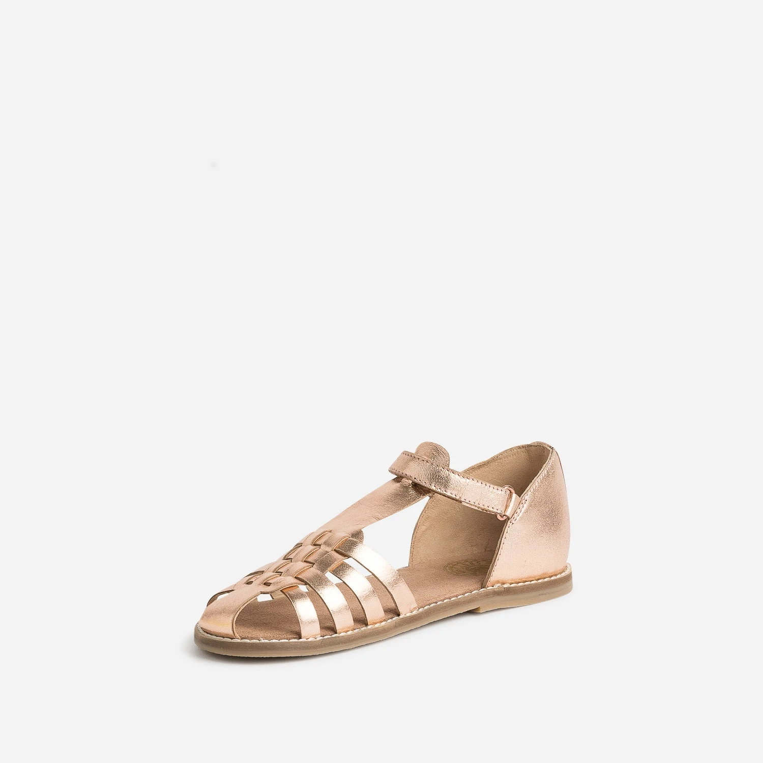 Nouvelle saison estivale, nouveau modèle de sandale pour fille. Confectionnée en cuir, elle se décline en coloris rose cuivré et se démarque par un jeu de brides tressées sur le dessus du pied ; un pied parfaitement maintenu, grâce au contrefort arrière et une fermeture par scratch. Avec un tee-shirt à manches ballon et un short en jean pour le quotidien, avec une robe en tulle pour une cérémonie, elle s’adapte à l’infini.