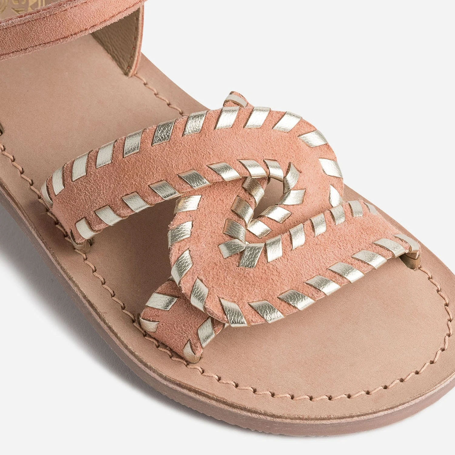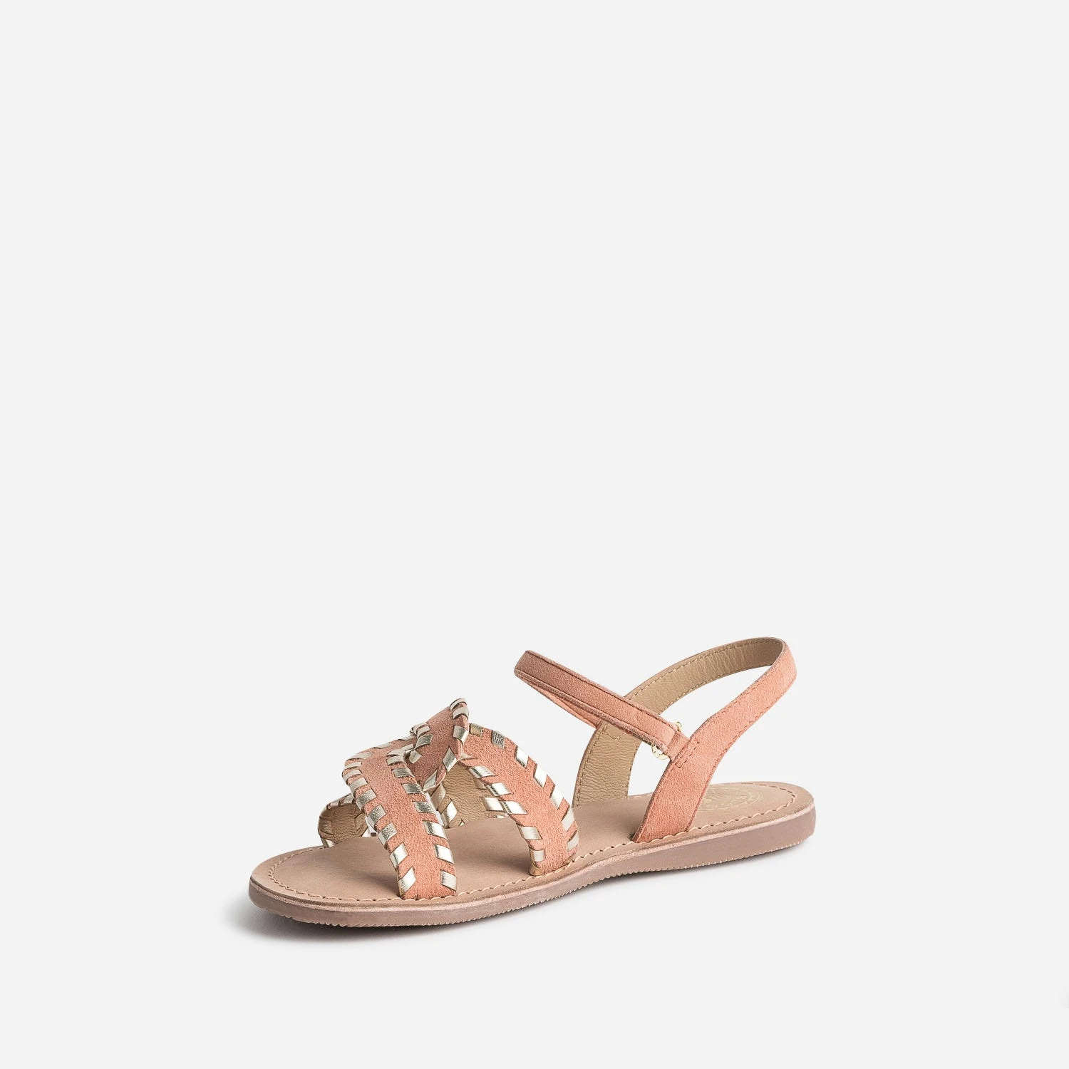 Cette sandale fille séduit par le cuir velours et le coloris rose saumon, par les brides croisées sur le dessus du pied et le tressage doré. Elle se ferme par un scratch, à ajuster en fonction du cou-de-pied. A associer avec des teintes pastel, amande, jaune ou ciel.