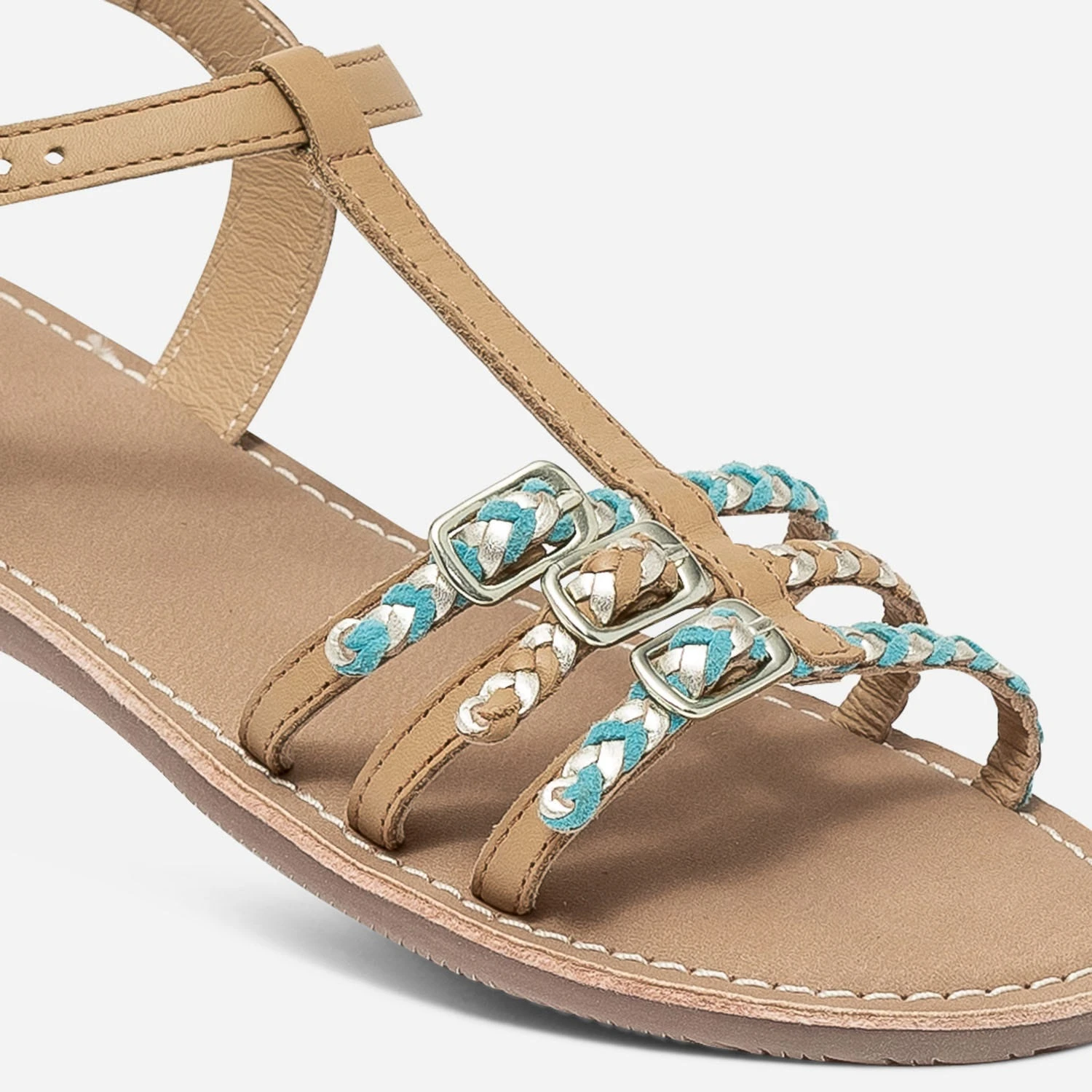 Camel, turquoise et or : c’est le trio tendance de la saison. Entièrement confectionnée en cuir, depuis la tige jusqu’à la doublure, en passant par la première, cette sandale fille se se démarque par 3 brides tressées, colorées, métallisées. Un modèle à porter dès l’arrivée des beaux jours, avec une tenue chic ou plus quotidienne.