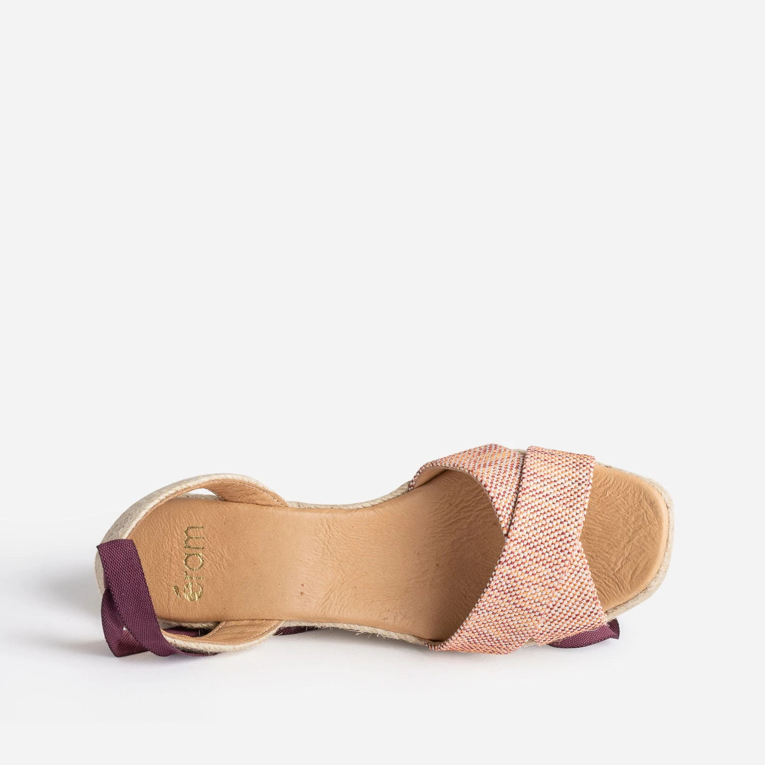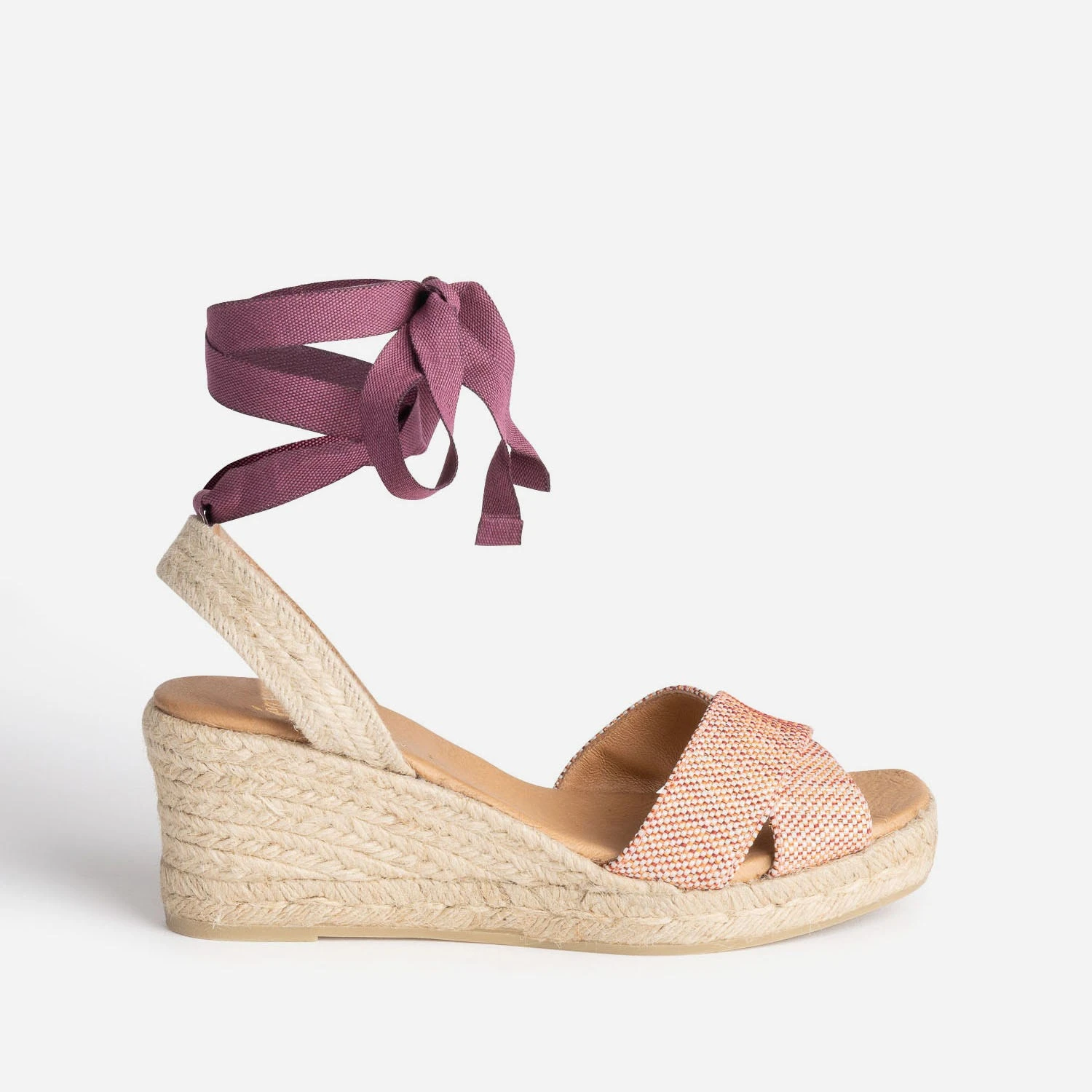 Adoptez le style bohème avec cette sandale femme. Double bride en textile prune, corail et blanc tressé à l’avant, bride arrière et talon compensé en corde, elle se démarque par un bout carré et un lacet-ruban prune, à nouer autour de la cheville. Gagnez quelques centimètres sans efforts et portez-la avec une tenue d’été dans les mêmes tonalités.