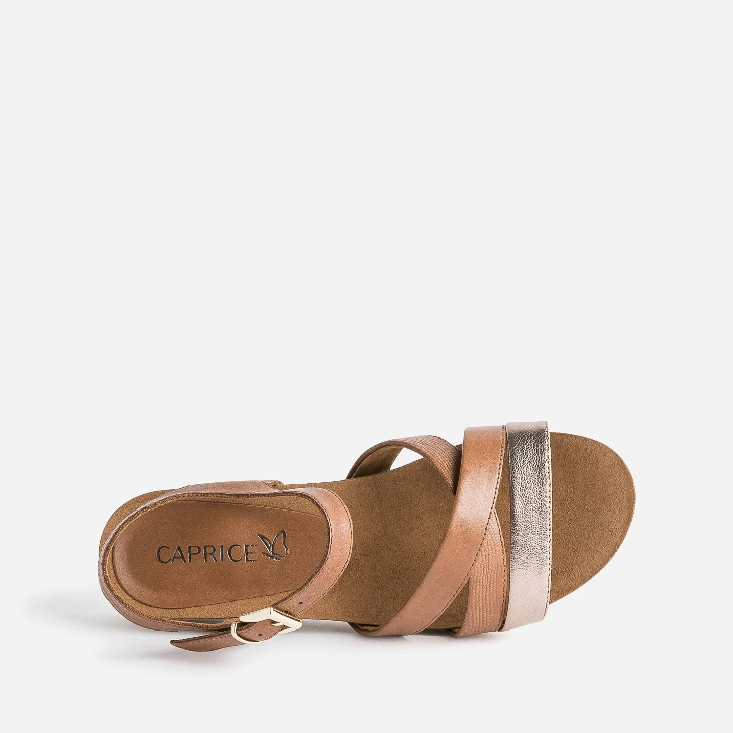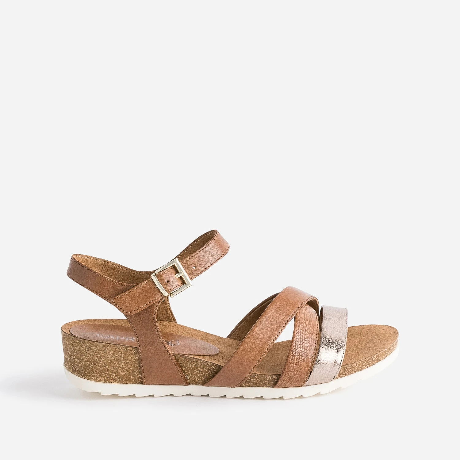 Spécialiste du bien-être, la marque CAPRICE propose des chaussures au confort incomparable. Place à l’été avec une nouvelle sandale toujours plus féminine. Laissez-vous séduire par la souplesse incroyable de son cuir, avec doublure et semelle première en cuir synthétique. En duo de camel et bronze, elle présente 3 brides à l’avant du pied, dont une avec embossage effet python. Alliance du confort et de l’élégance, son petit talon compensé de 3,5 cm, associé à sa semelle antidérapante souple, offrent une stabilité parfaite.