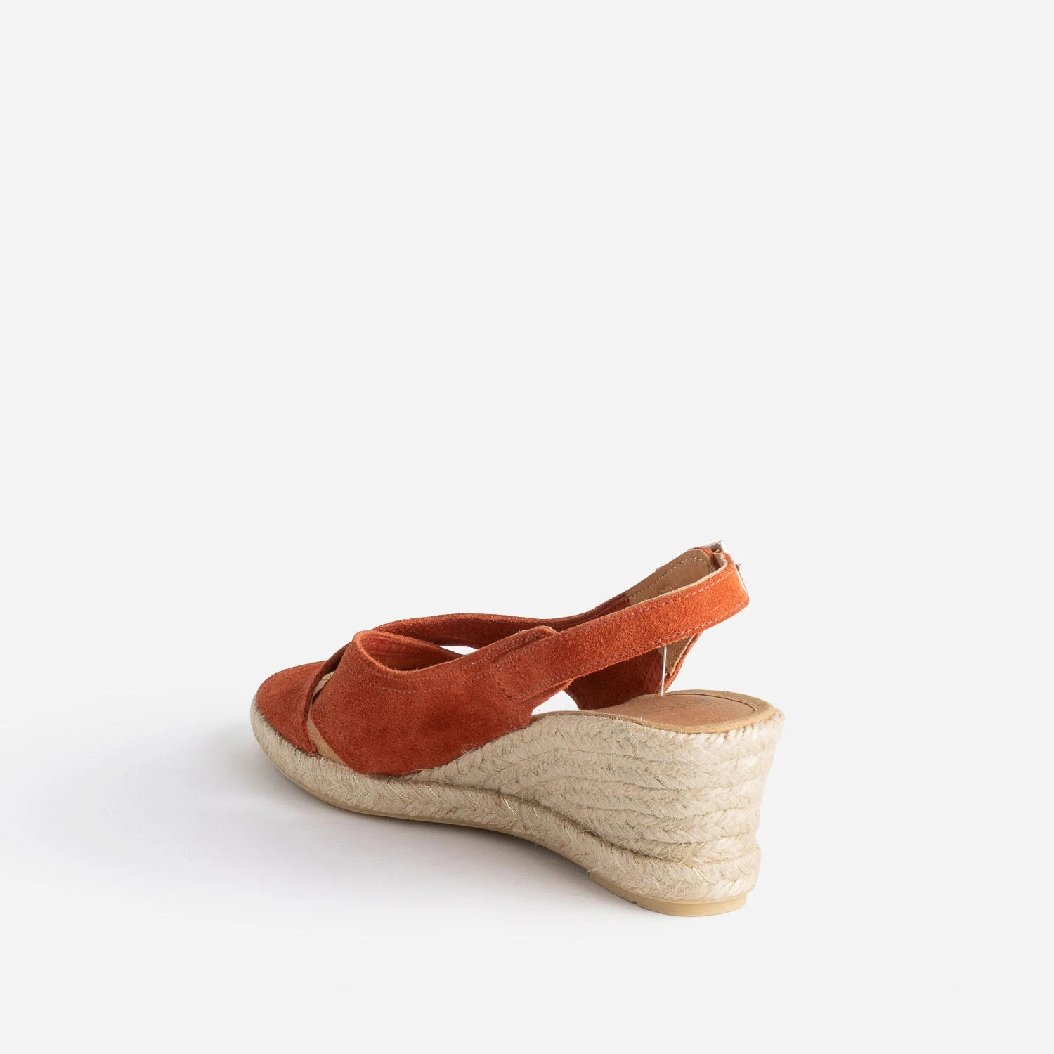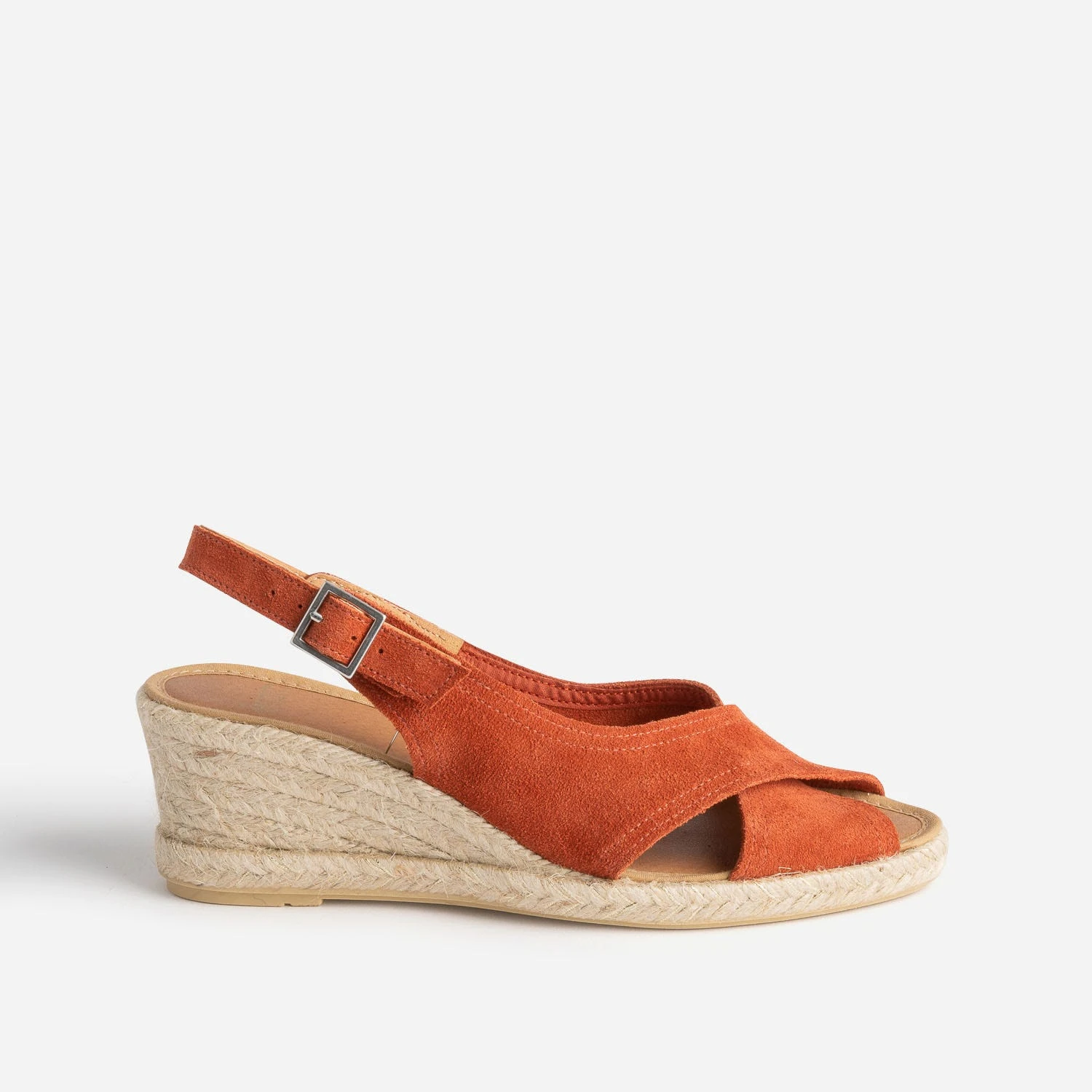 L’espadrille prend de la hauteur. Revisitée par un talon compensé, elle accueille deux larges brides en cuir velours terracotta, croisées sur le dessus du pied, libérant le bout des orteils. Elle se ferme par une boucle carrée en métal blanc sur la cheville. Portez-la avec des matières naturelles, lin ou coton, et des tons doux, beige ou camel, ou plus foncés, comme le prune ou le kaki.