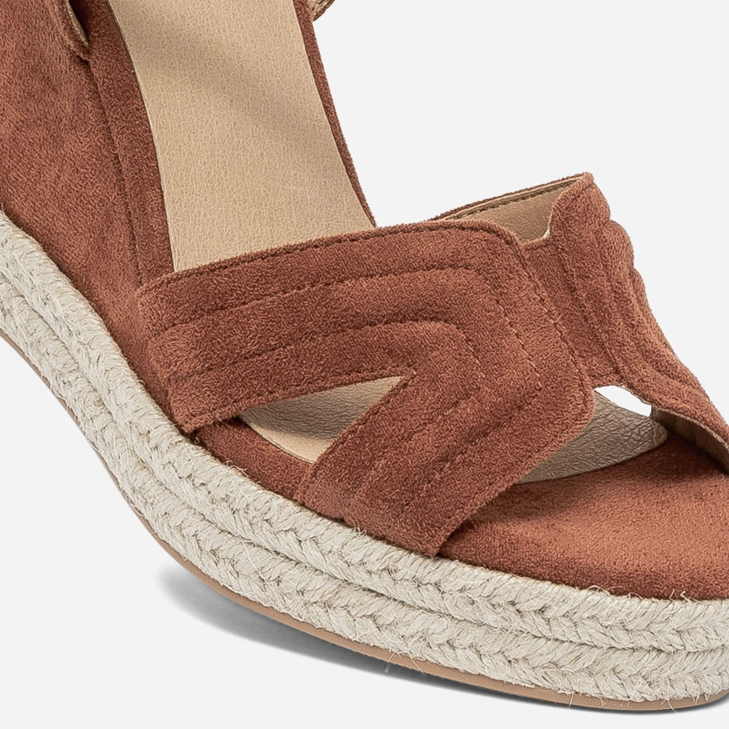 Et si vous changiez ? Et si vous profitiez de l’été pour infuser, dans vos looks, un coloris épicé ? C’est l’idée de cette sandale compensée pour femme. En textile suédé, elle séduit par une large bride fantaisie, en soutien de la bride cheville, pour maintenir le pied. Le talon bi matière, de 10 cm à l’arrière et 2,5 cm à l’avant, est souligné de corde naturelle, et permet une cambrure du pied optimale. Un modèle à associer avec des teintes chaudes, comme le jaune safran ou le camel, et à essayer avec du beige ou du kaki.