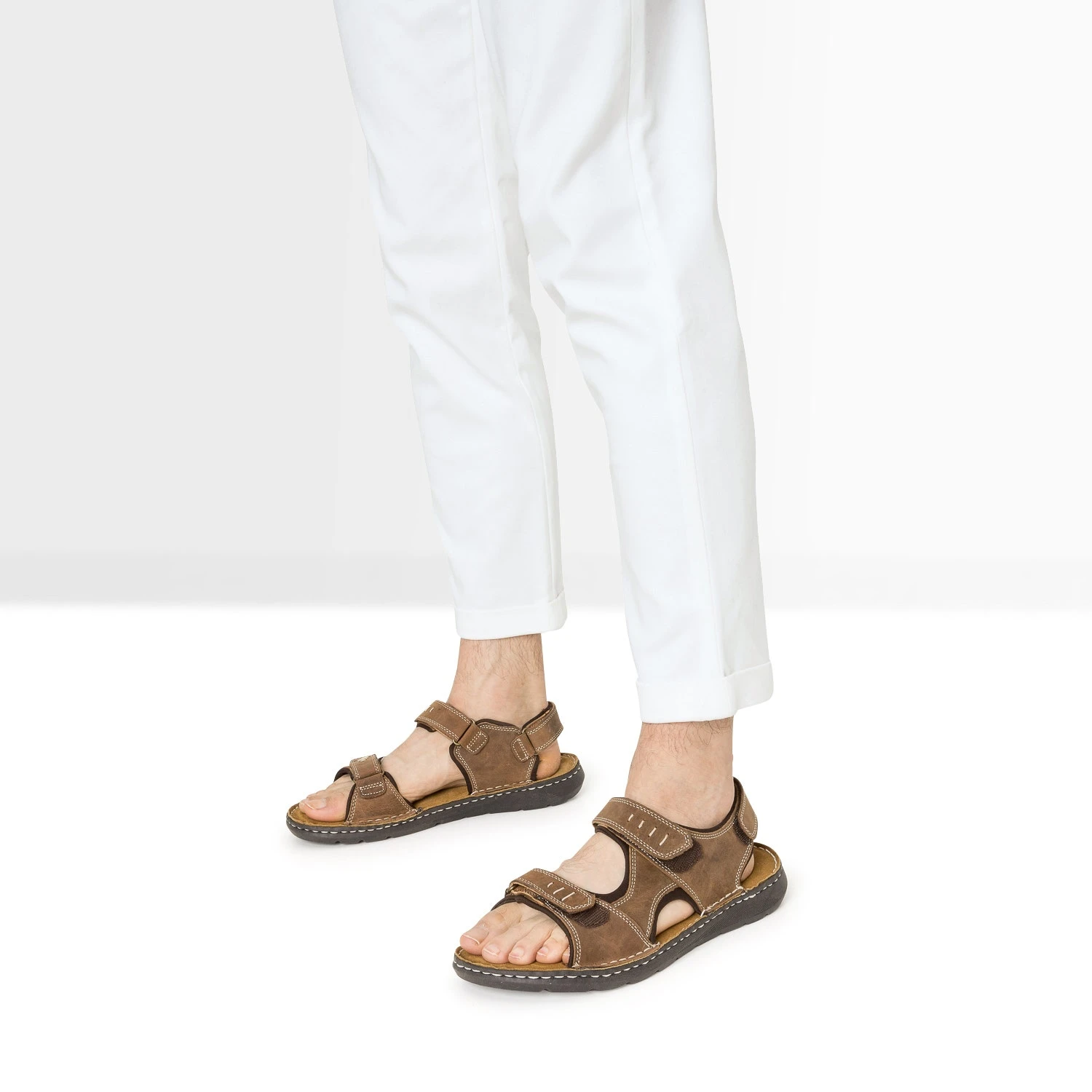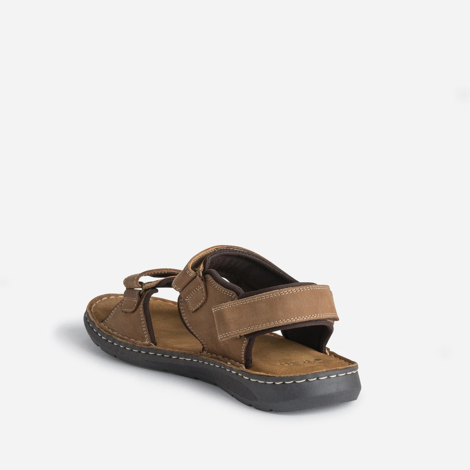 Dessus 100% cuir, doublure 100% cuir, première 100% cuir aussi : la sandale pour homme assure un confort dont vous vous souviendrez. Grâce à ses 3 brides et sa double fermeture par scratchs, le pied est parfaitement maintenu. Son coloris marron, rythmé de surpiqûres écrues, assure un style authentique. Un modèle à réserver aux week-ends et aux vacances, avec un look décontracté.