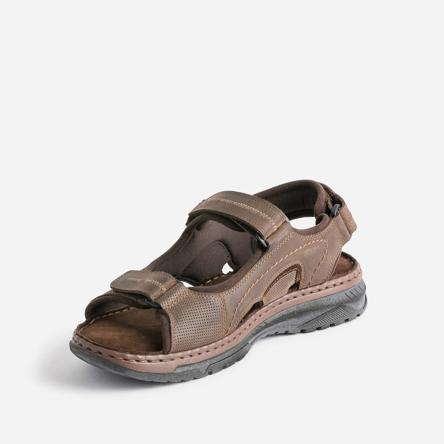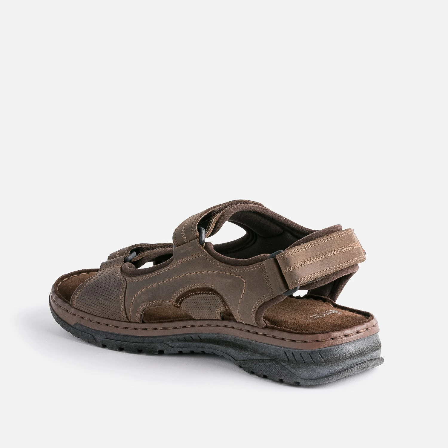 3 larges brides fermées par scratchs. Du cuir dessus, du textile légèrement matelassé sur la doublure, du cuir velours pour la semelle intérieure. La sandale pour homme mise tout sur le confort avant tout. Elle se décline en coloris marron, rythmé de surpiqûres ton sur ton. Un modèle casual, à réserver avec un look décontracté.