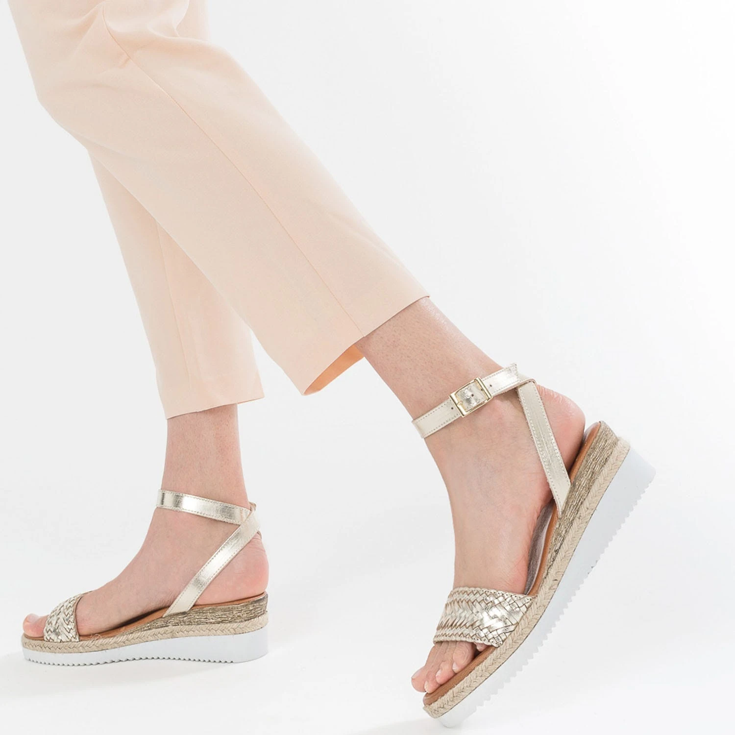 Compensée juste ce qu’il faut, la sandale femme est un essentiel du shoesing estival. En cuir non doublé, elle séduit instantanément quand vous y déposez votre pied. Son secret ? Une première en cuir moussée, pour un confort absolu, et deux brides, une tressée et une lisse, pour maintenir le pied. La semelle blanche esprit sport est rehaussée d’une tresse en corde esprit bohème, dans un mix de tendances parfaitement maîtrisé. Déclinée en coloris or, elle matche facilement avec les couleurs de la saison.