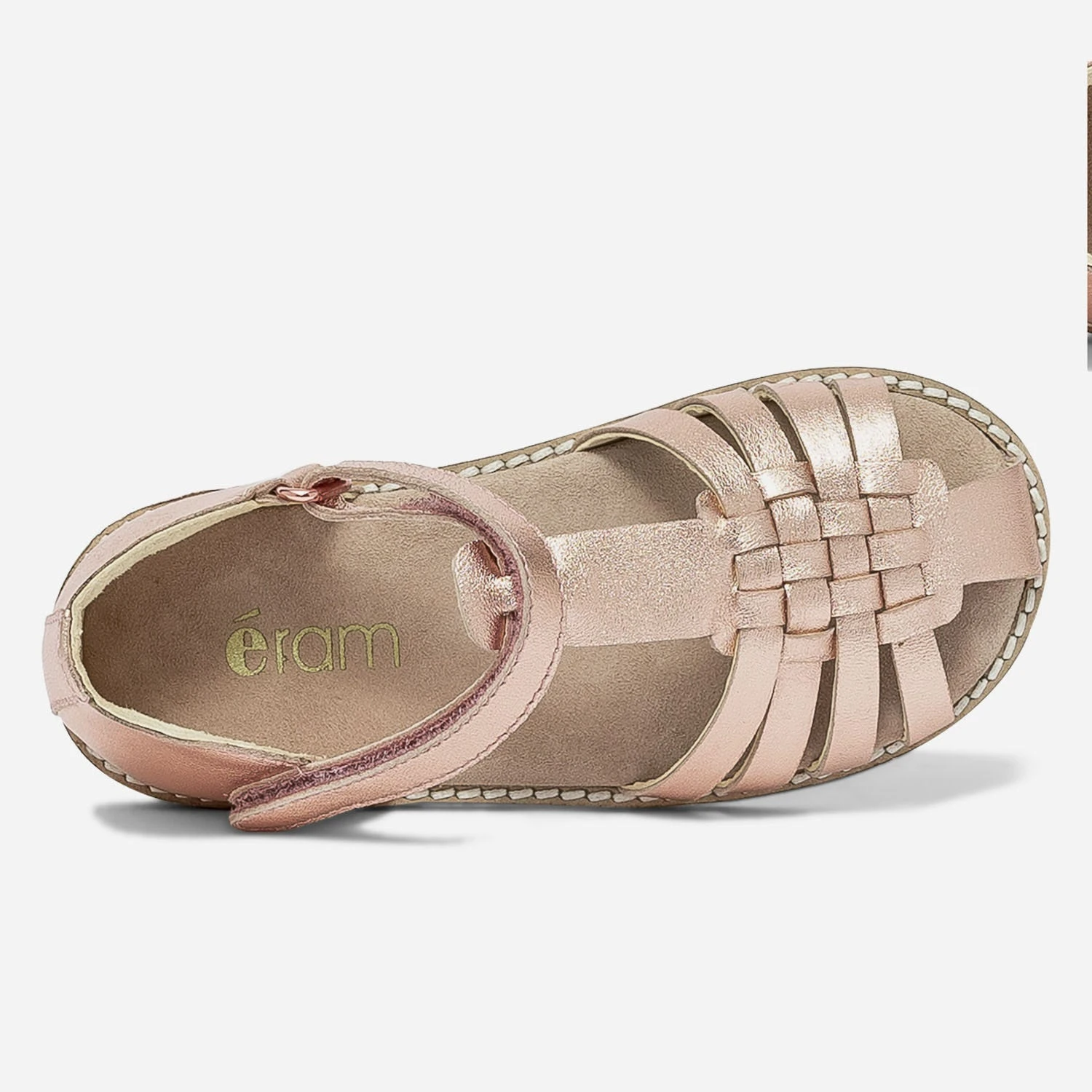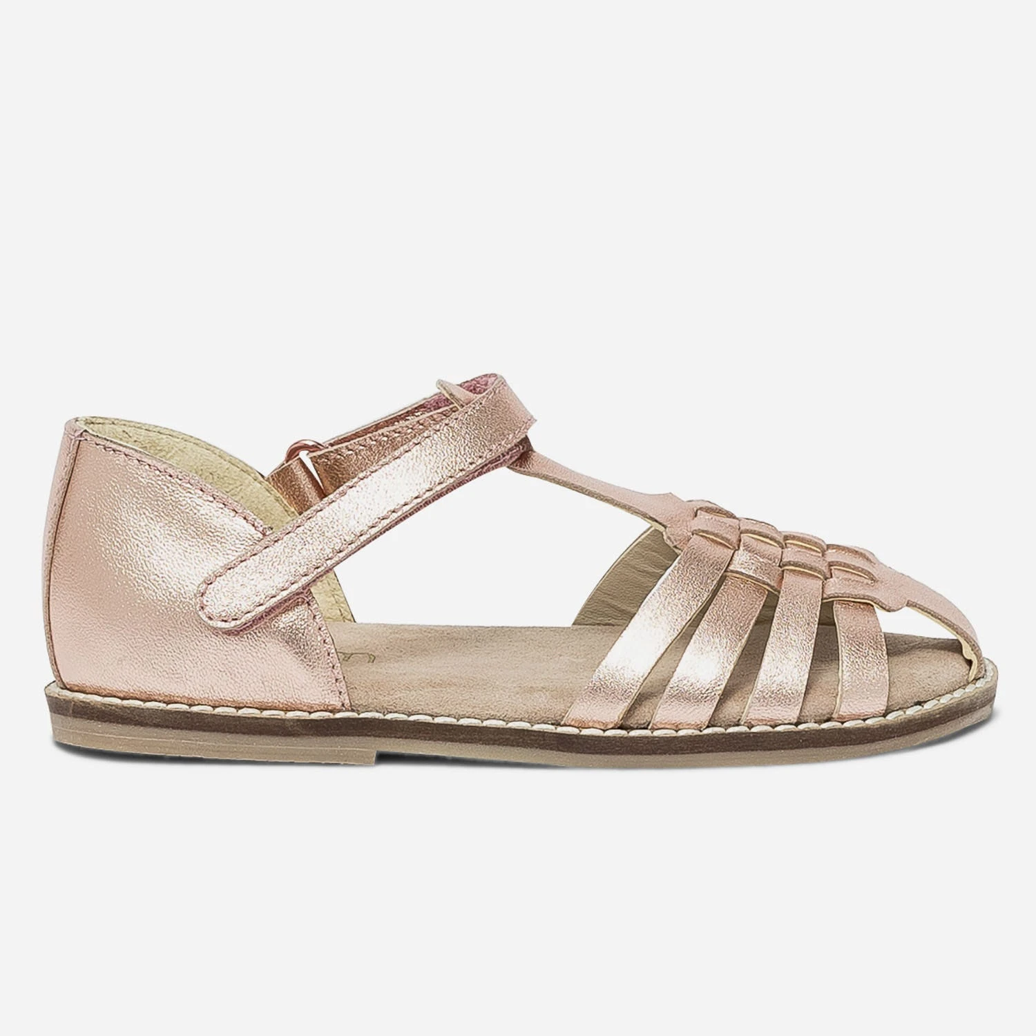 Le rose cuivré, c’est le nouveau doré ! Cette sandale pour fille reprend une forme très classique, avec bout fermé et contrefort, twistée par du cuir métallisé rose cuivré et un joli tressage sur le dessus du pied. Elle se ferme par un scratch, facilement maniable par les plus petites. Un modèle aussi élégant avec une robe de cérémonie qu’avec une tenue plus décontractée pour courir dans la cour de récré.