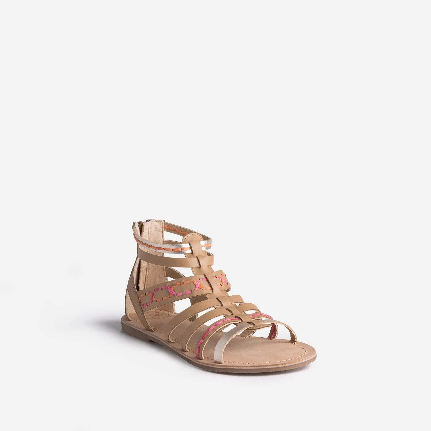 Inspiration spartiate pour cette sandale junior fille. Reconnaissable à ses brides multiples et sa tige montante, elle est conçue en cuir beige, rythmé de broderies raphia rose et orange. Elle se ferme par un zip, placé sur le contrefort. Un modèle idéal avec une robe longue blanche esprit bohème et des petites tresses dans les cheveux.