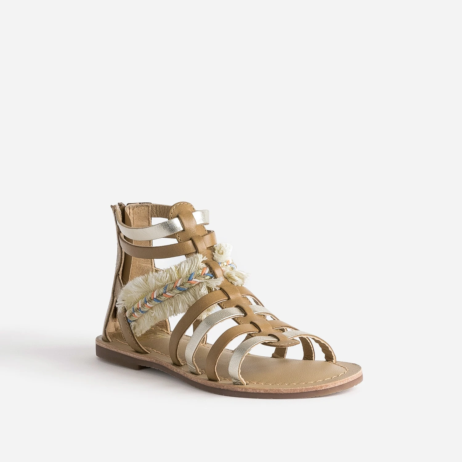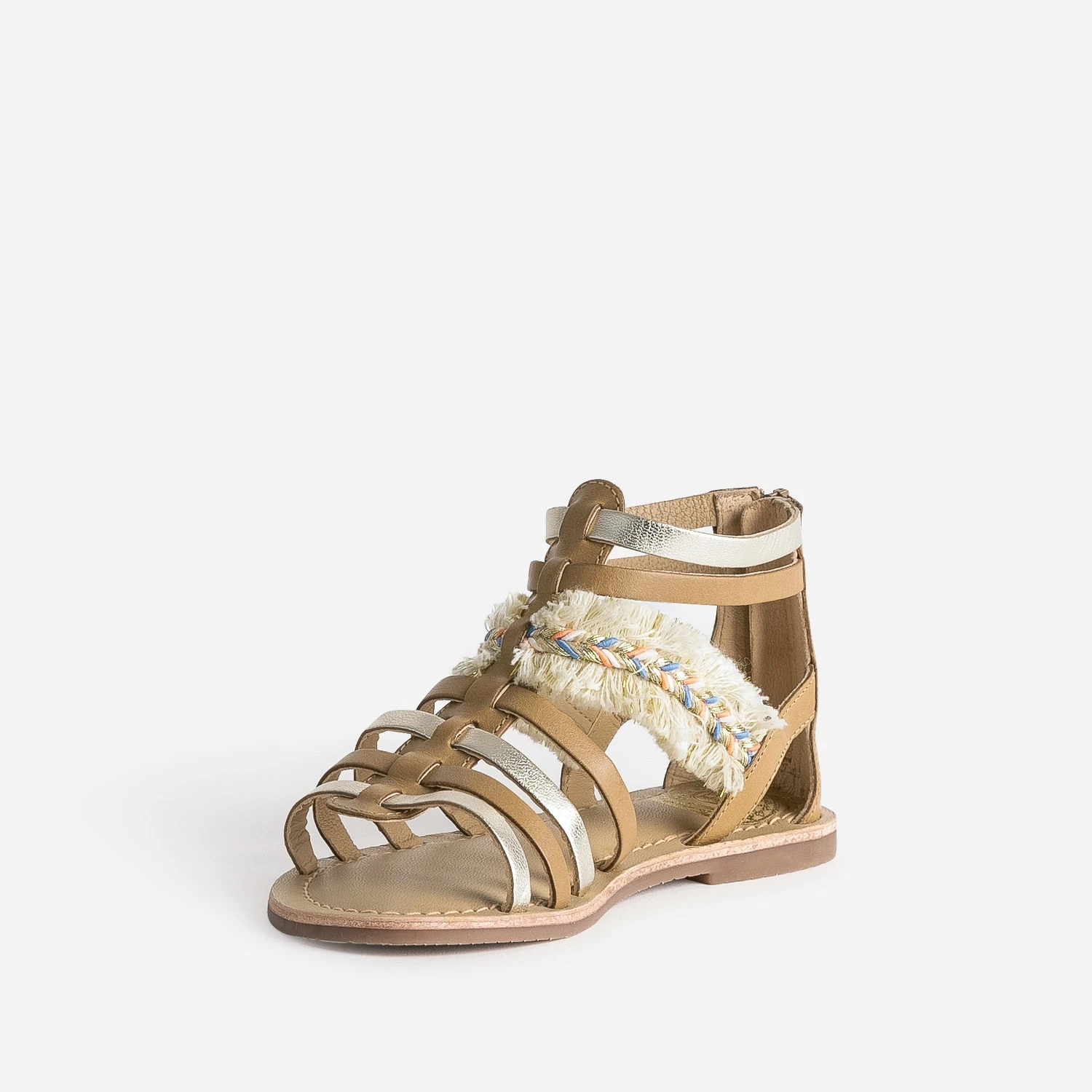 Par sa tige montante et ses brides multiples, cette sandale fille emprunte le style spartiate. Confectionnée en cuir lisse, elle se décline en coloris camel et doré, et est décorée d’un galon tressé bordé de franges. Un modèle idéal avec un débardeur et un short en jean comme avec une robe longue, pour un esprit bohème étudié.