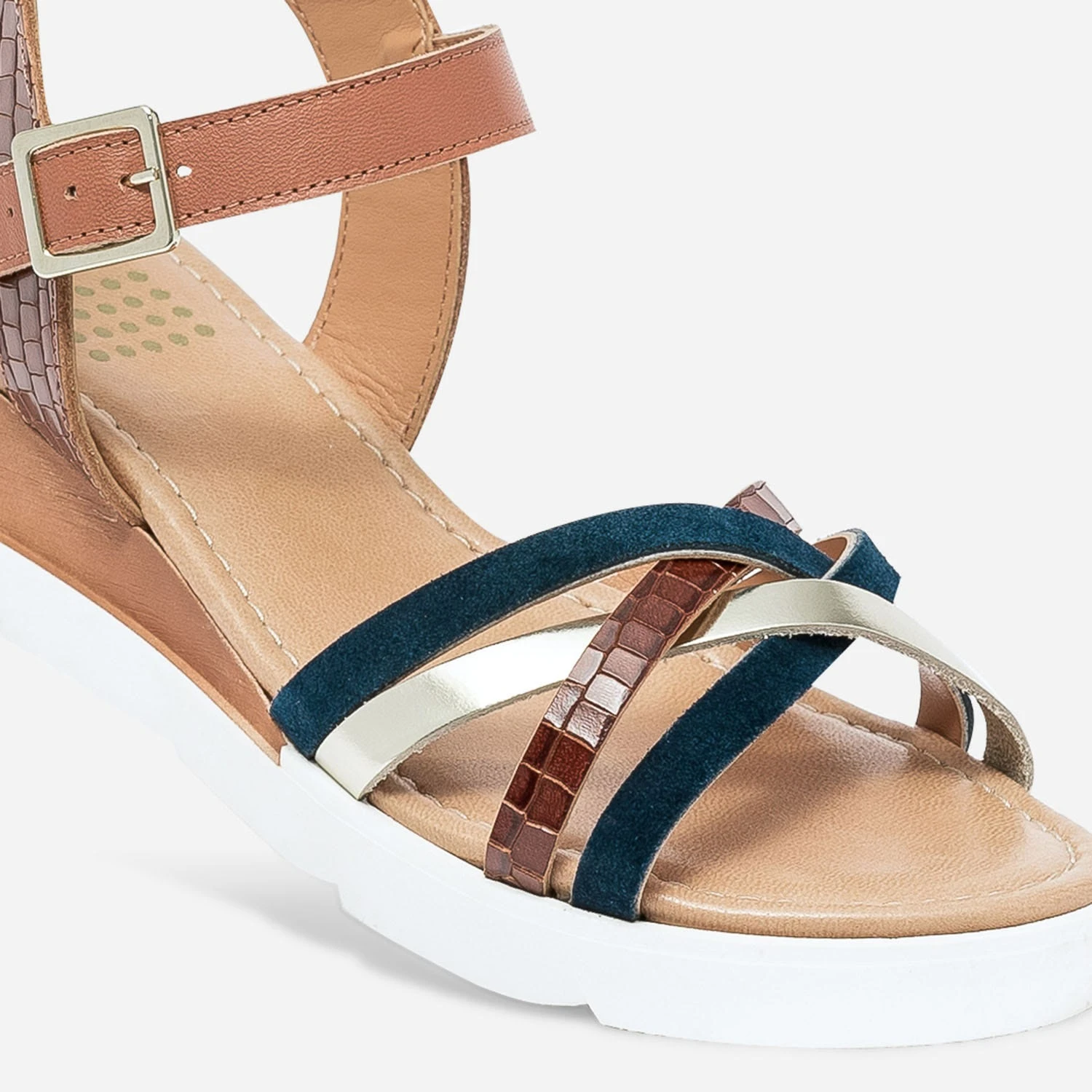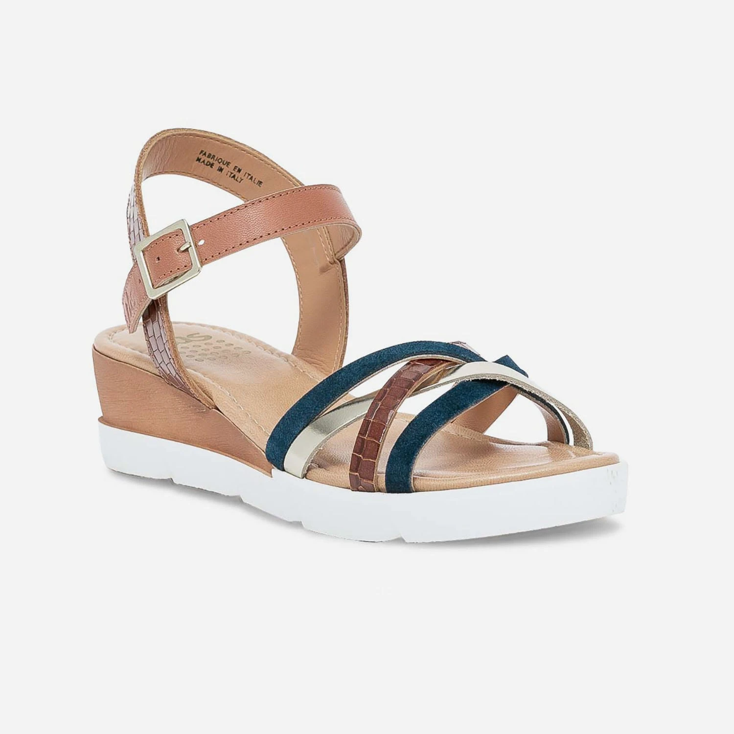 Née du sport, la marque TBS trouve son ancrage dans l’univers nautique. Légitime à terre comme en mer, ses produits sont reconnus pour leur confort. Affirmez votre style avec une sandale à l’aise en toutes circonstances. En cuir cognac, elle multiplie les brides pour maintenir le dessus du pied : cuir velours bleu marine, cuir lisse doré, cuir embossé effet python cognac et marron foncé. Montée sur une première moussée et un talon compensé, elle s’adapte à toutes vos activités de la journée.