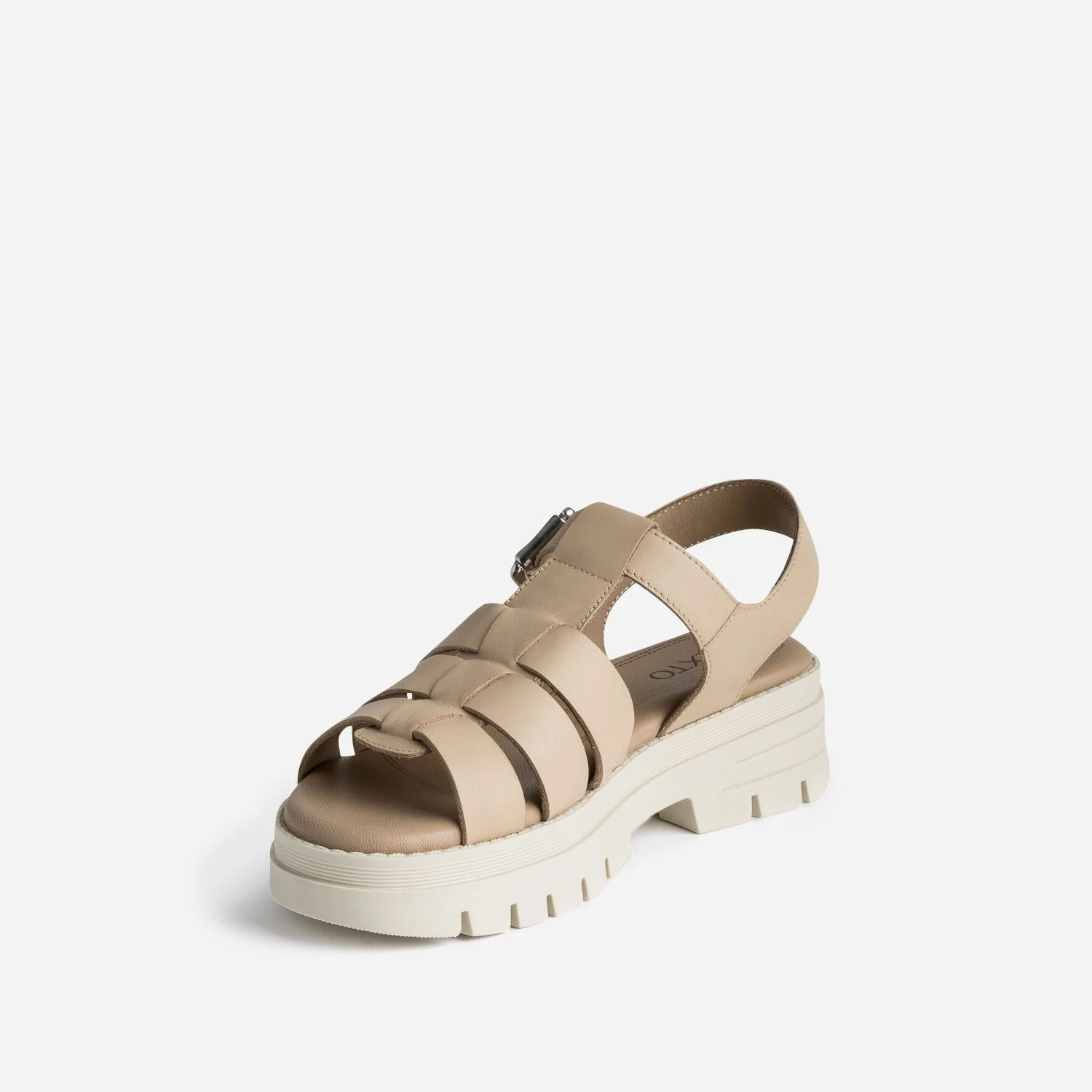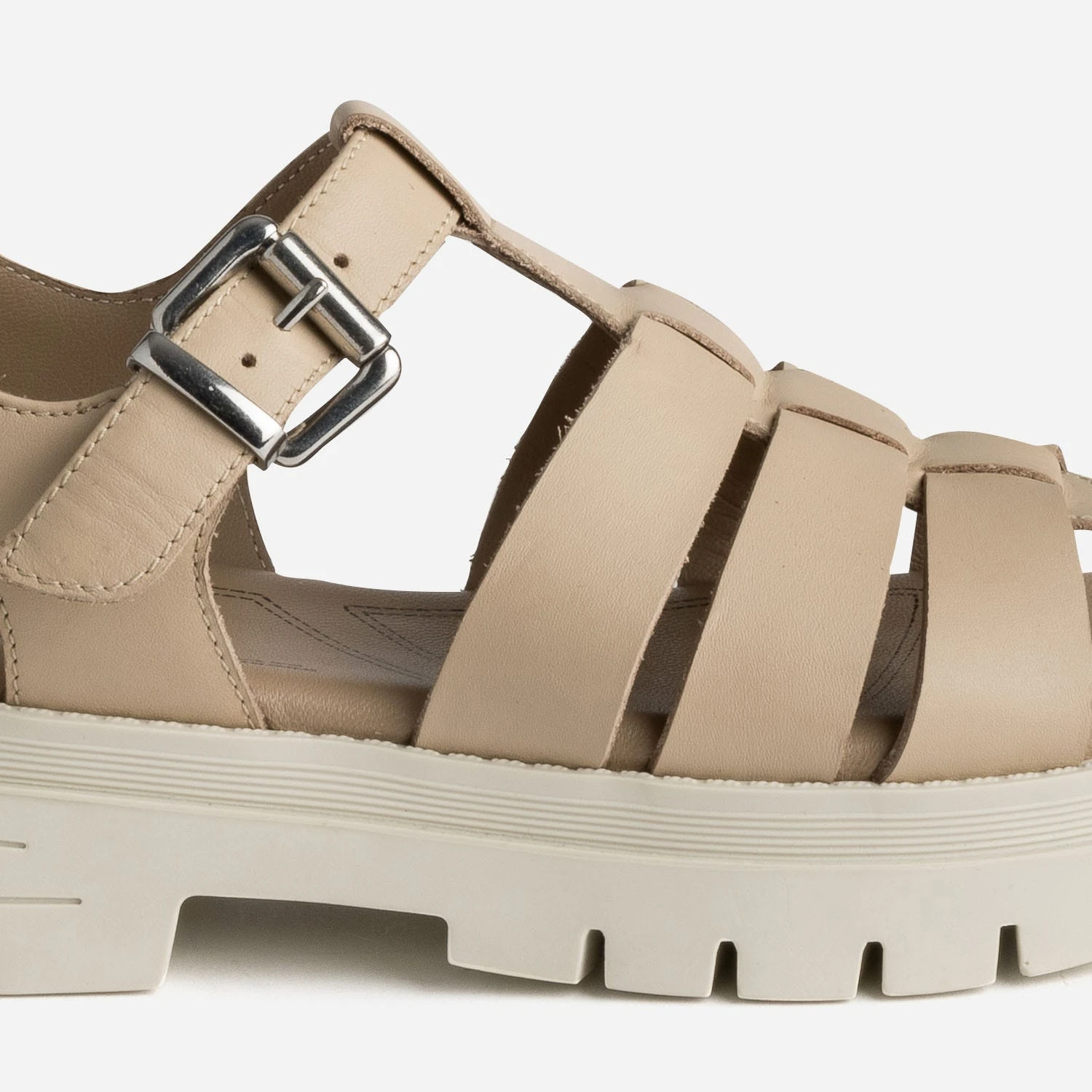 Inspirées par la forme des célèbres sandales en plastique, les brides se multiplient sur ce modèle femme. Revisité en cuir beige sur une semelle épaisse et crantée, il s’invite en zone urbaine, avec un sweat pastel et un jean mom délavé pour une allure streetswear, avec une combinaison kaki, pour une allure aventurière.