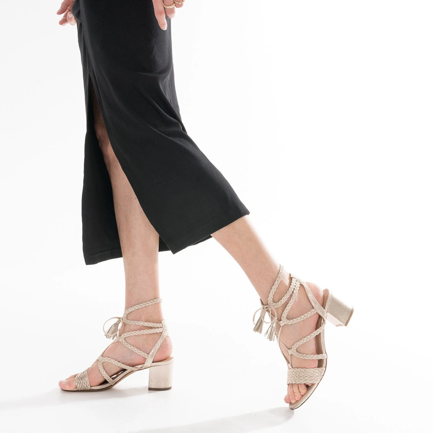 Comment reconnaître le style bohème ? Associez matières douces, techniques artisanales et couleurs naturelles dans une belle harmonie. Exemple à suivre : cette sandale femme. En matière synthétique de couleur dorée et finition irisée, elle maintient le pied par un subtil jeu de brides tressées qui montent jusqu’à la cheville. Montée sur un talon carré, elle se ferme par un lacet finalisé par deux pampilles. Un modèle à imaginer avec une tenue vaporeuse et un beau panier en paille.
