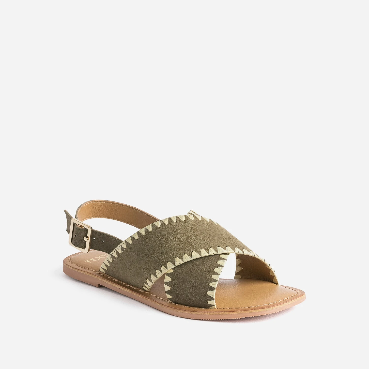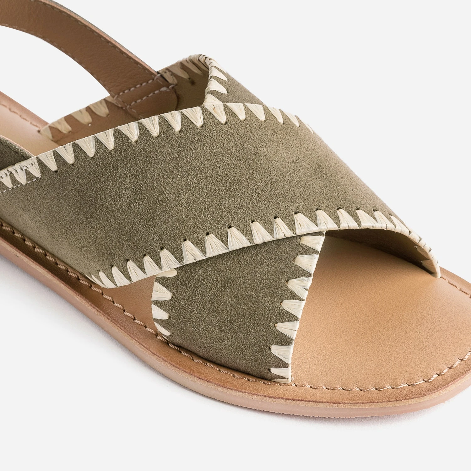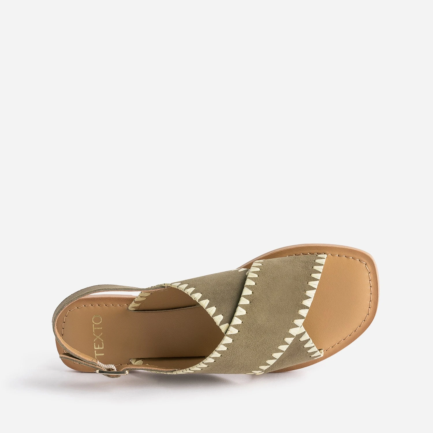 Ethnique ou bohème, cette sandale pour femme s’adapte à votre style préféré. En cuir velours kaki, elle est constituée de deux larges brides croisées, avec tressage imitation raphia sur les bords. Plate, elle se porte avec un tee-shirt blanc et une jupe longue beige, et des bijoux en bois.