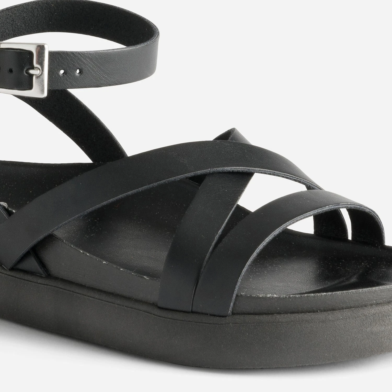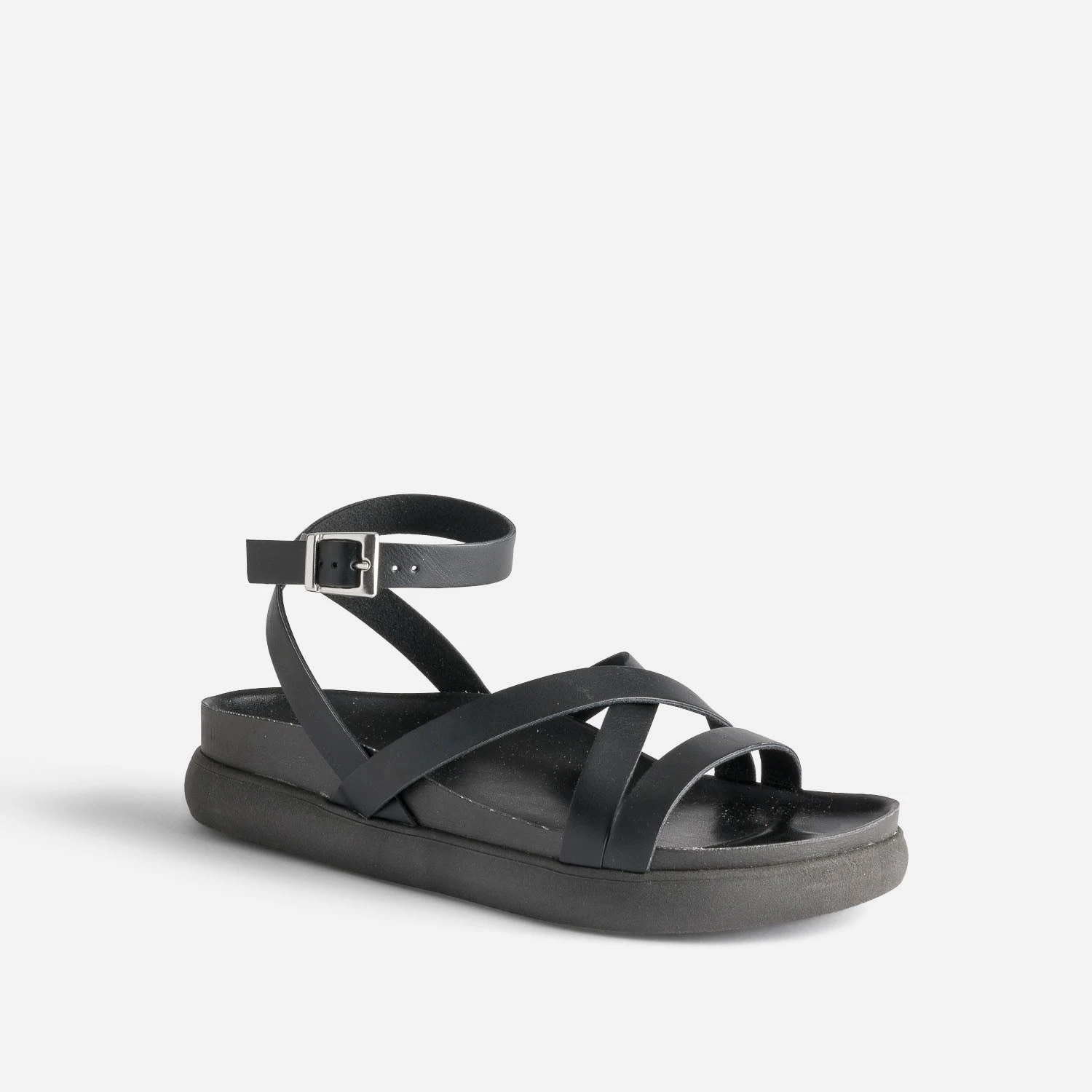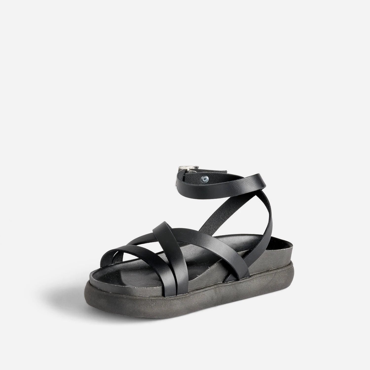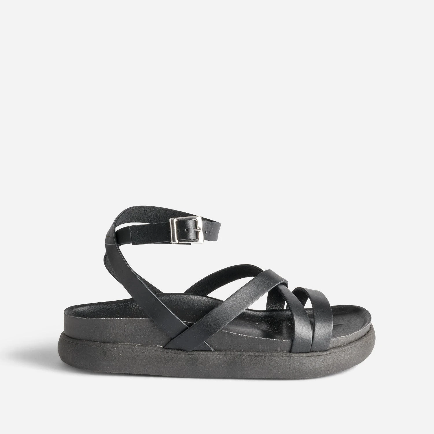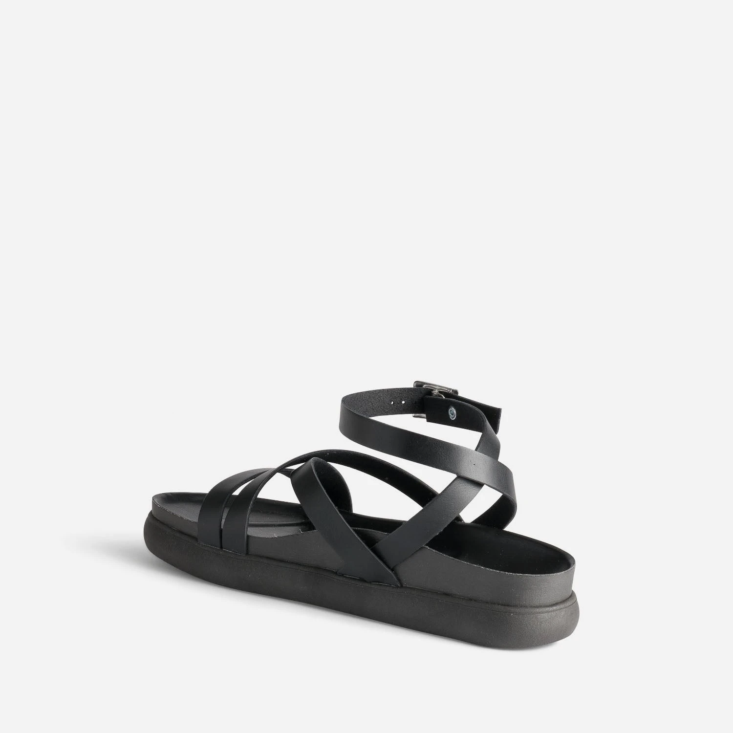 Confortable et stylée, c’est ce que l’on demande à la sandale d’été, ni plus, ni moins. Entièrement noire, des brides à la semelle extérieure, en passant par la première, elle offre un maintien parfait, jusqu’à la cheville. Imaginez-la avec un tee-shirt blanc et un pantalon large rose fuchsia.