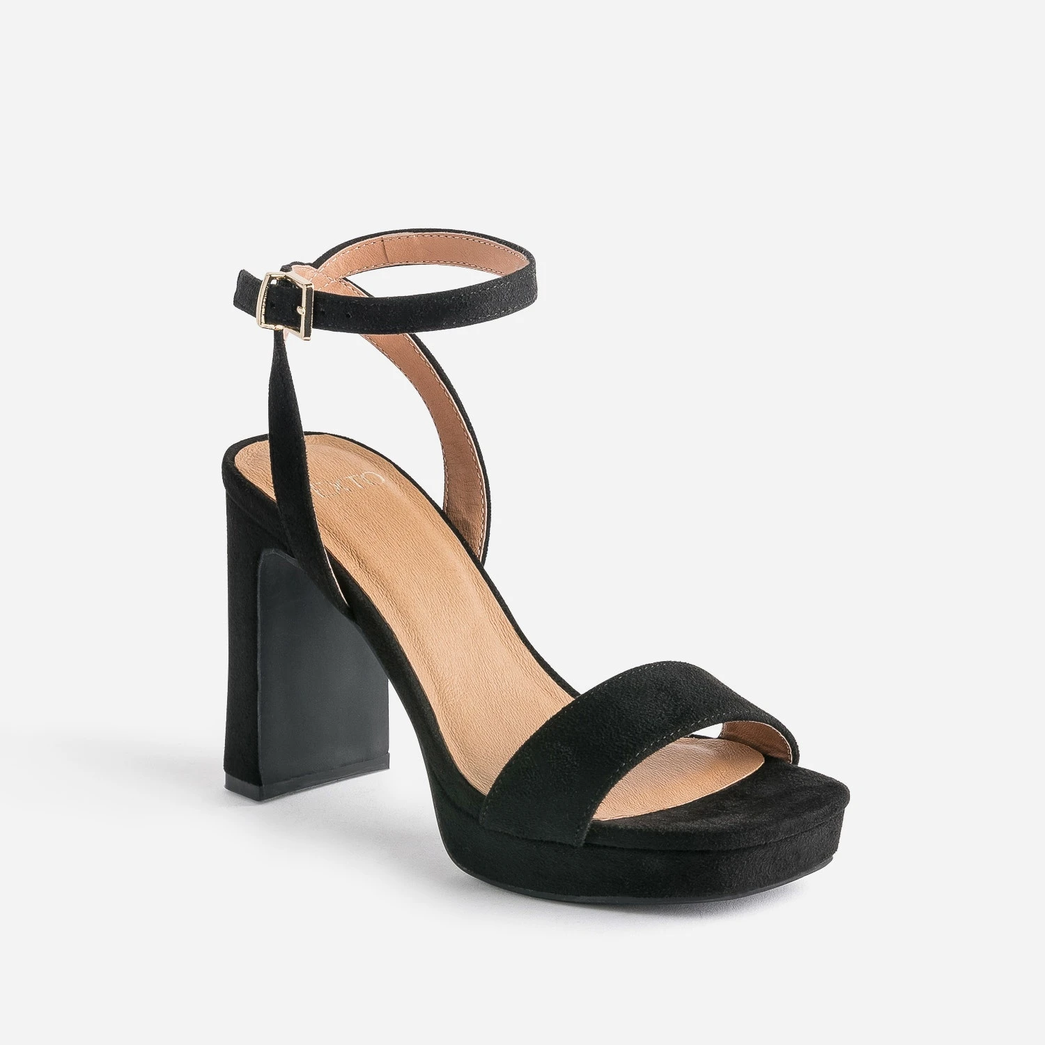 Prendre de la hauteur n’est pas qu’une simple expression. C’est la promesse de cette sandale femme. En textile suédé noir, elle présente un bout carré, un talon haut de 9,5 cm soulagé par une plateforme avant de 2 cm. Style glam’chic assuré, avec chemise et jupe crayon, ou robe bustier ou combi-pantalon esprit smocking.