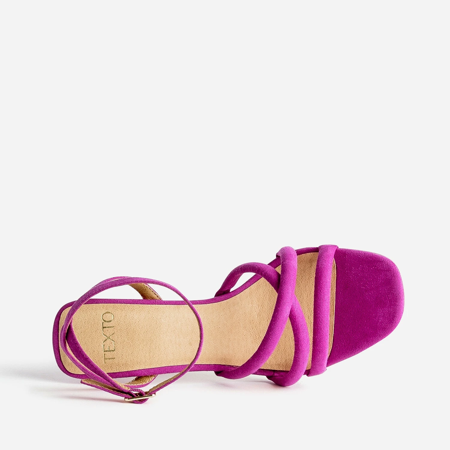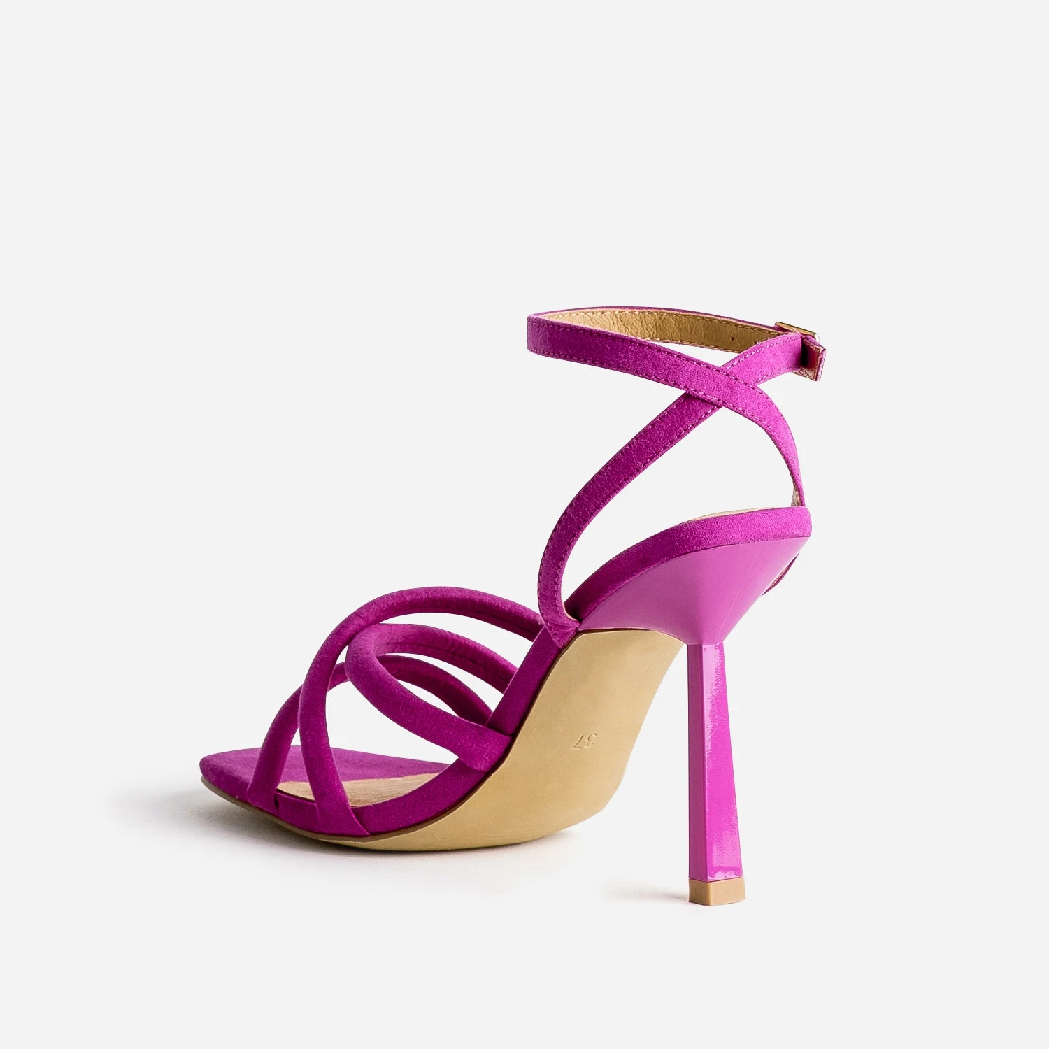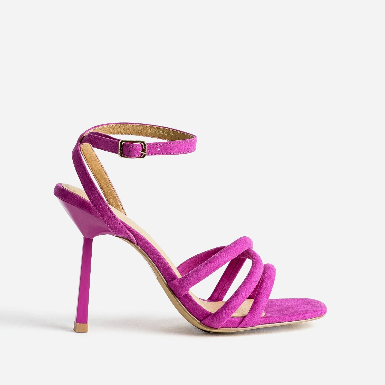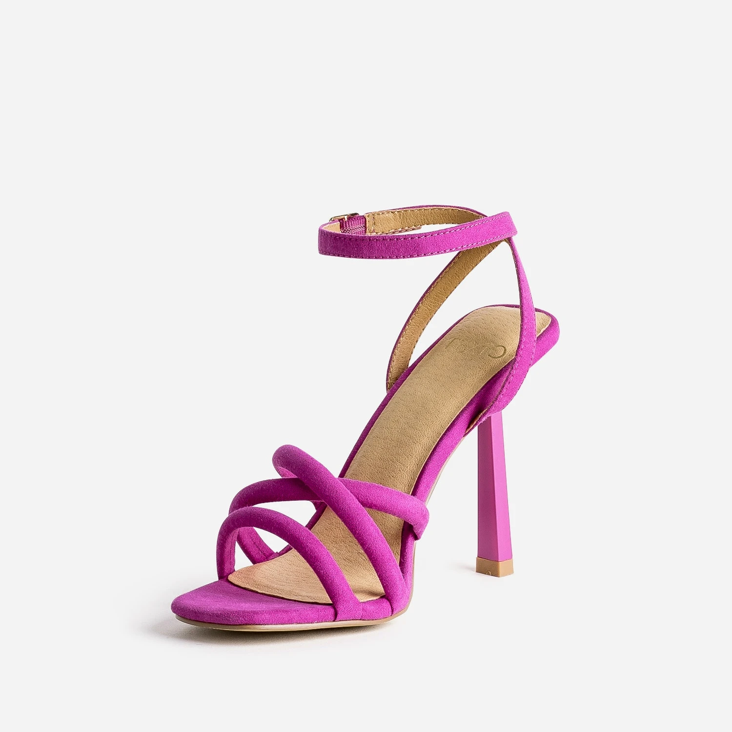 Les fans de talons ne vont pas être déçues ! Cette sandale femme fait clairement le show : textile rose fuchsia, talon fin et verni de 10 cm, brides arrondies sur bout carré. Réservez-la avec une tenue waouh, comme une robe bustier, ou décalez-la avec une robe portefeuille à imprimé fleurs d’été.