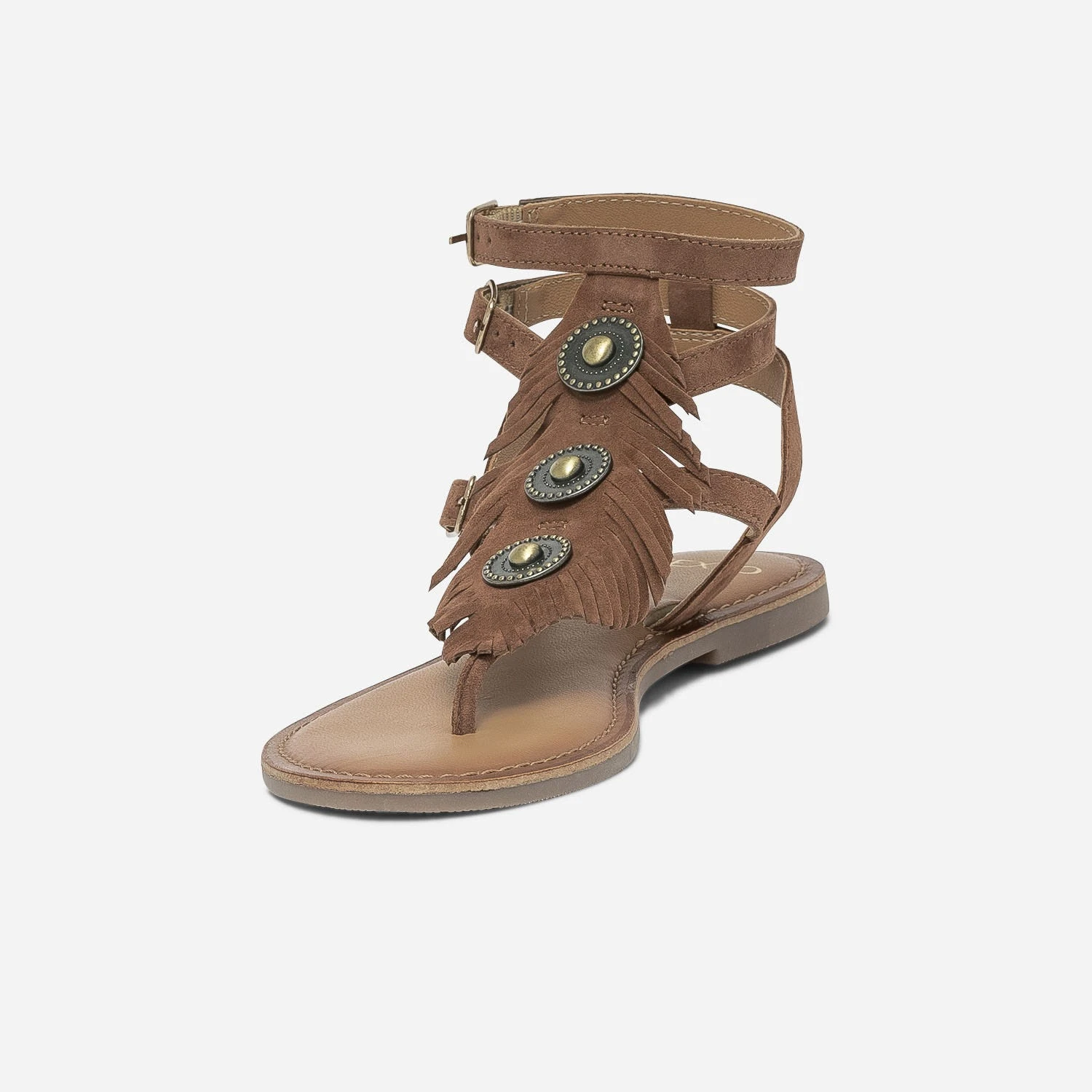 L’allure folk dans toute sa beauté ! Plume et médailles en métal décorent le dessus du pied de cette sandale-tong pour femme. En cuir velours marron, elle présente 3 fines brides autour de la cheville, fermées par boucles. Un modèle plat, à privilégier avec des teintes naturelles, du blanc au camel en passant par le beige, et rehaussées, pourquoi pas, d’une touche de bleu turquoise.