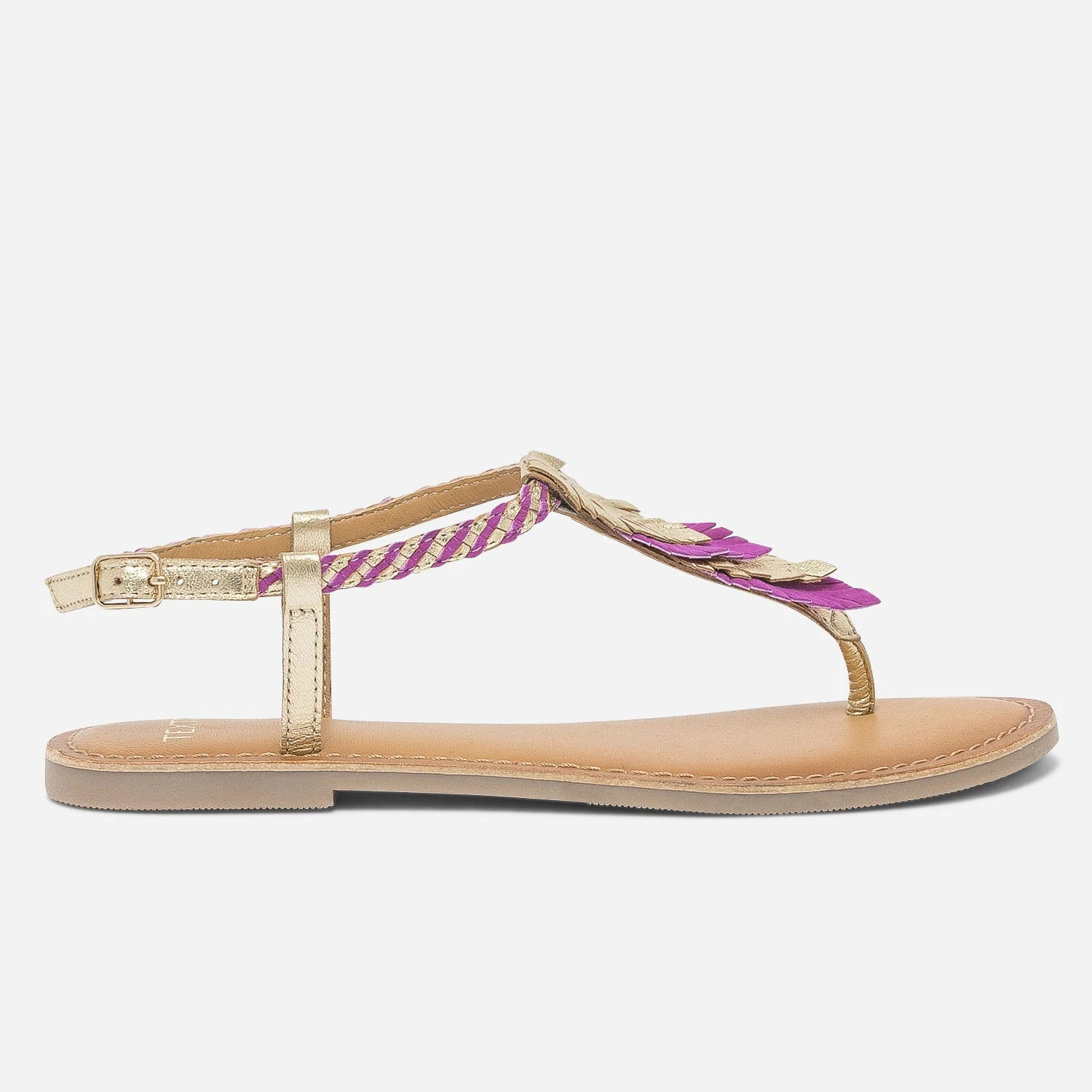 Ethnique et colorée, cette sandale femme adopte une forme tong qui met en valeur la finesse du pied. Cuir velours violine et cuir lisse doré se mélange dans une belle harmonie, autour de la cheville, sur une fine bride tressée, sous forme de plumes délicates, sur le dessus du pied. Un modèle à oser avec une robe longue violine ou parme ou bien dans les tons verts.