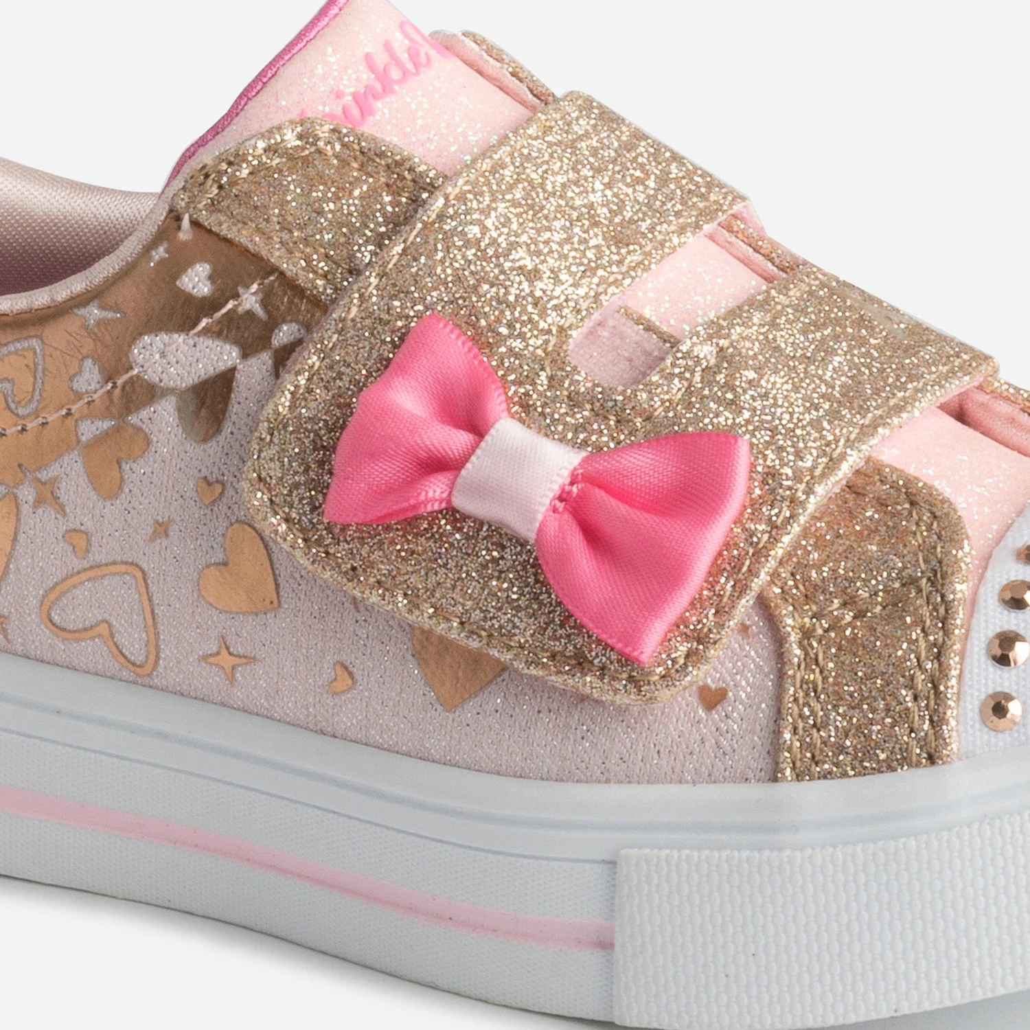 Cette tennis pour fille cumule tous leurs vœux : des couleurs girly, des détails qui brillent et des dessins d’amour. Confectionnée en toile rose irisé, elle présente une languette rose pailletée, une doublure rose satinée et se ferme par un double scratch doré pailleté, finalisé par un nœud rose. Sur le côté, cœurs et étoiles s’invitent en décor cuivré. Le bout est décoré de strass avec une led intégrée qui peut clignoter.