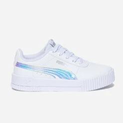 Inspirée par la côte Ouest des Etats-Unis, la tennis Carina de PUMA bouscule les codes de l’univers du sport. Déclinée en synthétique lisse blanc, elle se démarque par quelques perforations sur le dessus et une semelle rainurée légèrement plateforme. Elle est soulignée de lignes identitaires iridescentes. La semelle intérieure à technologie ‘Softfoam’ assure un confort optimal. Un modèle pour fille à porter au quotidien, qu’elle soit sportive ou pas !