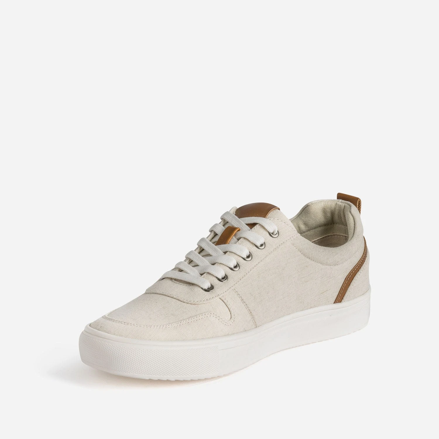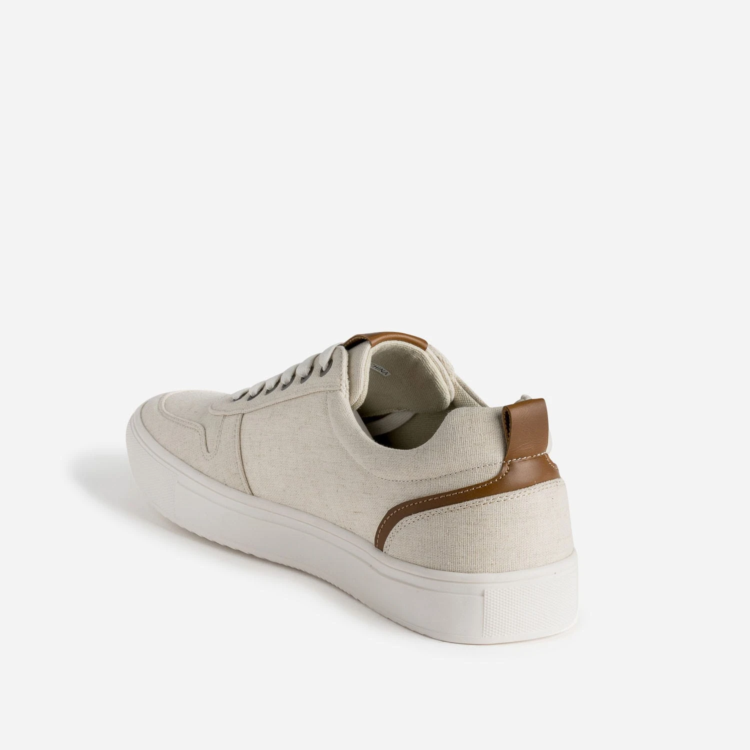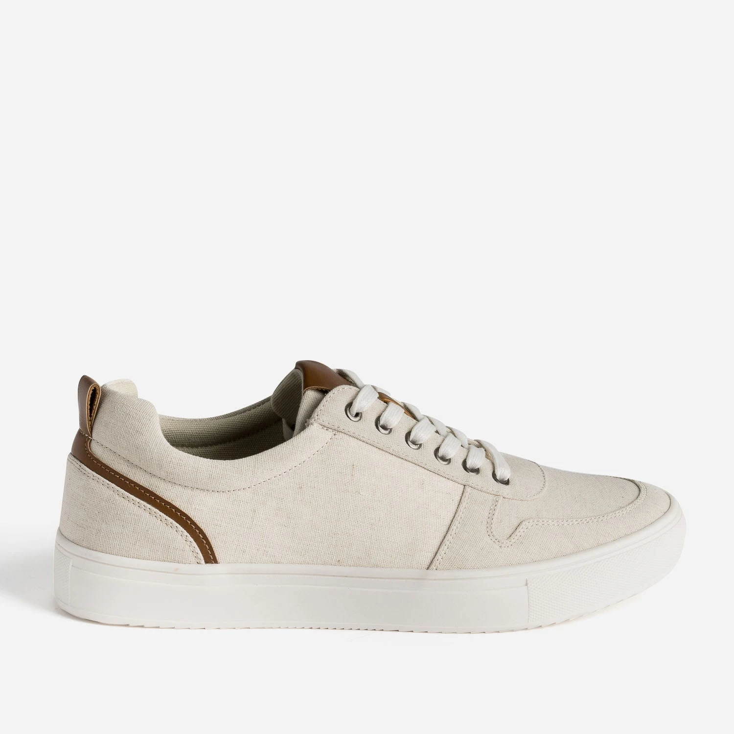 L’été revient. Et avec lui, la tennis en toile. Beige chiné, elle est rythmée de touches en matière synthétique camel sur la languette et le contrefort, de découpes sur le dessus du pied, et se ferme par un lacet plat. Essayez-la avec un camaïeu de tons naturels, du blanc au marron.
