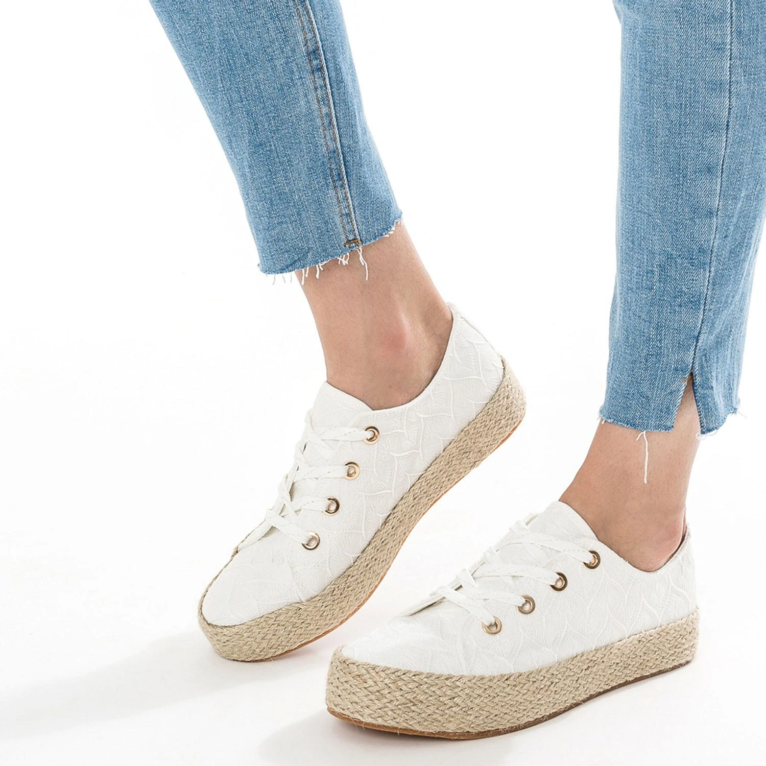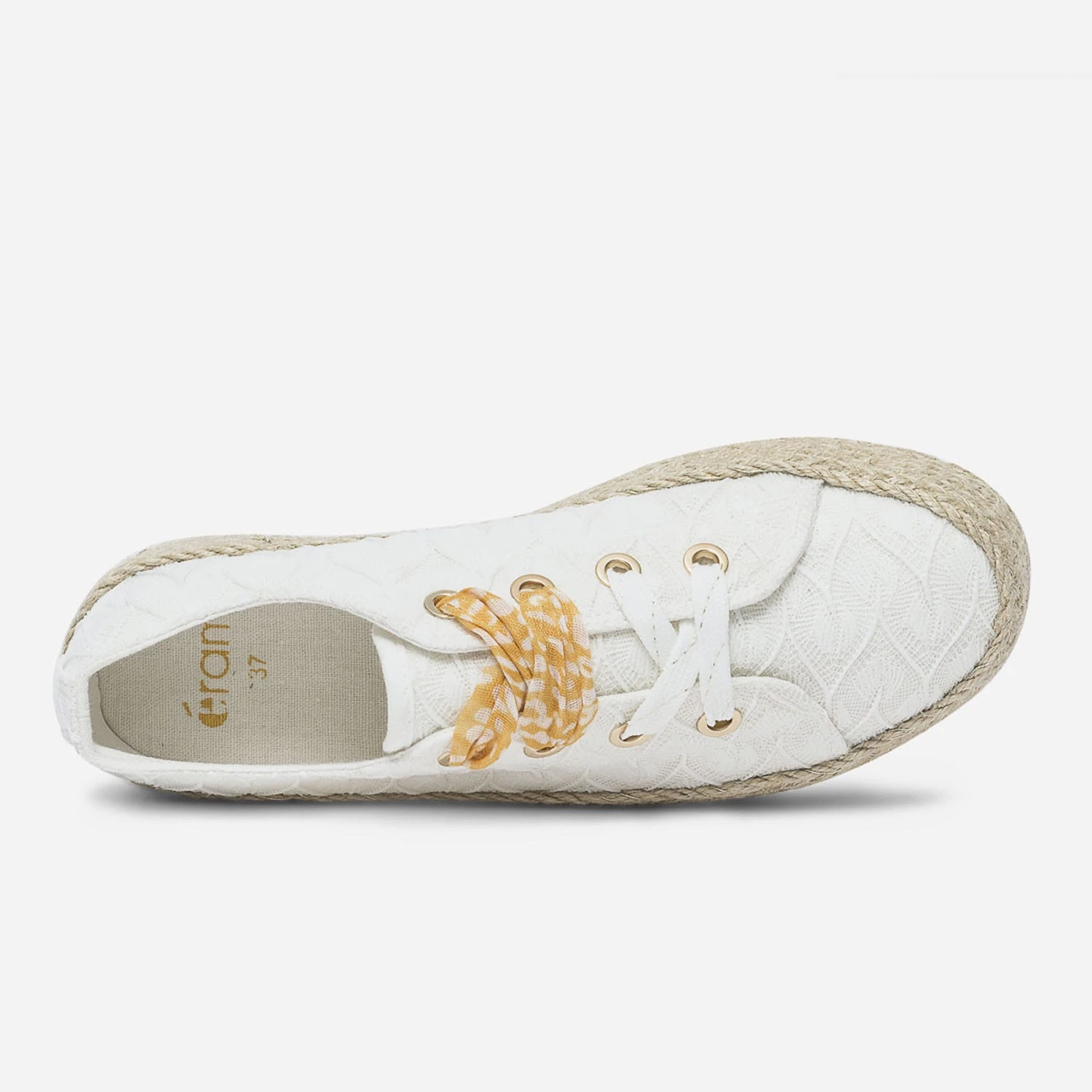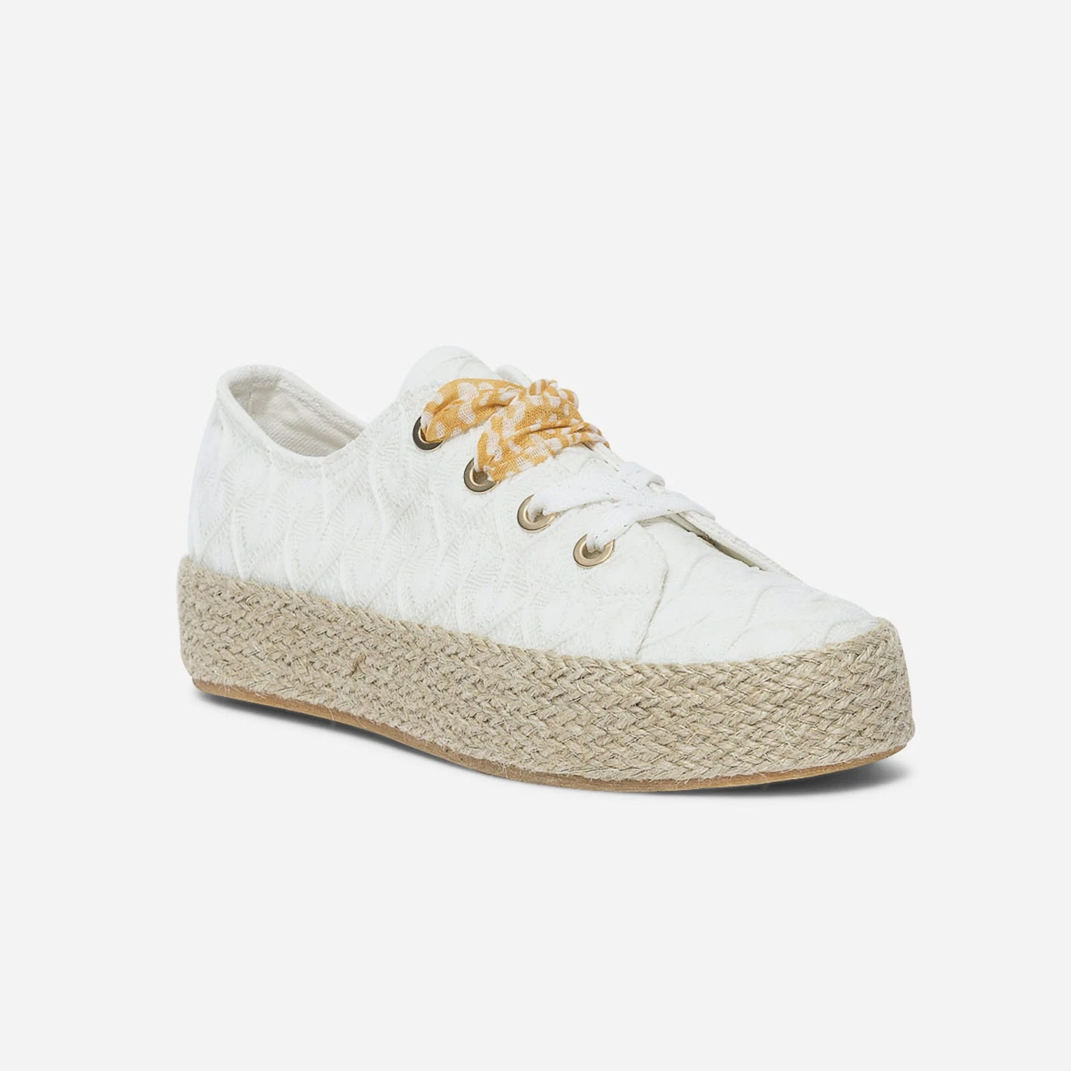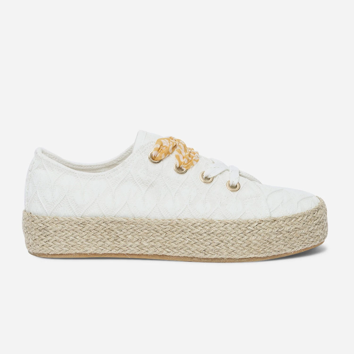 Mi-tennis mi-espadrille, cette sneakers s’invite dans votre shoesing d’été. En textile blanc, elle est sublimée par un effet dentelle délicat. Elle est montée sur une semelle à plateforme de 3 cm recouverte de corde et de fils dorés. Sa particularité : elle est livrée avec deux lacets, l’un blanc et or, et l’autre façon ruban orangé à imprimé tachiste. Un modèle à porter au quotidien, avec un pantalon chino camel et un débardeur blanc.