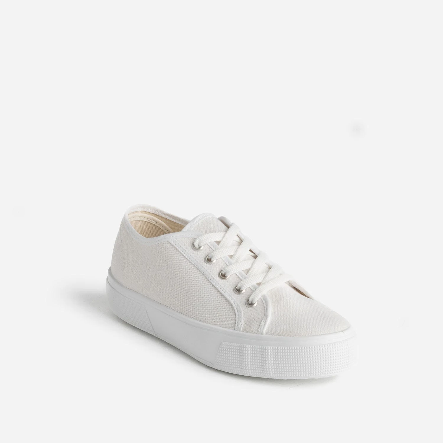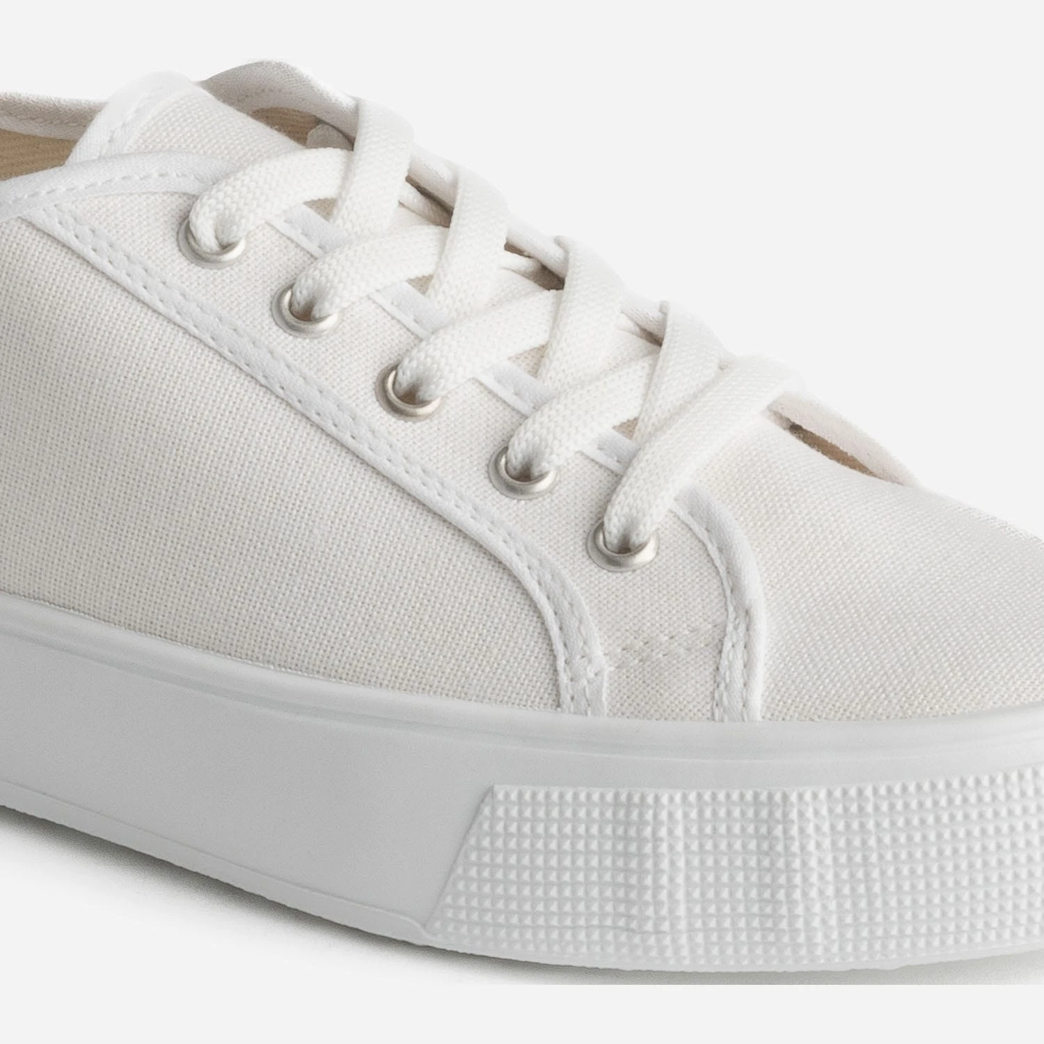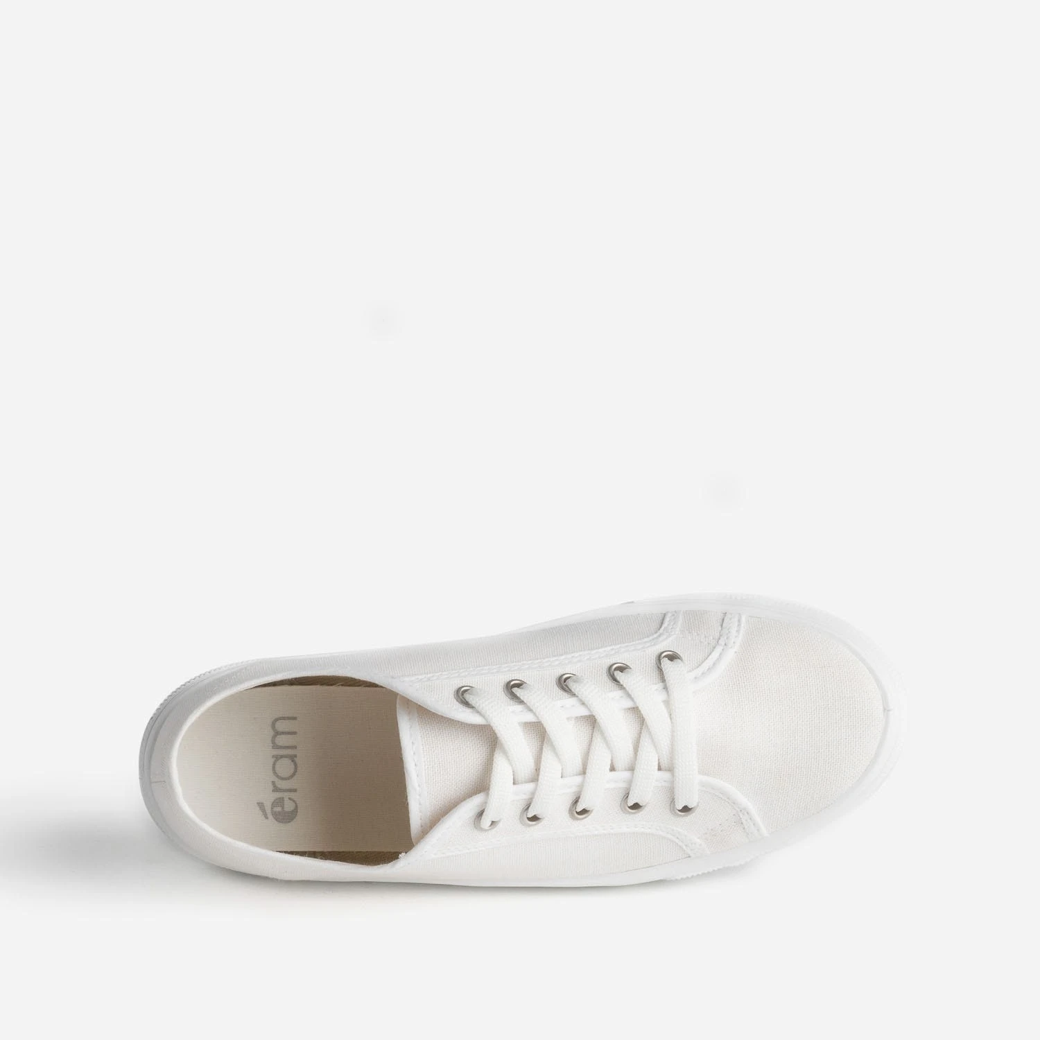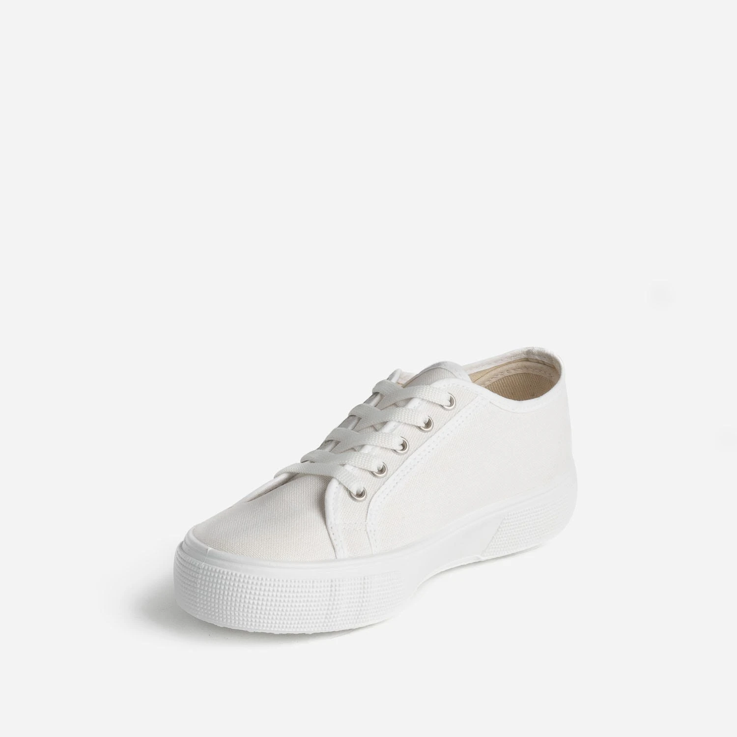 Classique parmi les classiques, la tennis en toile est une pièce phare du shoesing d’entre saison. En 100% coton blanc et non doublée, elle est montée sur une semelle en matière synthétique, légèrement plateforme. Elle se ferme par un lacet plat ton sur ton. Un modèle très facile à porter, avec une marinière et un pantalon bleu marine à pont, pour un look tendance et décontracté.