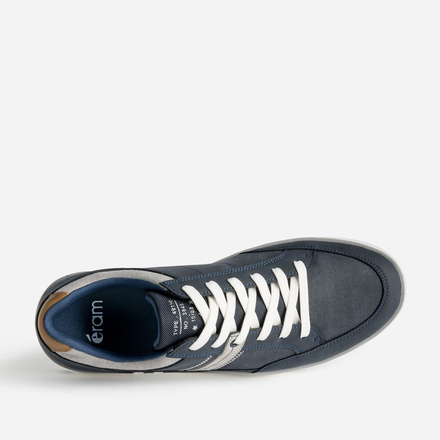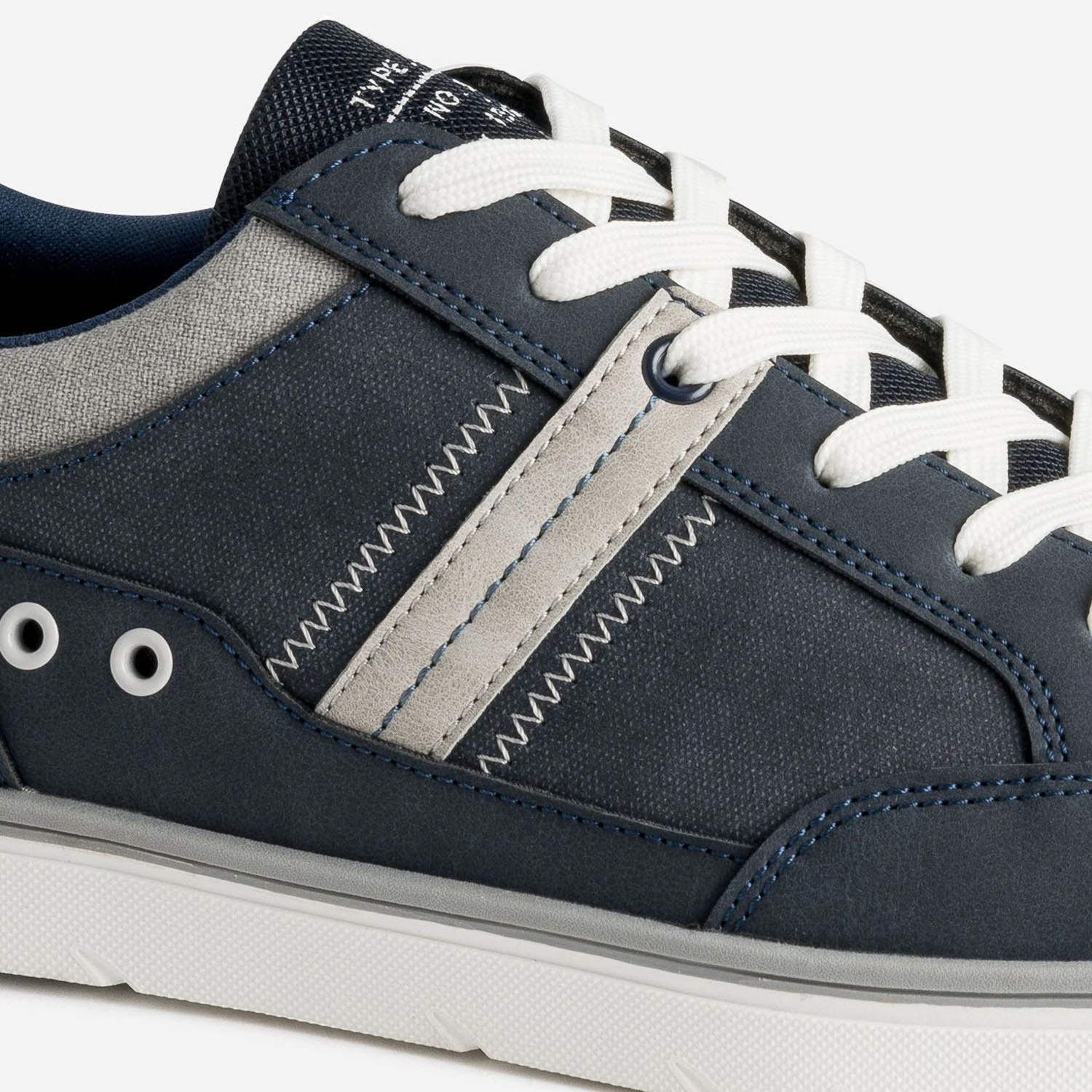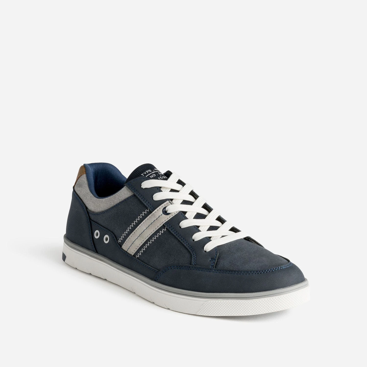 Matières synthétiques marine lisses, unies et légèrement chinées, détails gris sur le côté et le col de la tige, œillets blancs décoratifs sur le côté, assortis au lacet et à la semelle. La tennis homme mise sur une harmonisation réussie, pour se porter avec toutes vos envies.