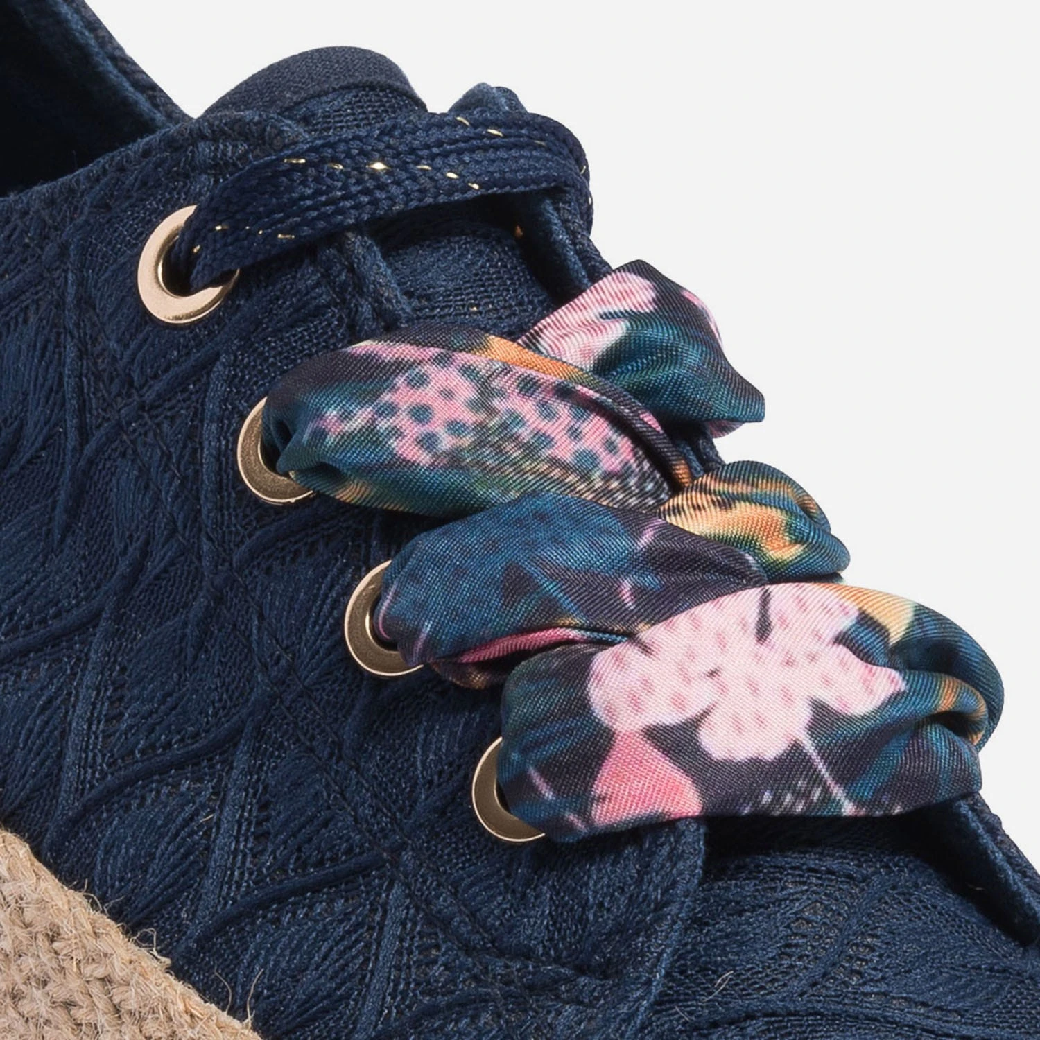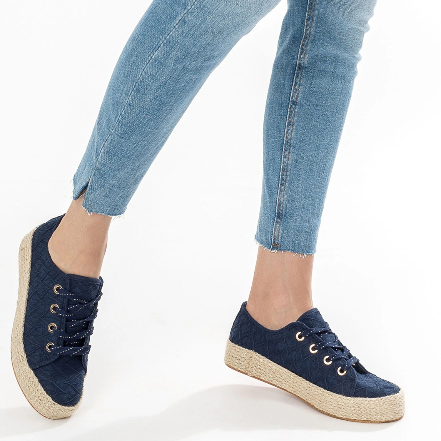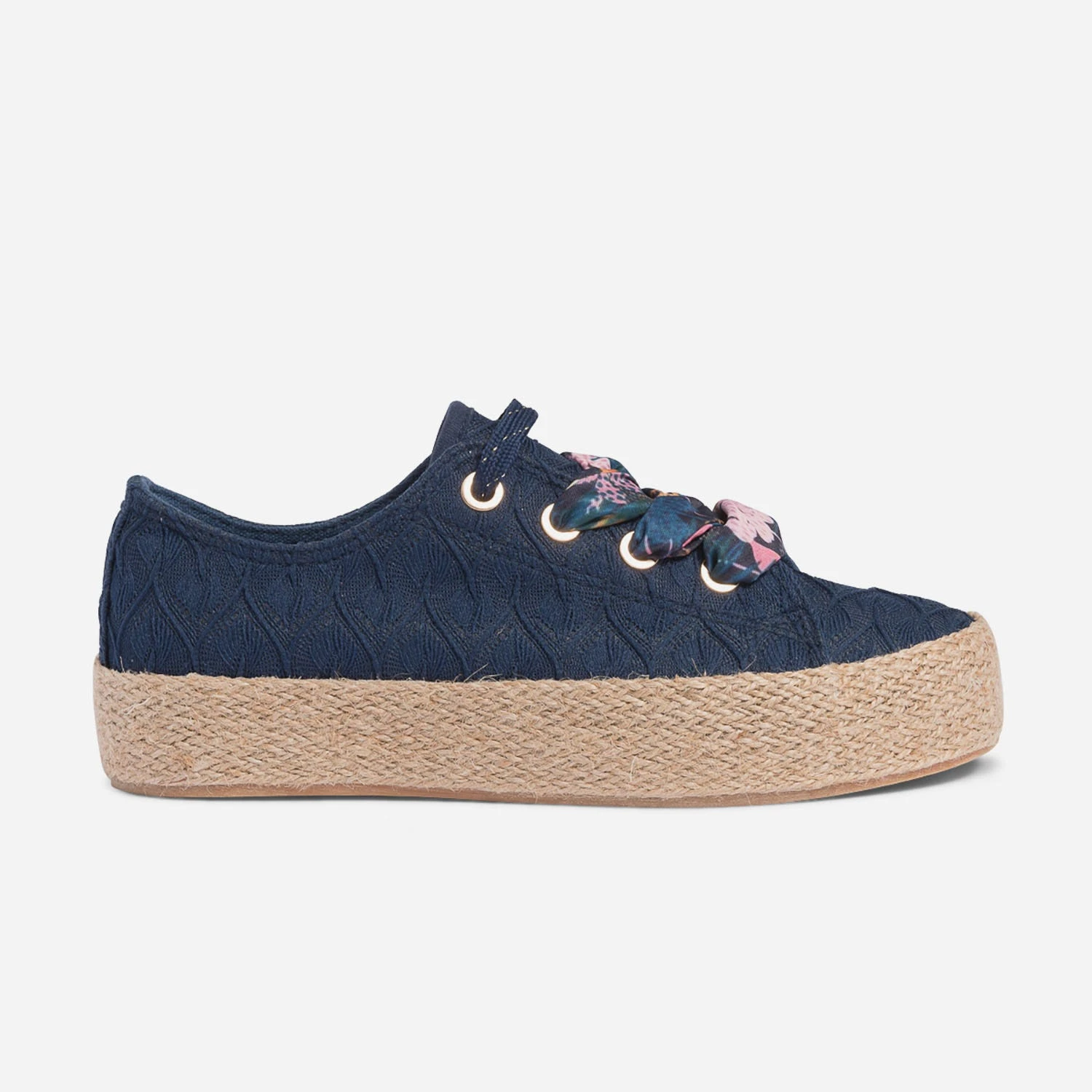 Mi-tennis, mi-espadrille, cette sneakers s’invite dans votre shoesing d’été. En textile bleu marine, elle se démarque par un jeu de broderies ton sur ton. Elle est montée sur une semelle à plateforme de 3 cm recouverte de corde naturelle. Sa particularité : elle est livrée avec deux paires de lacets, l’un marine avec fil doré, et l’autre façon foulard, rythmé d’un imprimé tropical. Portez-la au quotidien avec un jean boyfriend de couleur et un sweat à message.