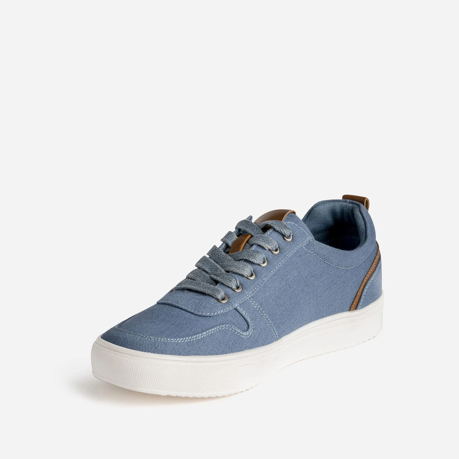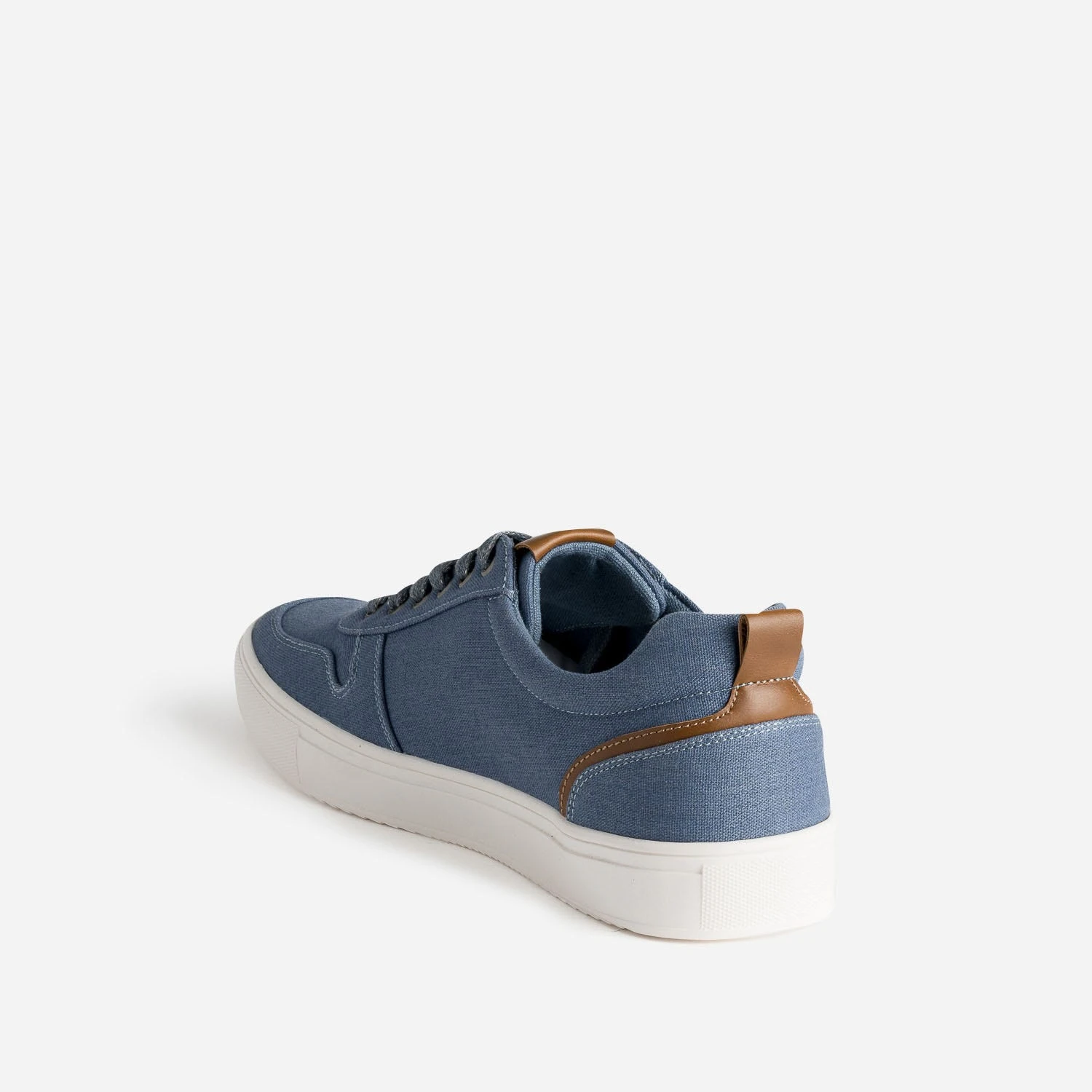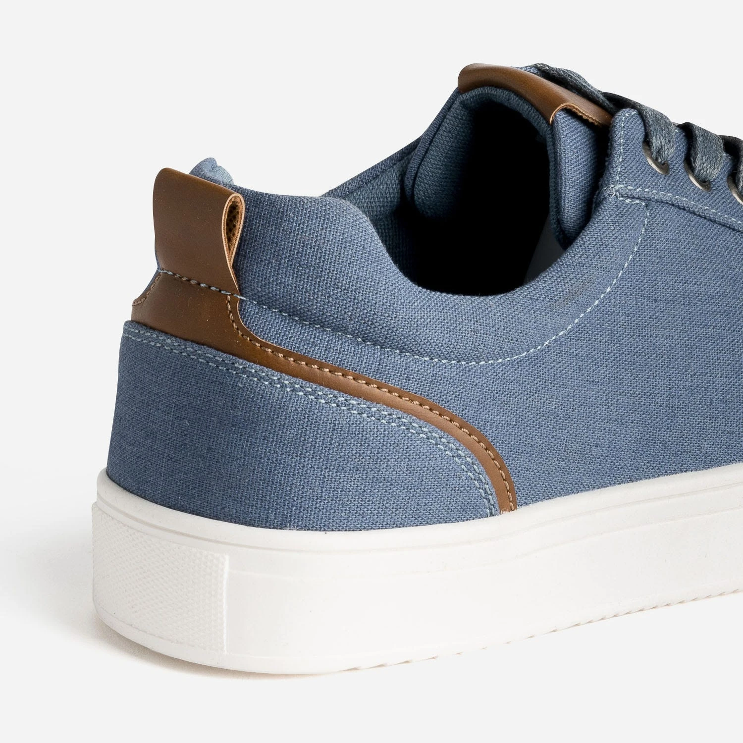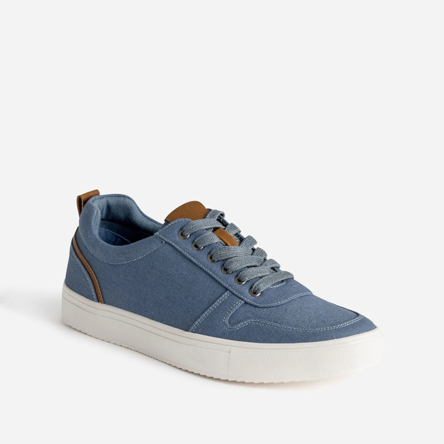L’été revient. Et avec lui, la tennis en toile. Bleu moyen, elle est rythmée de touches en matière synthétique camel sur la languette et le contrefort, de découpes sur le dessus du pied, et se ferme par un lacet plat. Essayez-la avec un camaïeu de bleu, du ciel au marine.