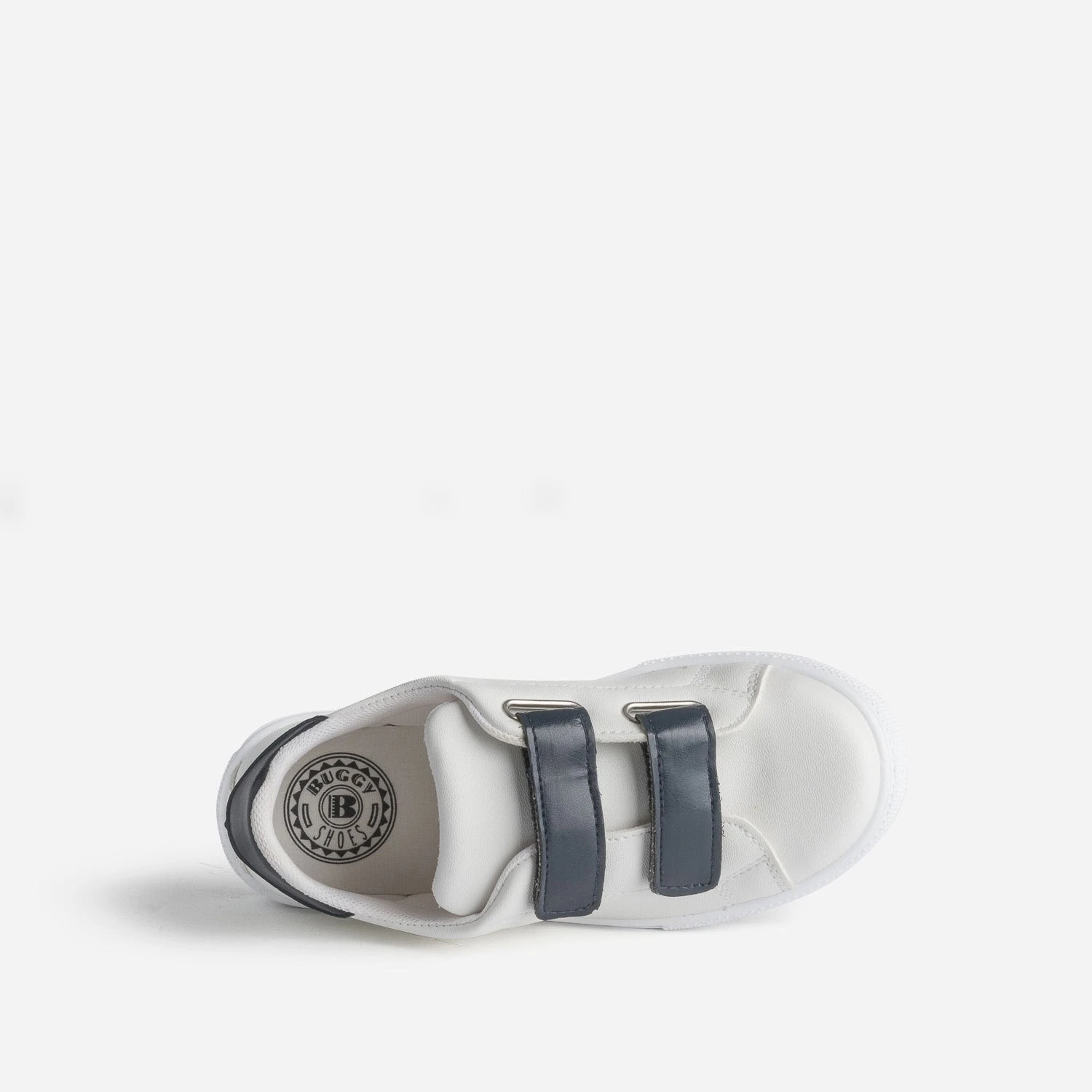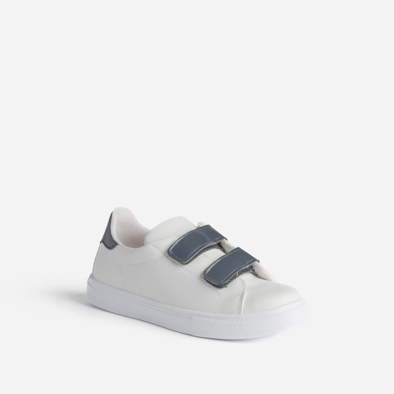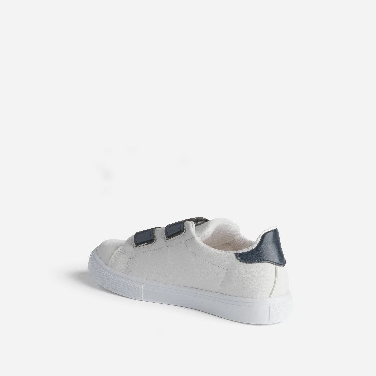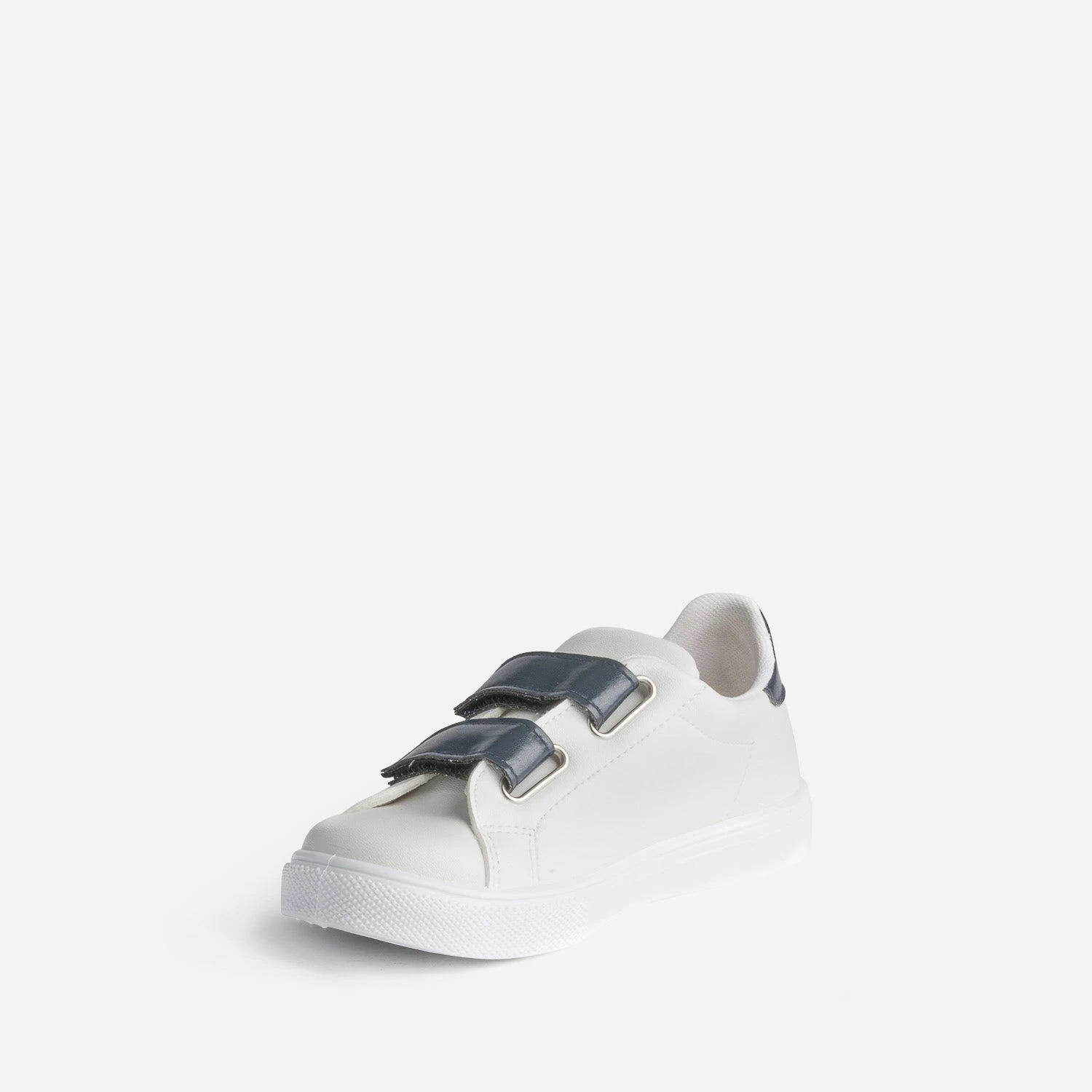 Matière synthétique lisse blanche, double scratchs marine, en écho au contrefort, la nouvelle tennis prône un retour à la simplicité. Un modèle mixte, facile à associer avec toute sa garde-robe.