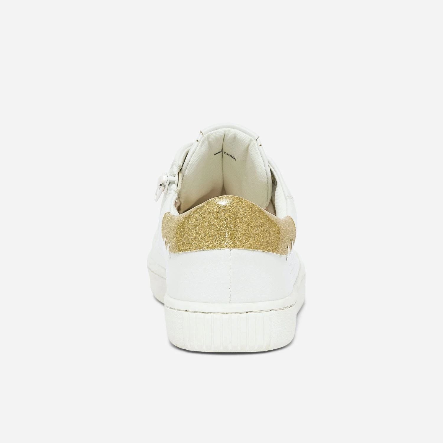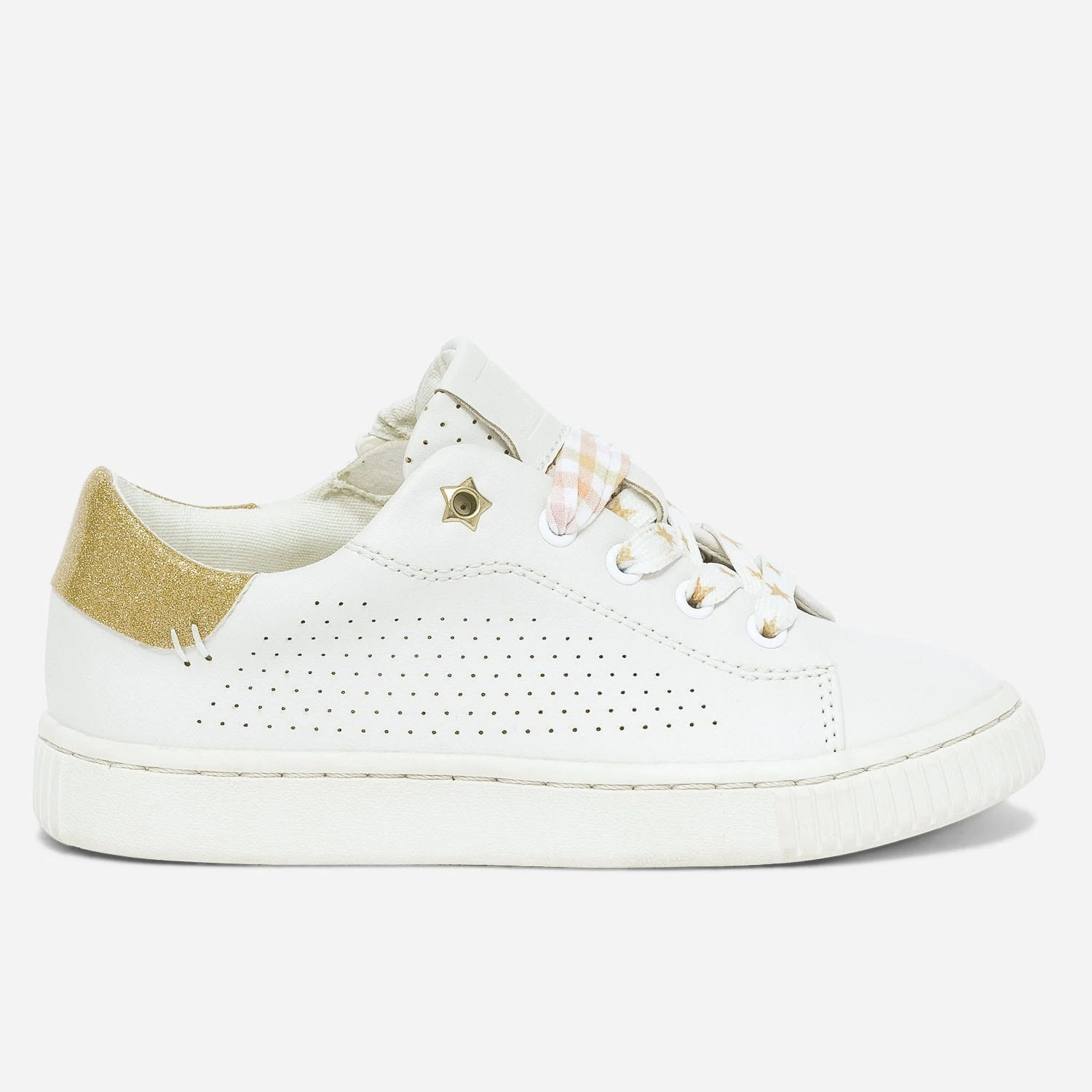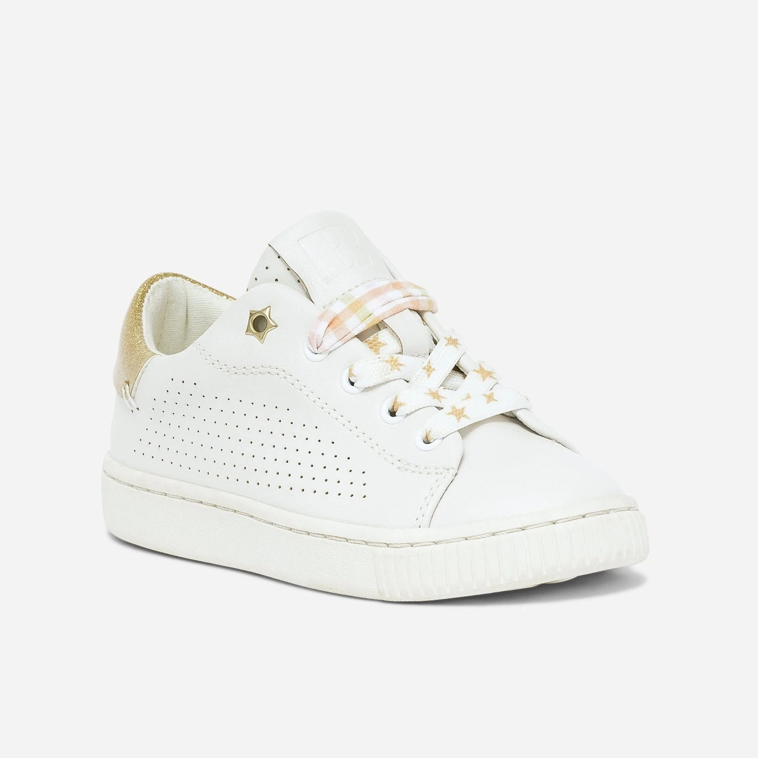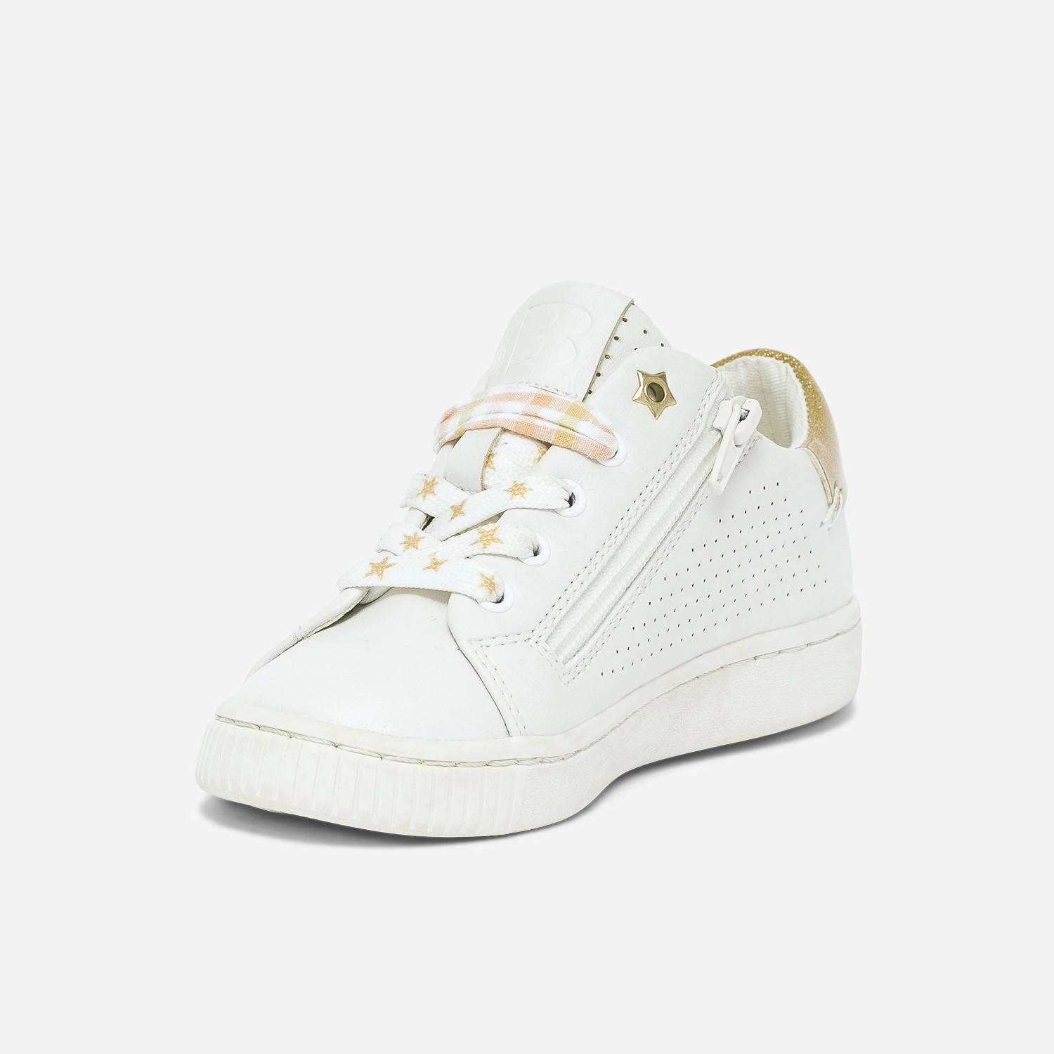 Le printemps annonce des journées plus longues et plus lumineuses. Le shoesing des filles s’adapte avec cette nouvelle tennis. La tige synthétique blanche se laisse bousculer de perforations régulières sur les côtés et d’un contrefort pailleté doré. Elle se ferme par un lacet, à choisir blanc à imprimé étoiles ou façon ruban à carreaux vichy pastel, renforcé par un zip intérieur. Un modèle qu’elle n’est pas prête de quitter !