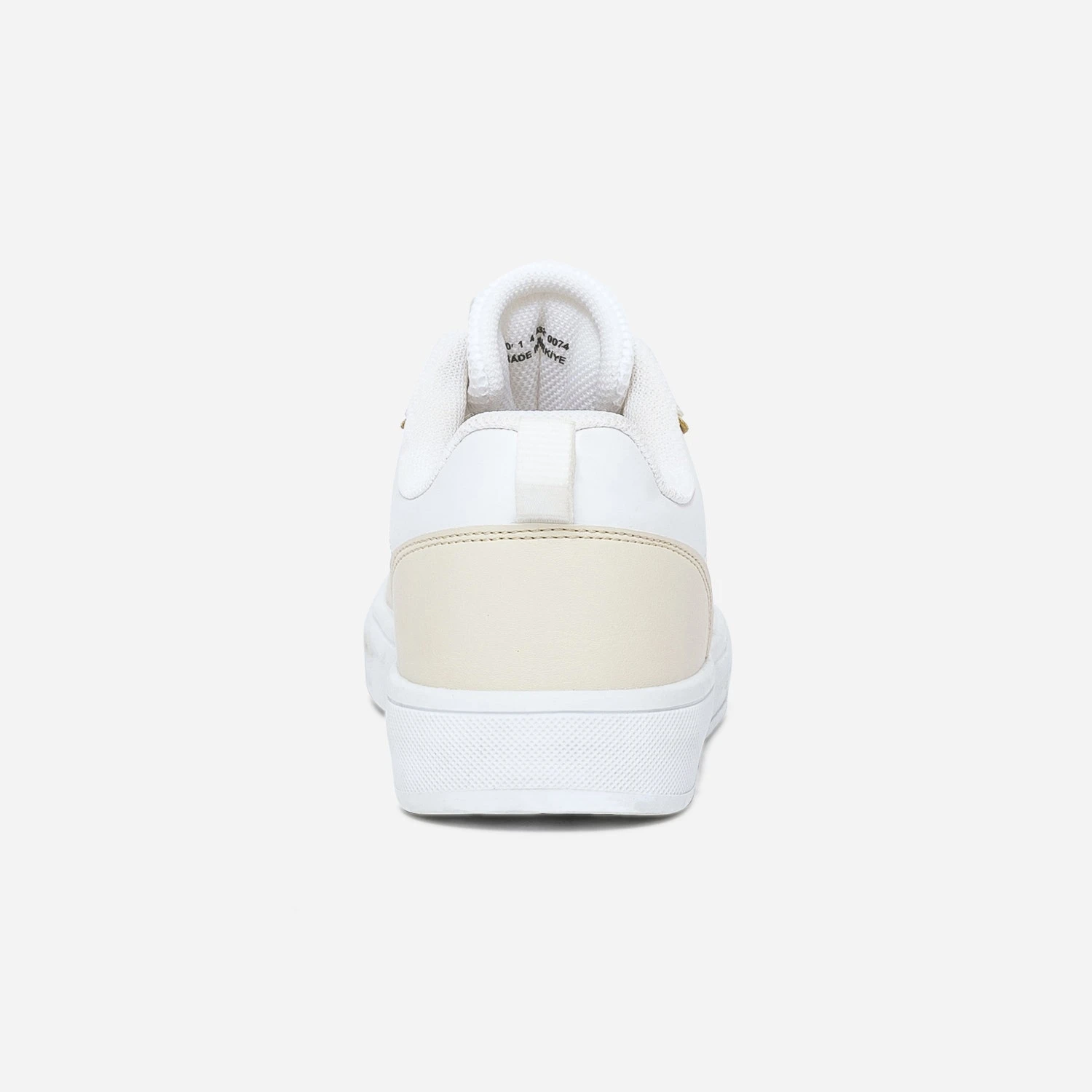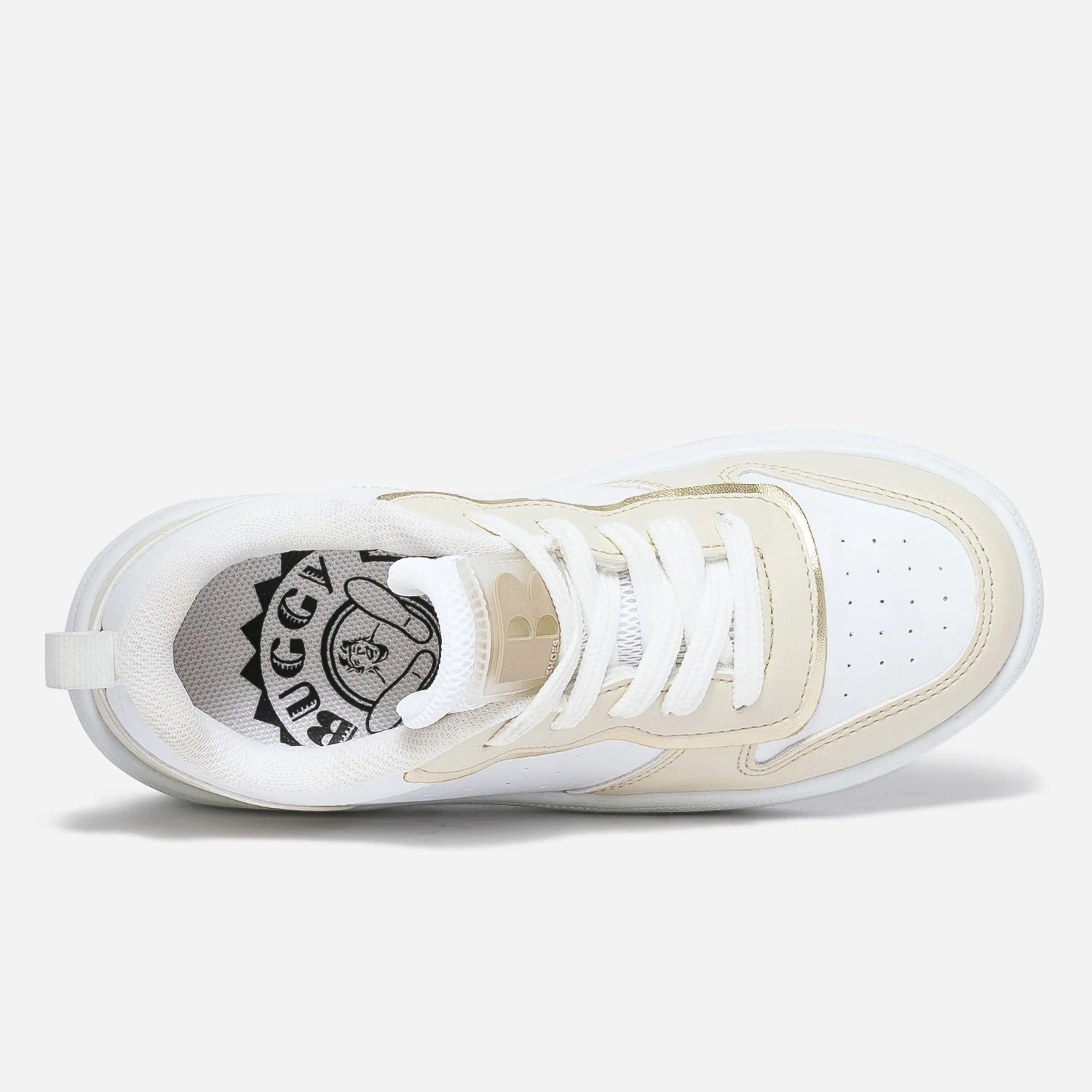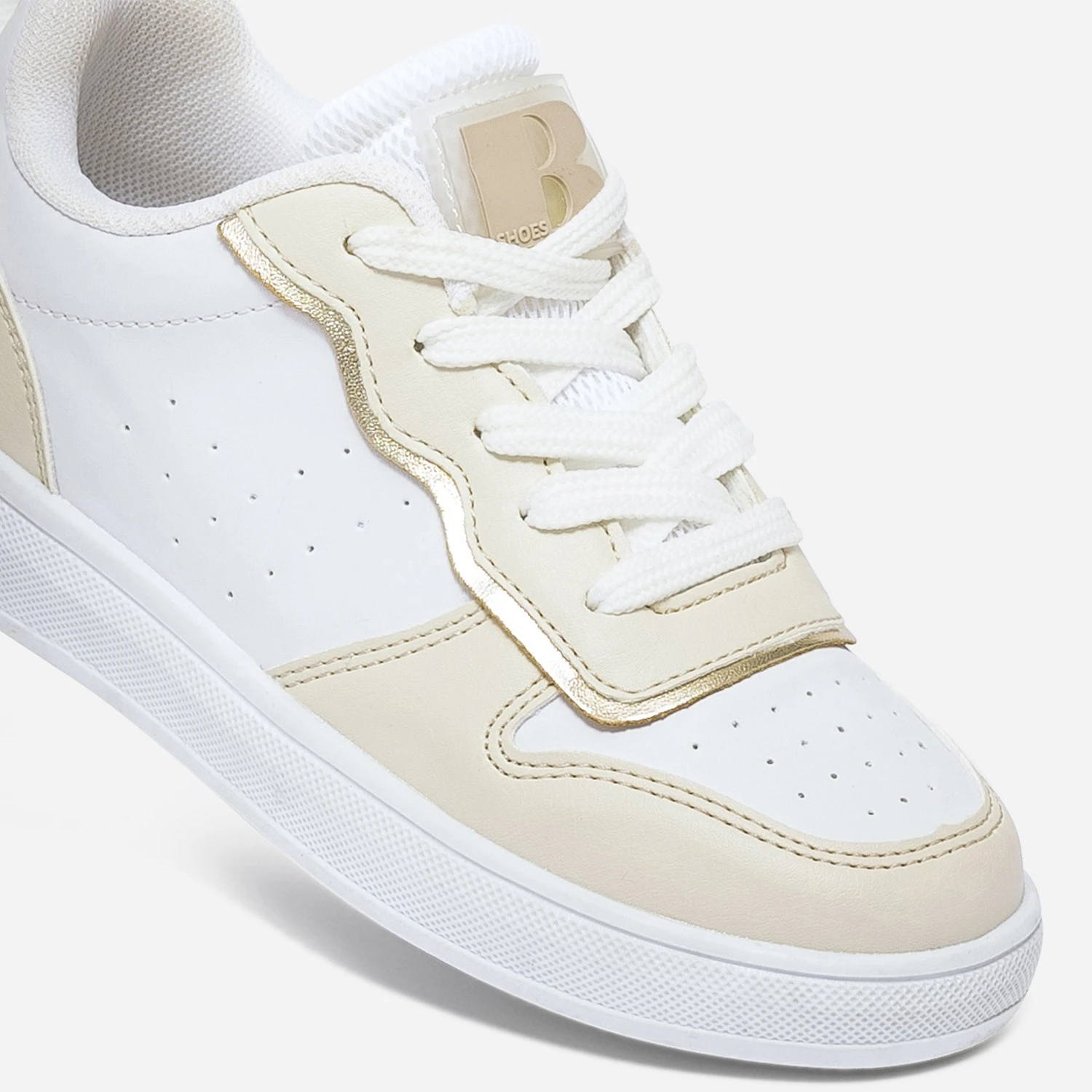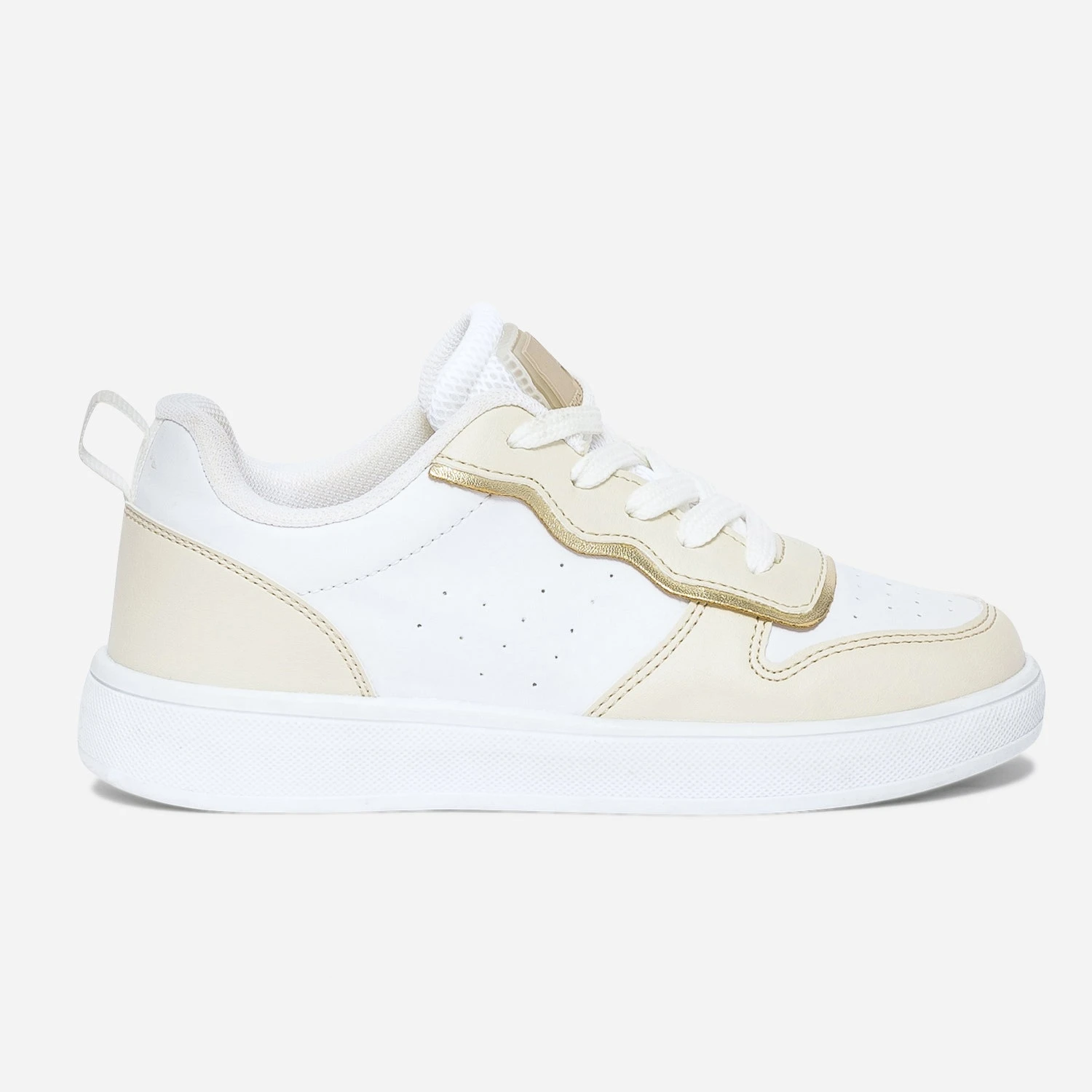 Celle qu’elle ne voudra bientôt plus quitter : la nouvelle tennis de la rentrée. En matière synthétique, elle marque son originalité par son duo de couleurs , blanc et beige, souligné d’une touche dorée, dans une harmonie parfaite. Sa fermeture par lacet permet un maintien du pied optimal. Un modèle qui s’accorde facilement avec les looks du quotidien, en jean bleu, en robe rose comme en chemise kaki.