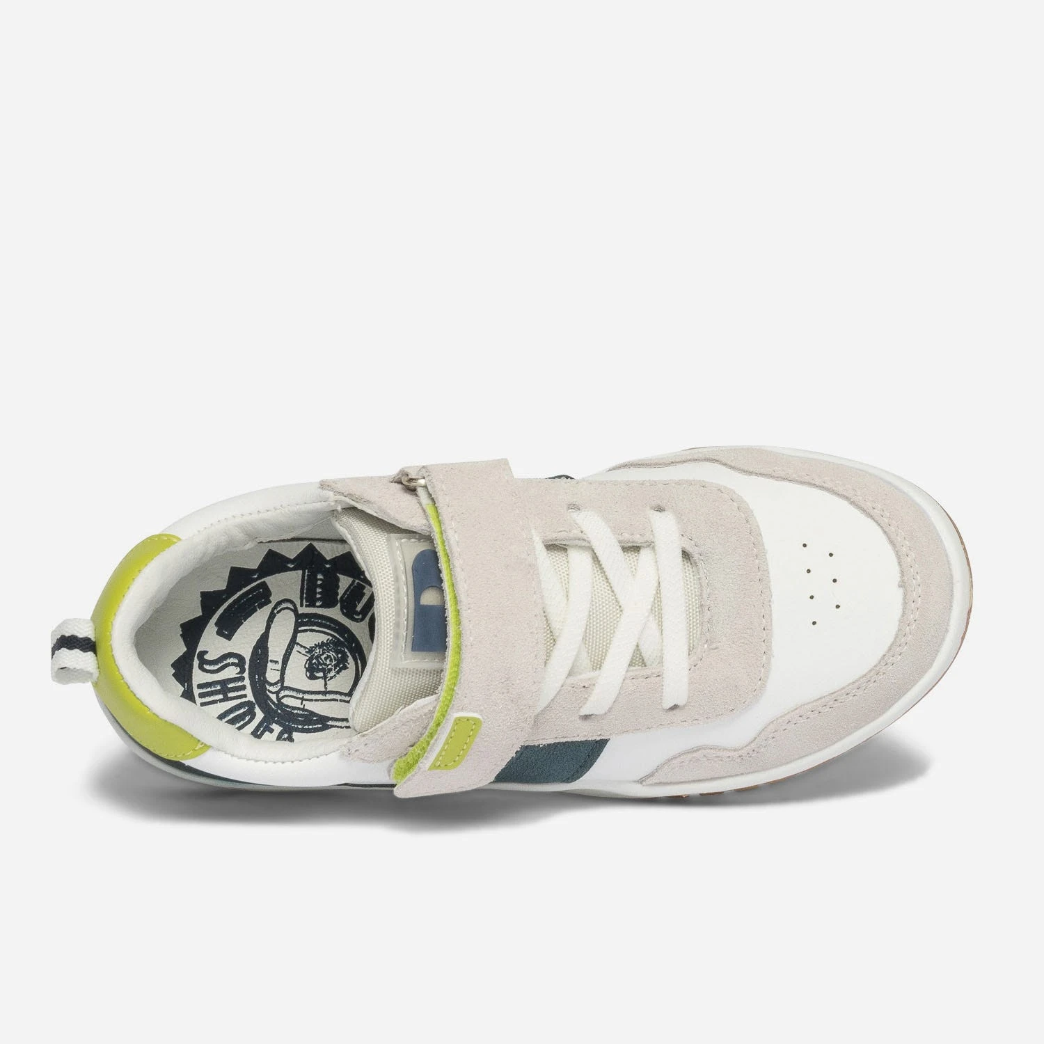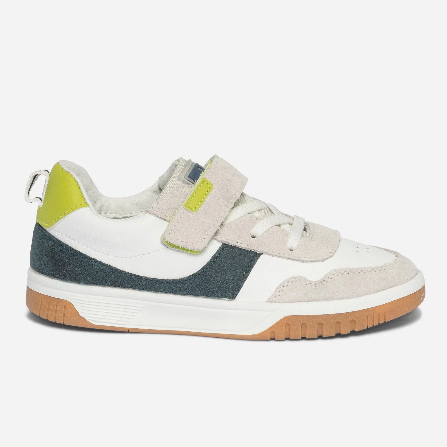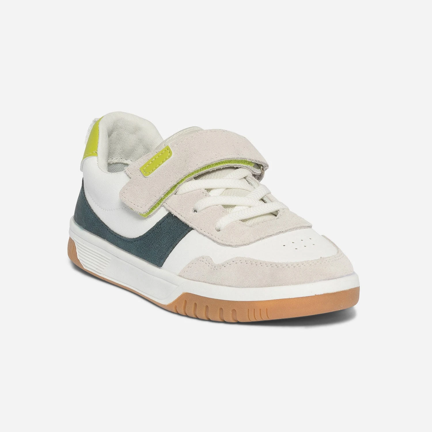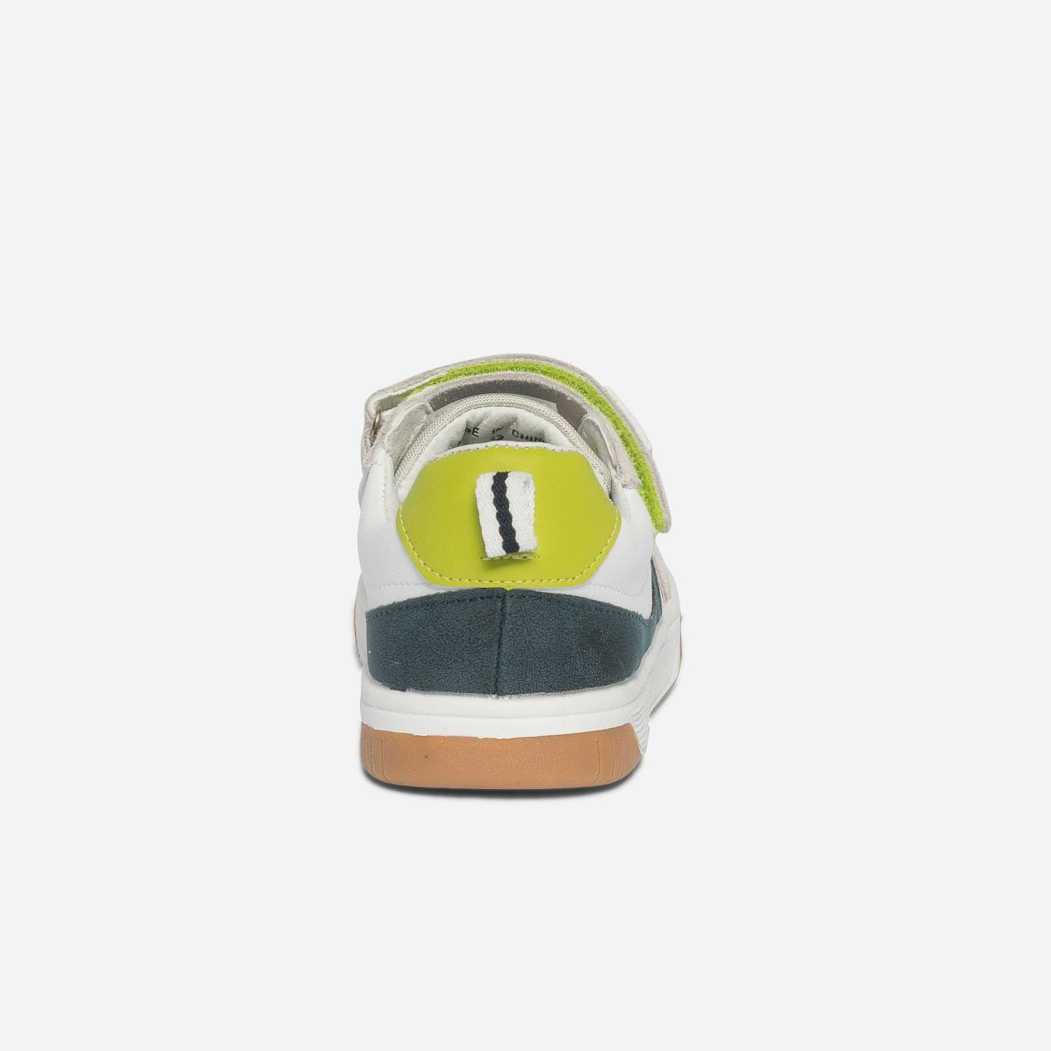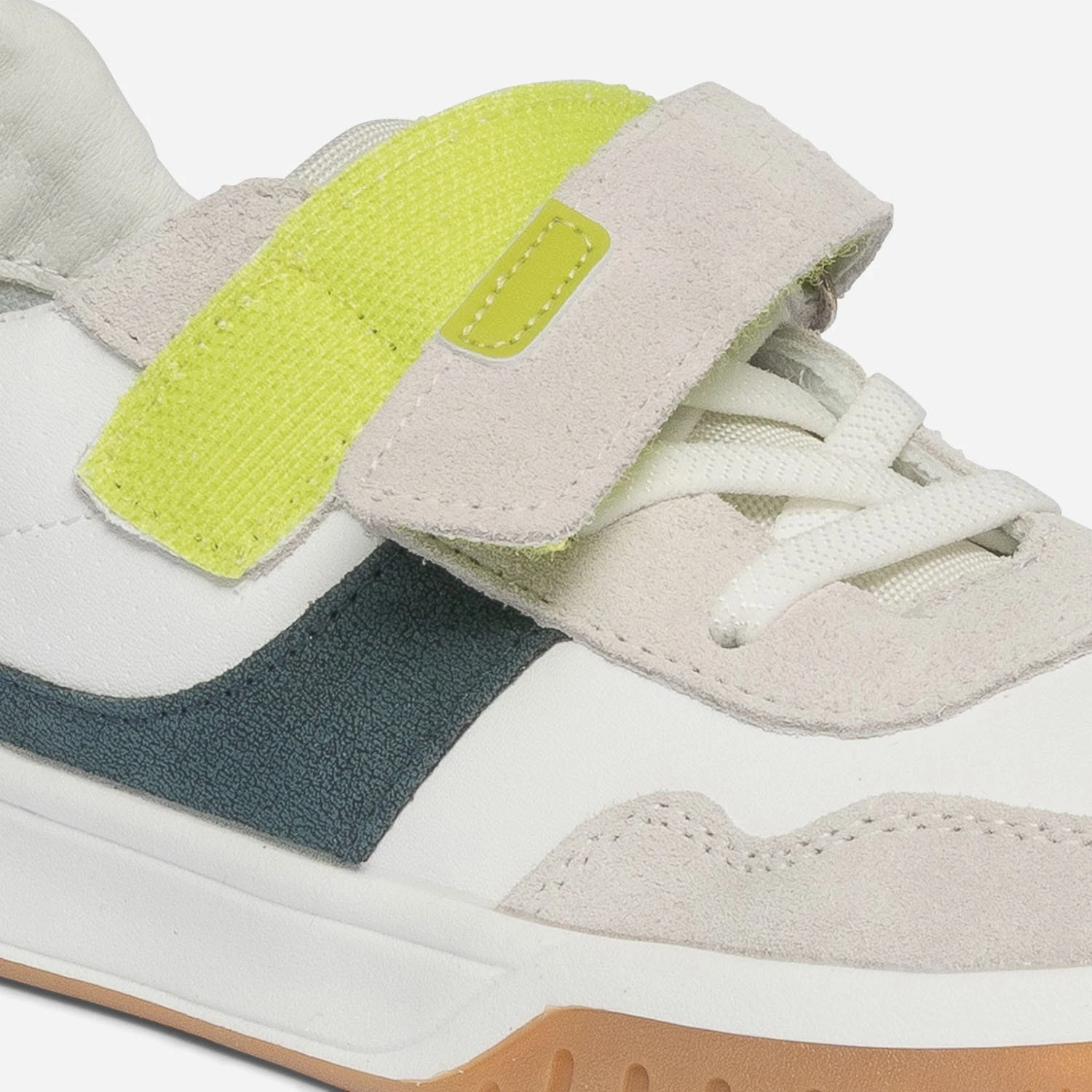 Cette tennis pour garçon mixe les couleurs et les matières dans une harmonie parfaite : synthétique blanc et cuir velours gris clair, répondent au vert fluo sur le scratch et le contrefort, et au bleu marine sur les côtés. Elle se ferme par un lacet élastiqué et un scratch. Un modèle pensé pour faciliter l’autonomie et ne pas perdre une minute de jeu !