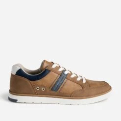 Matières synthétiques camel lisses, unies et légèrement chinées, détails bleu marine sur le côté et le col de la tige, œillets beige décoratifs sur le côté, lacet et semelle blancs. La tennis homme mise sur une harmonisation réussie, pour se porter avec toutes vos envies.