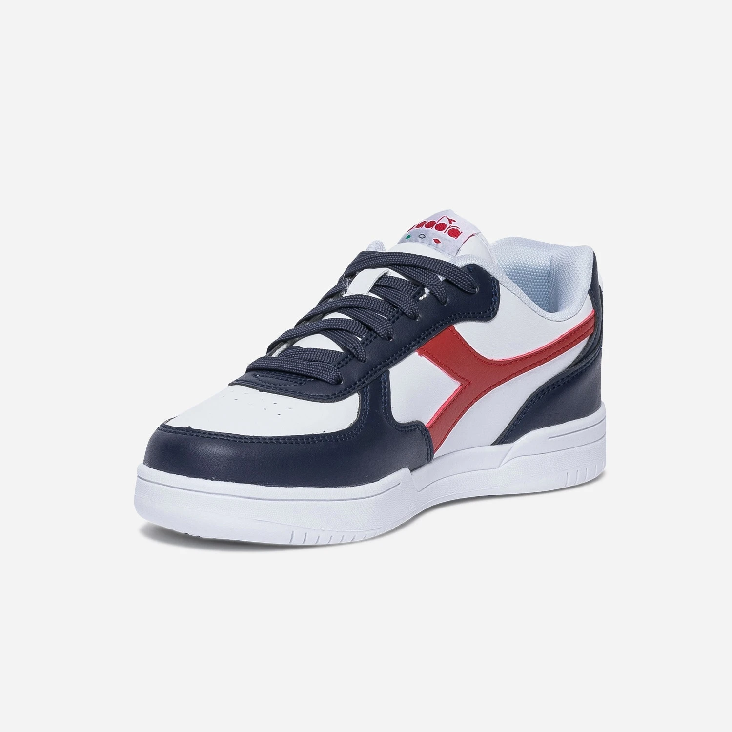 Cette tennis pour enfant présente une tige en matière synthétique blanche, rythmée de touches bleu marine et rouge. Elle se ferme par lacet bleu marine. Un modèle facile à porter au quotidien, avec un look sport ou plus branché.