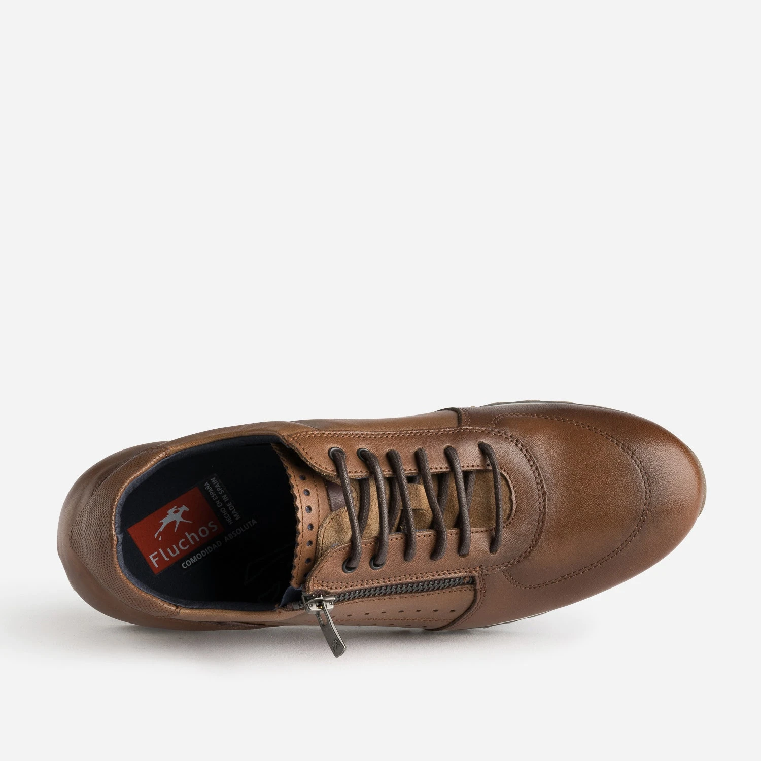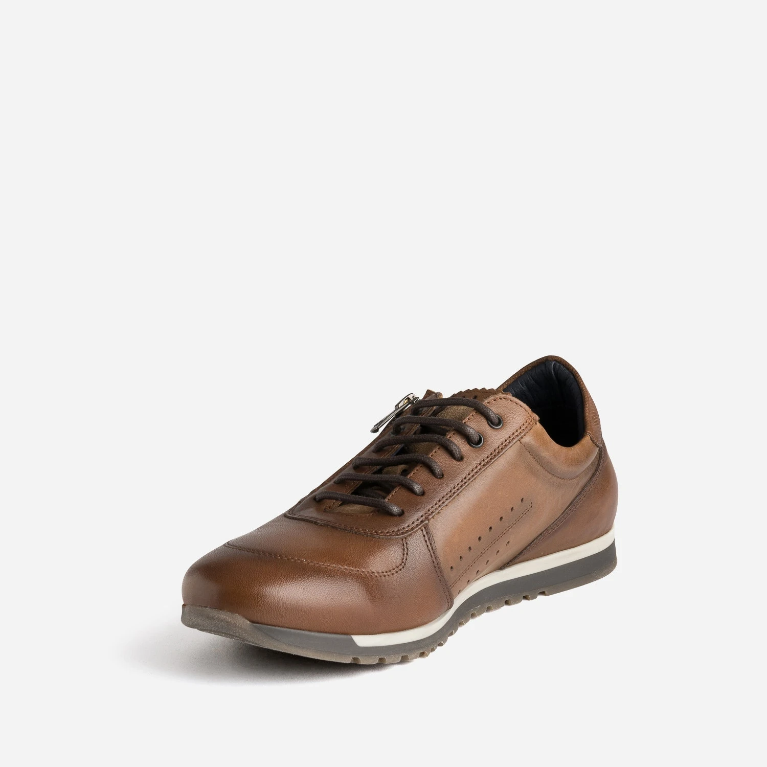 Cousues à la main de manière artisanale, cette tennis en cuir lisse marron se démarque par des découpes placées et des perforations sur les côtés. Elle se ferme par lacet et par un zip latéral complémentaire. Reconnue pour son confort incomparable, la semelle ‘Shock Absorber’ réduit les chocs et assure une adhérence parfaite.