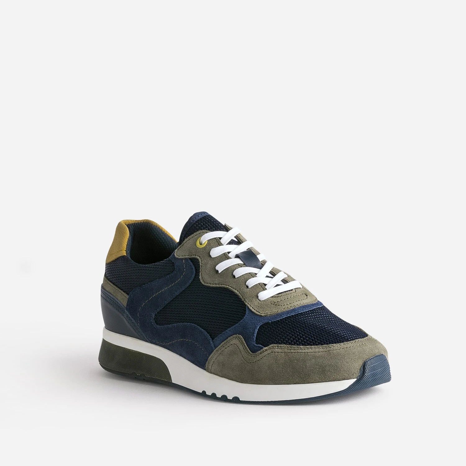 Cuir velours kaki, cuir velours et cuir lisse bleu marine, mesh bleu marine, cuir nubuck grainé jaune : cette tennis pour homme maîtrise parfaitement les associations de couleurs et de matières. Un esprit running à décomplexer avec un polo blanc et un pantalon battle kaki.