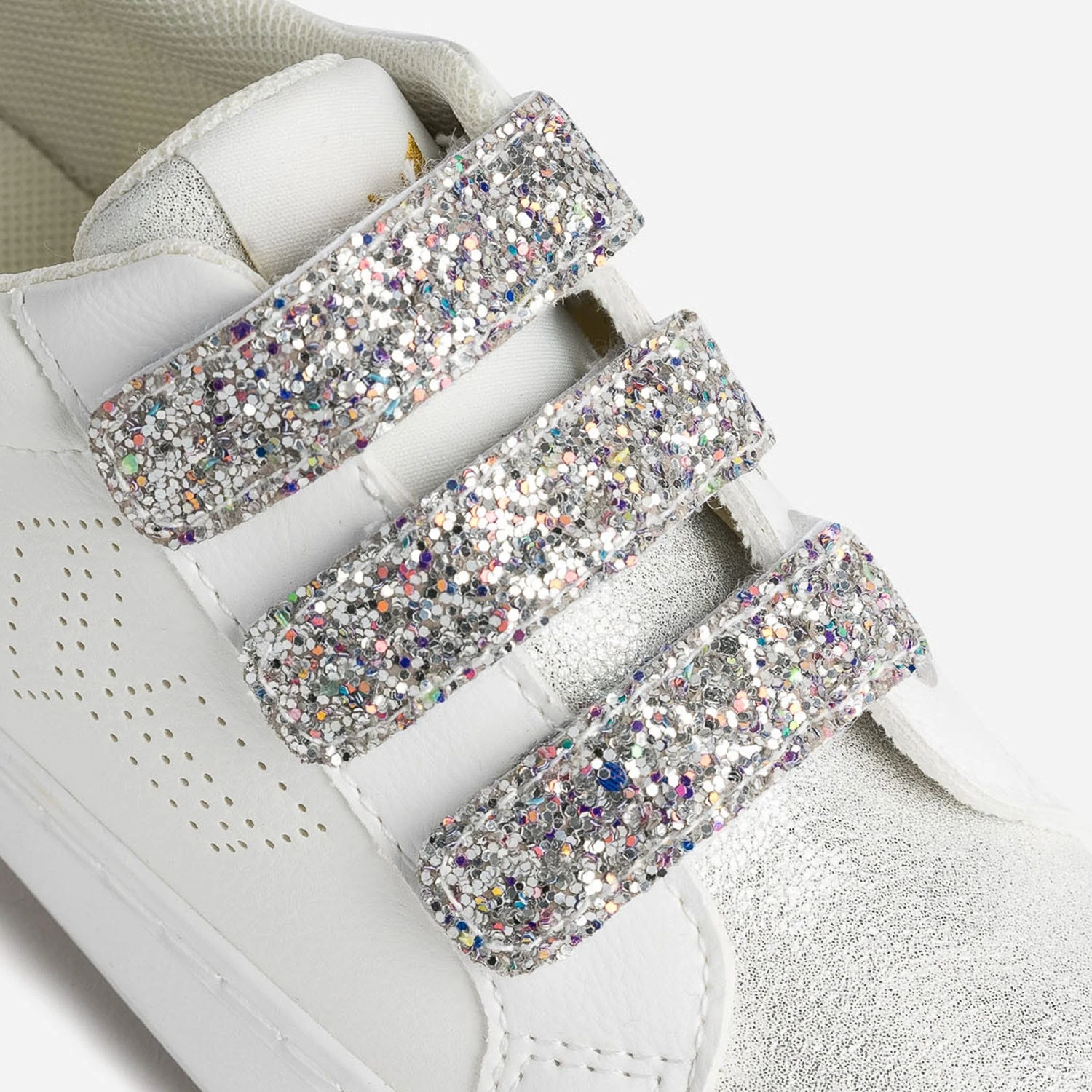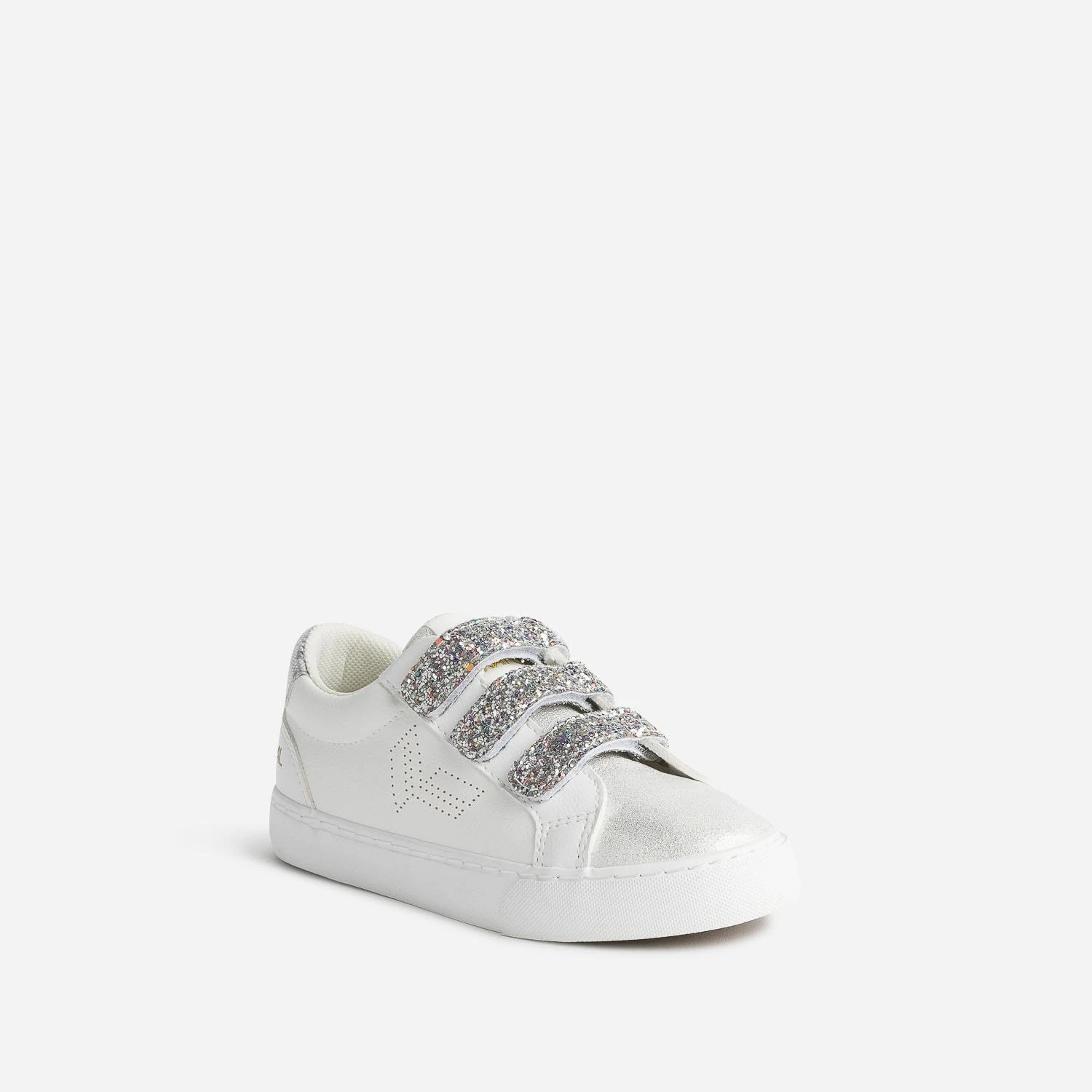 Impossible de résister à cette tennis pour fille. En matière synthétique blanche, elle se démarque par une languette gris argenté jusqu’au bout du pied, et par trois scratchs pailletés gris et rose, en guise de fermeture. La marque affiche ses logos, embossés sur le côté et imprimé sur le contrefort. Un modèle parfait pour l’intersaison.