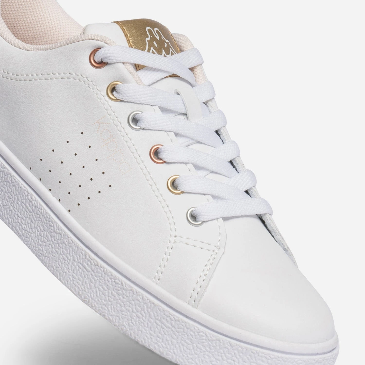Cette tennis pour junior fille mise sur l’intemporalité. Par son coloris blanc. Par son design simple. Par ses détails discrets et néanmoins chics, comme les touches de doré, argenté et rose cuivré sur les œillets, la languette et le contrefort. Un modèle parfait pour le quotidien.