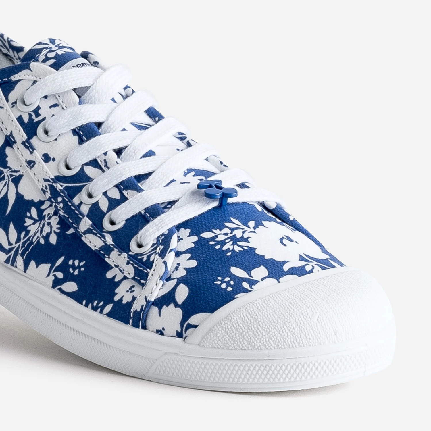 Cette tennis est un classique de la marque. En toile bleue, elle est rythmĂ©e de surpiqĂ»res et d’un imprimĂ© fleuri blanc, et dĂ©corĂ©e d’un charm’ cerises en mĂ©tal ton sur ton glissĂ© sur le lacet. Languette et doublure intĂ©rieure accueillent un marquage noir, et le talon, une Ă©tiquette tissĂ©e avec le logo. Une basket basse pour femme, qui affirme sa diffĂ©rence.