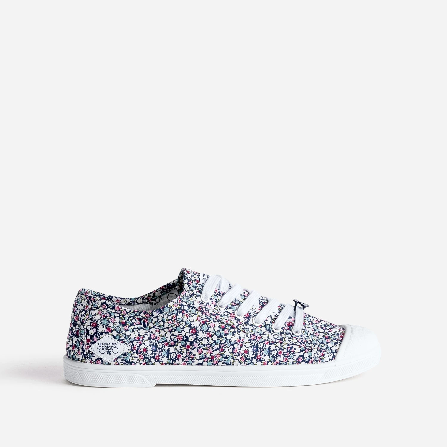 Cette tennis est un classique de la marque. En toile bleu marine, elle est rythmée de surpiqûres et d’un imprimé micro fleurs multicolore et décorée d’un charm’ cerises en métal ton sur ton glissé sur le lacet. Languette et doublure intérieure accueillent un marquage noir, et le talon, une étiquette tissée avec le logo. Une basket basse pour femme, qui affirme sa différence.