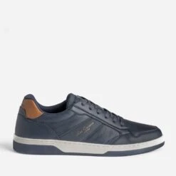 Confectionnée en matière synthétique bleu marine, cette tennis pour homme joue avec les détails pour gagner en style : perforations, embossage, contrefort camel. Un modèle relativement facile à porter, avec des tons de camel ou de bordeaux.