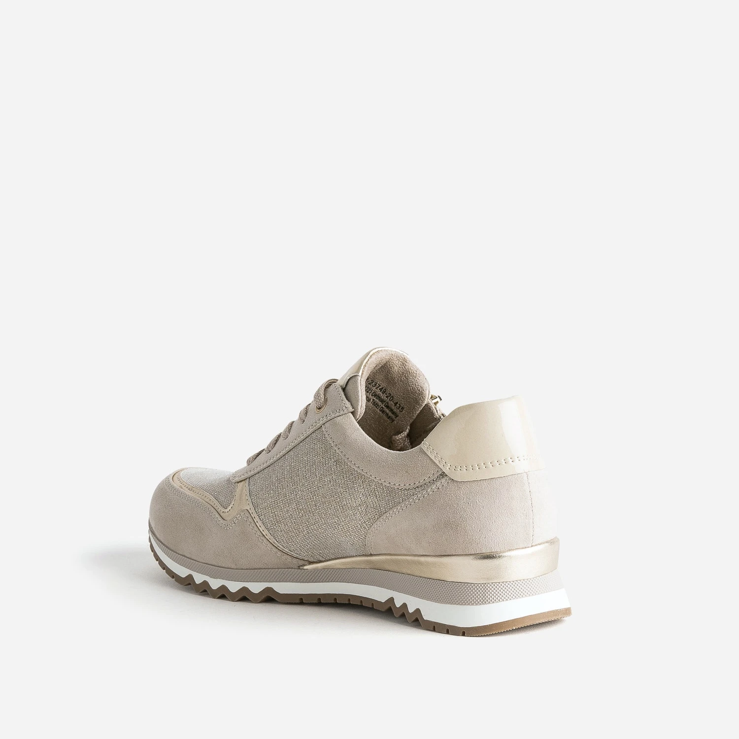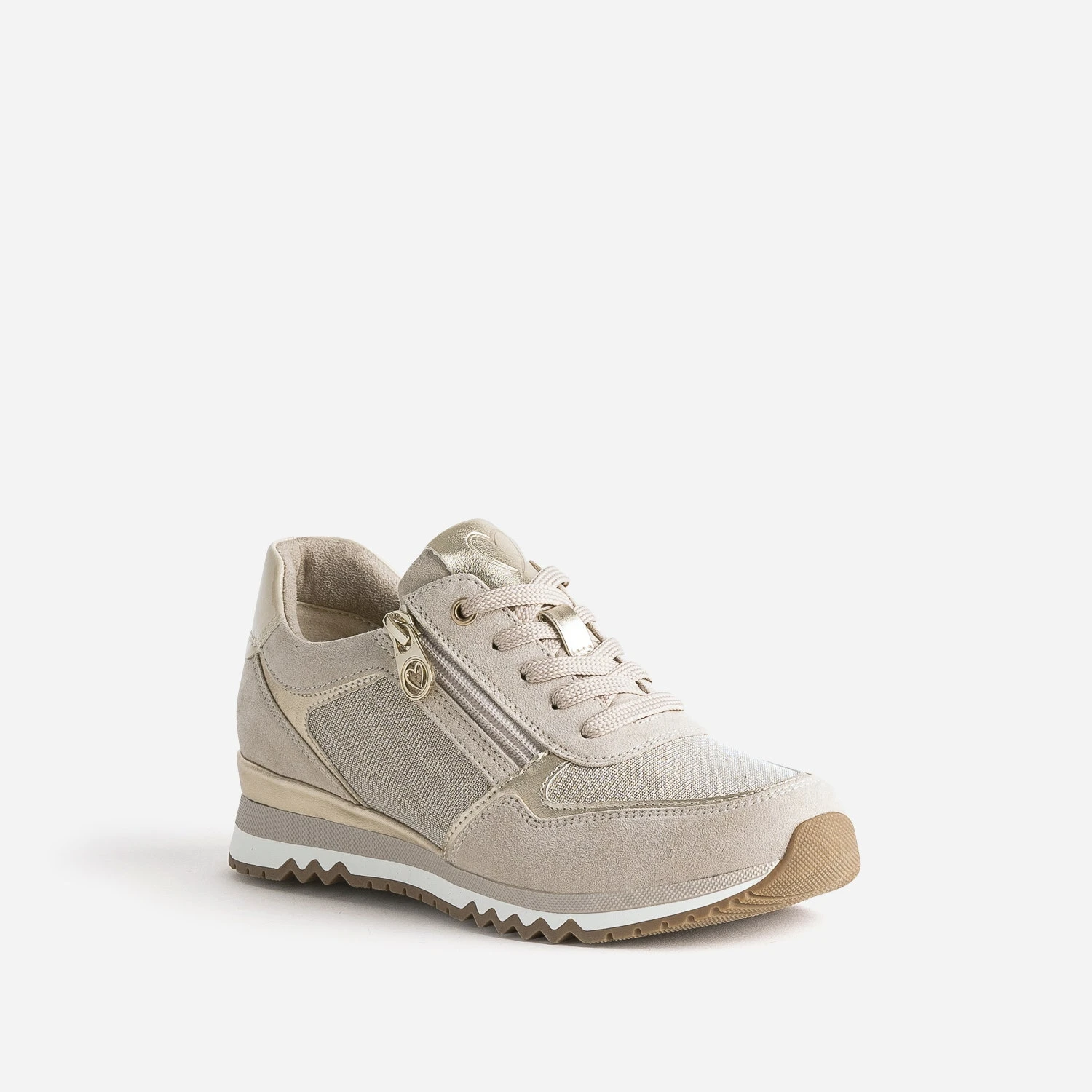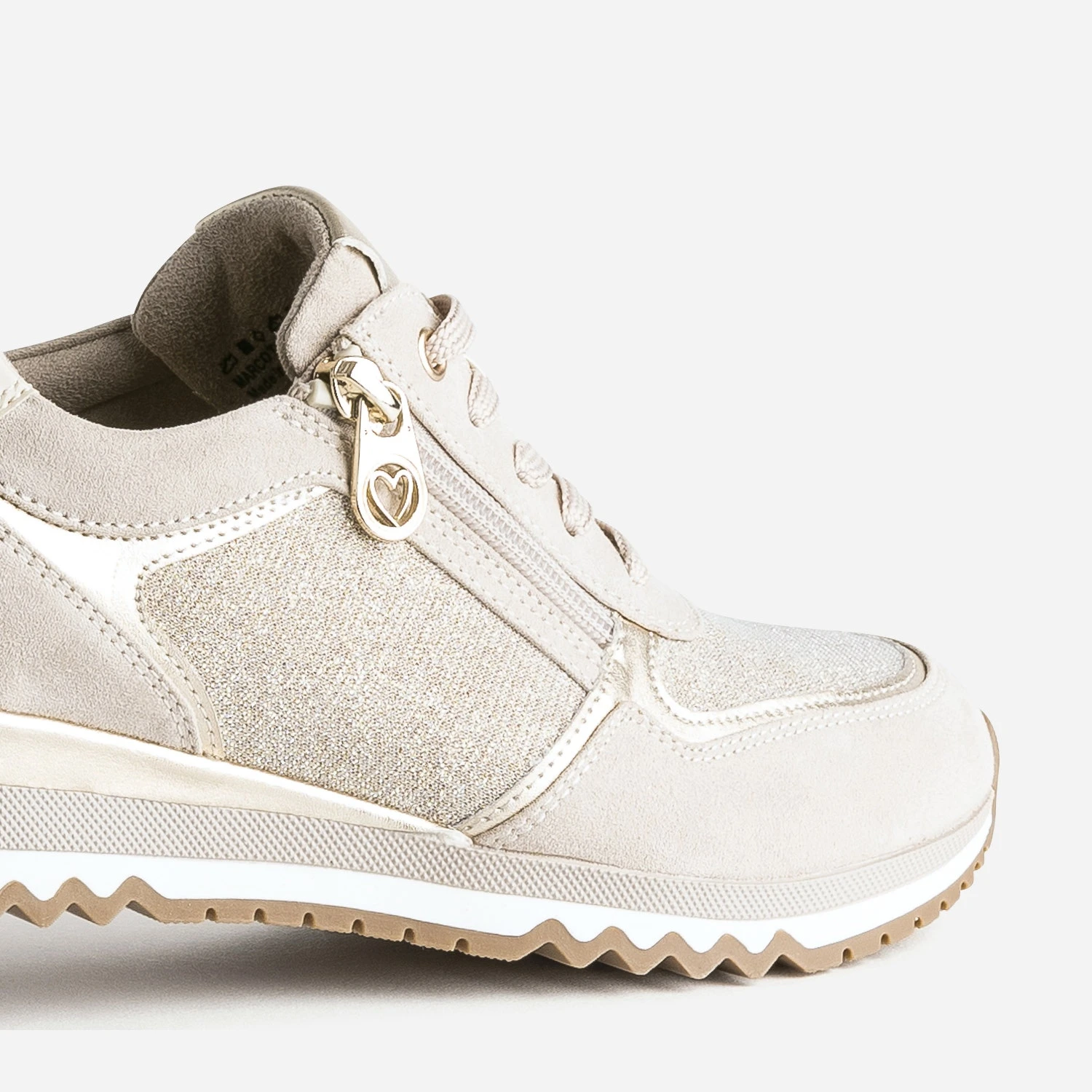 La marque MARCO TOZZI réinterprète les tendances mode avec son propre style. Cette tennis femme se décline en coloris beige, idéale pour la mi-saison. Mix de textile suédé beige et pailleté, touches dorées sur la languette et la semelle, touche vernie sur le contrefort, les détails sont soignés. Montée sur une semelle sport crantée, elle présente une semelle première amovible et promet un confort inégalé.