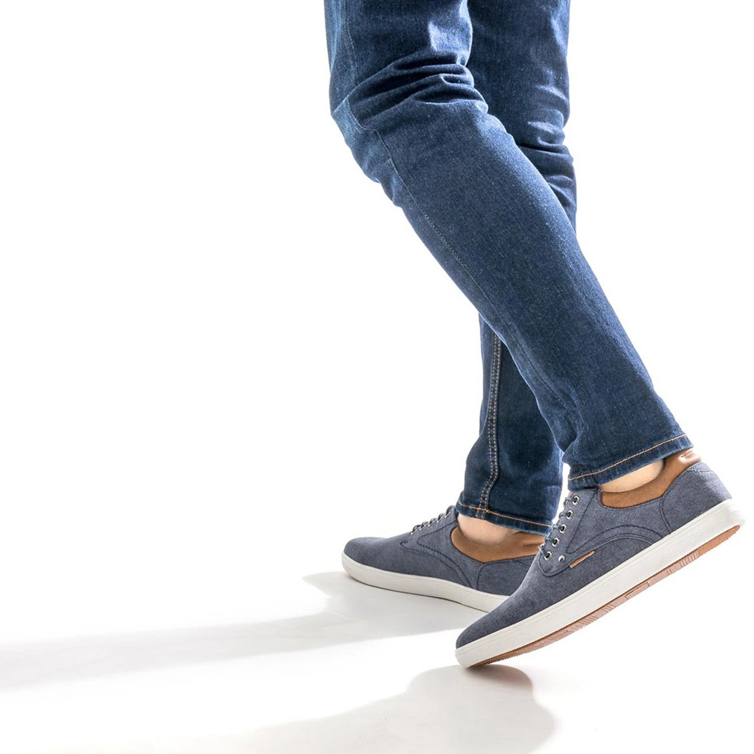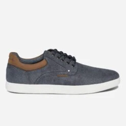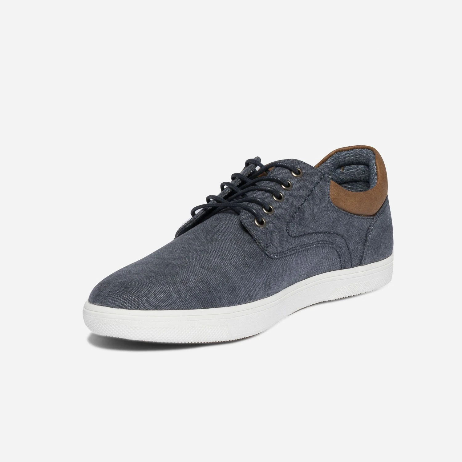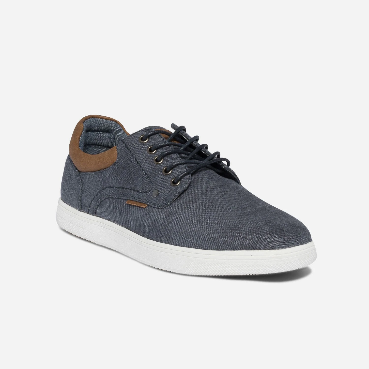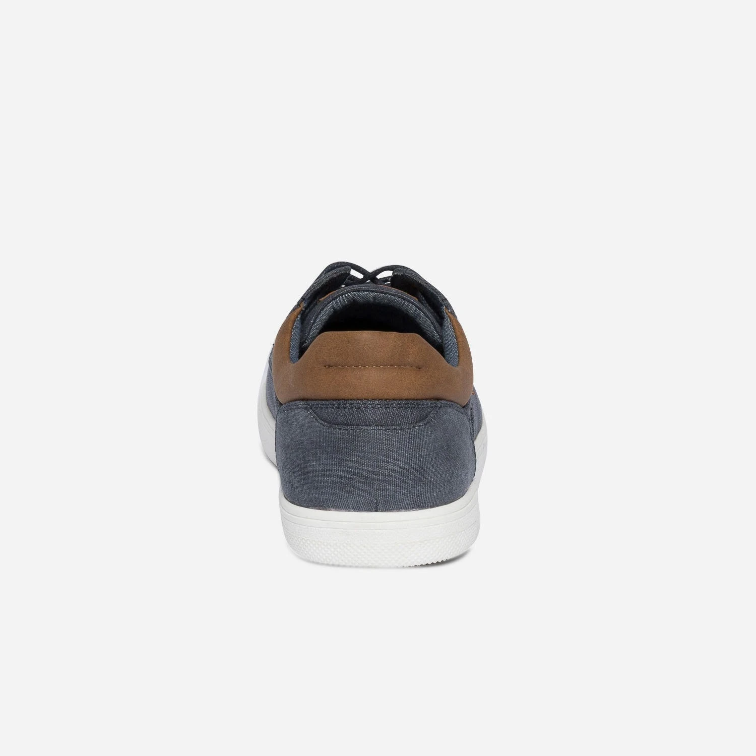 La toile de jean fait partie intégrante du dressing masculin. Elle inspire cette tennis pour homme, confectionnée dans un textile bleu marine effet chiné, bordé de synthétique camel sur le bord de la tige. La ligne épurée assure un côté sobre et casual. Un modèle à associer avec une chemise en jean et un pantalon chino beige.