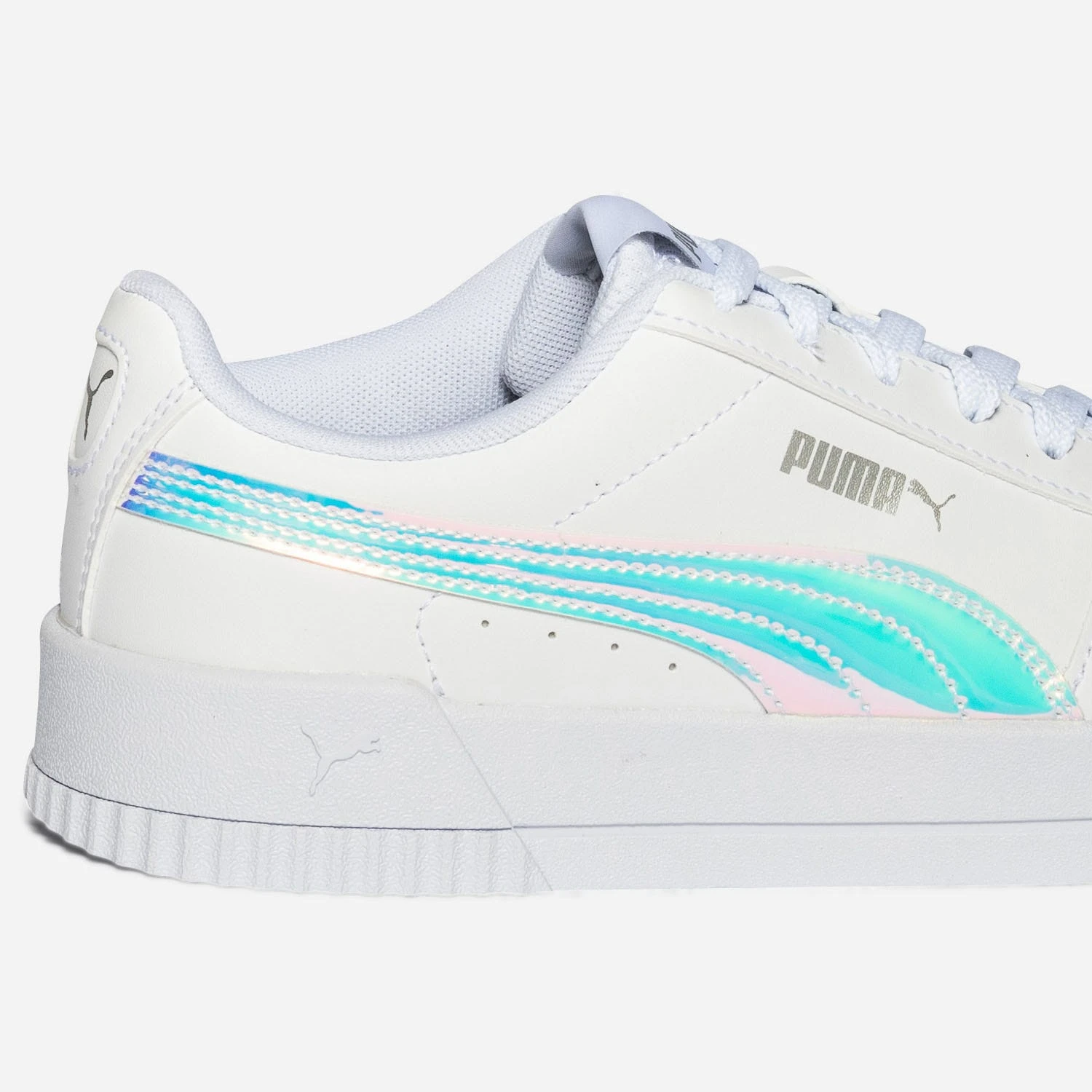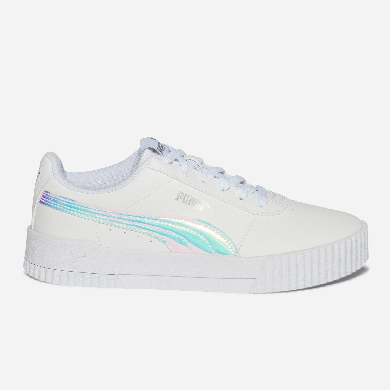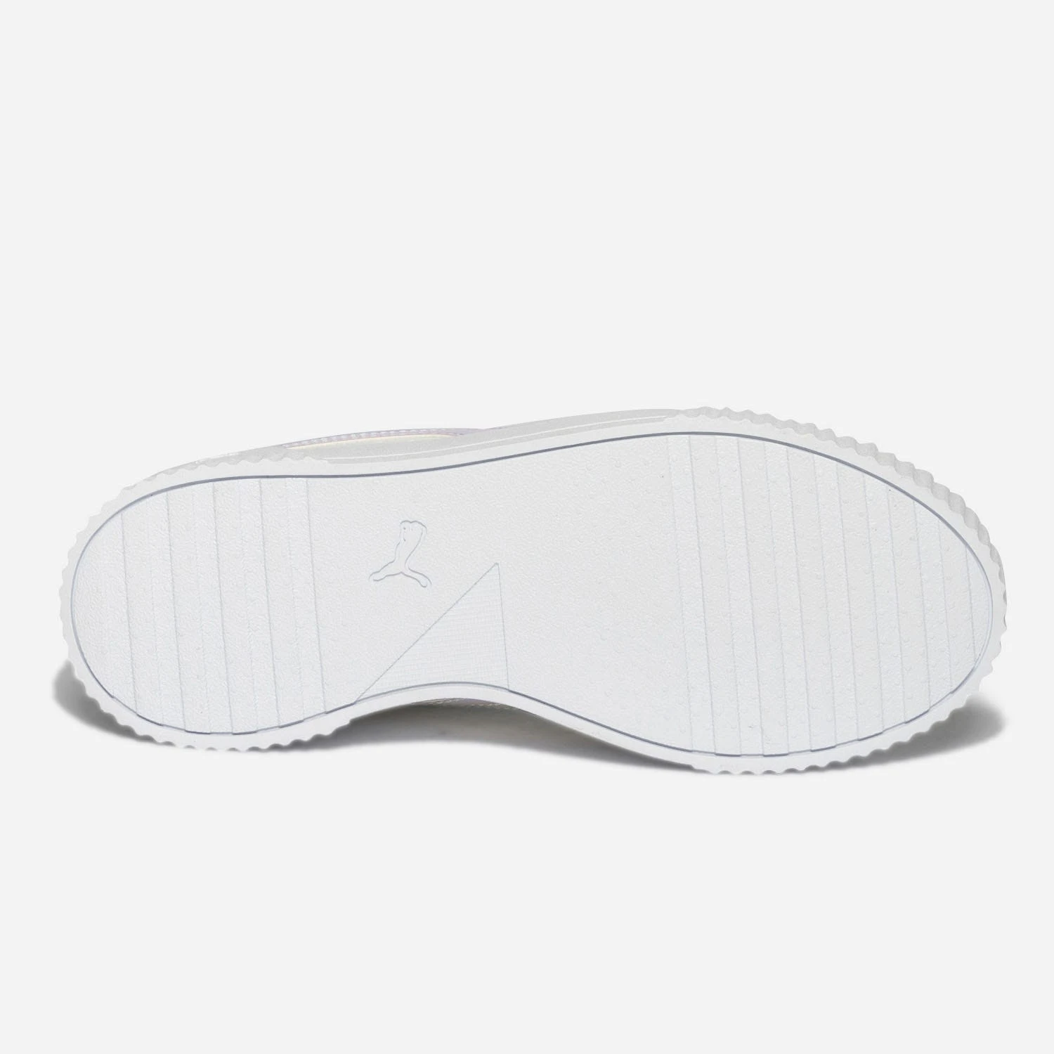 Montée sur une semelle légèrement plateforme, cette tennis PUMA bouscule les codes de l’univers du sport. En matière synthétique, elle se décline en coloris blanc depuis la tige jusqu’au lacet, modernisée de touches grises sur la doublure et les logos et traversée par une ligne identitaire iridescente. La semelle intérieure ‘Softfoam’ assure un confort optimal. Oubliez l’entraînement : associez-la, au quotidien, pour finaliser le look d’une touche décontractée.