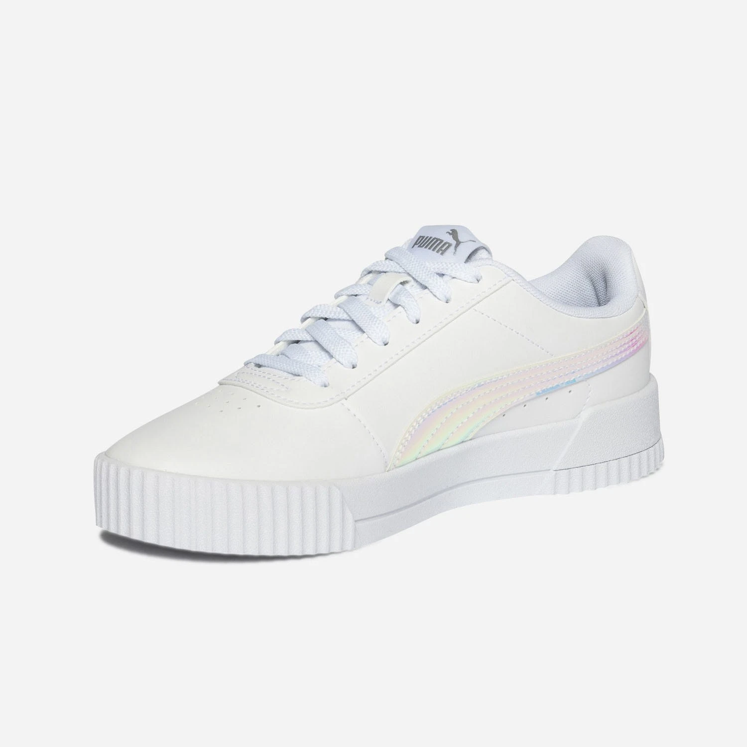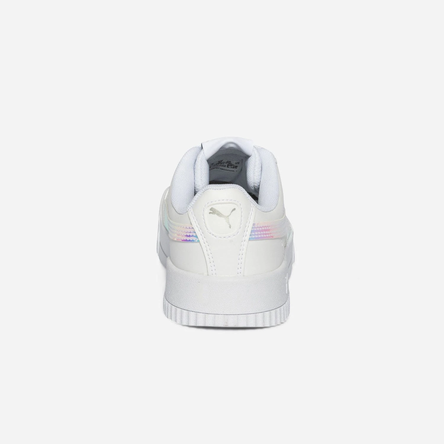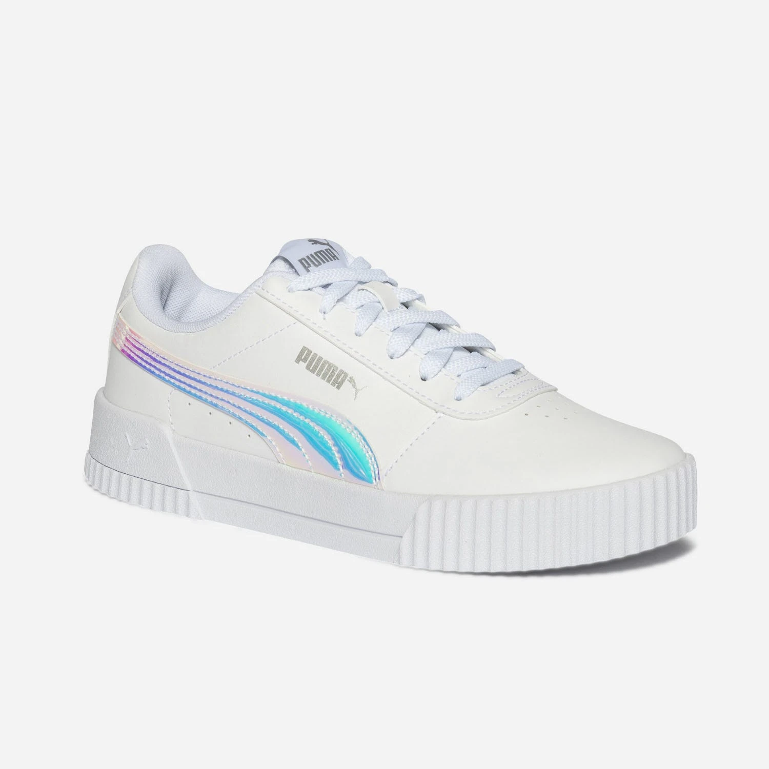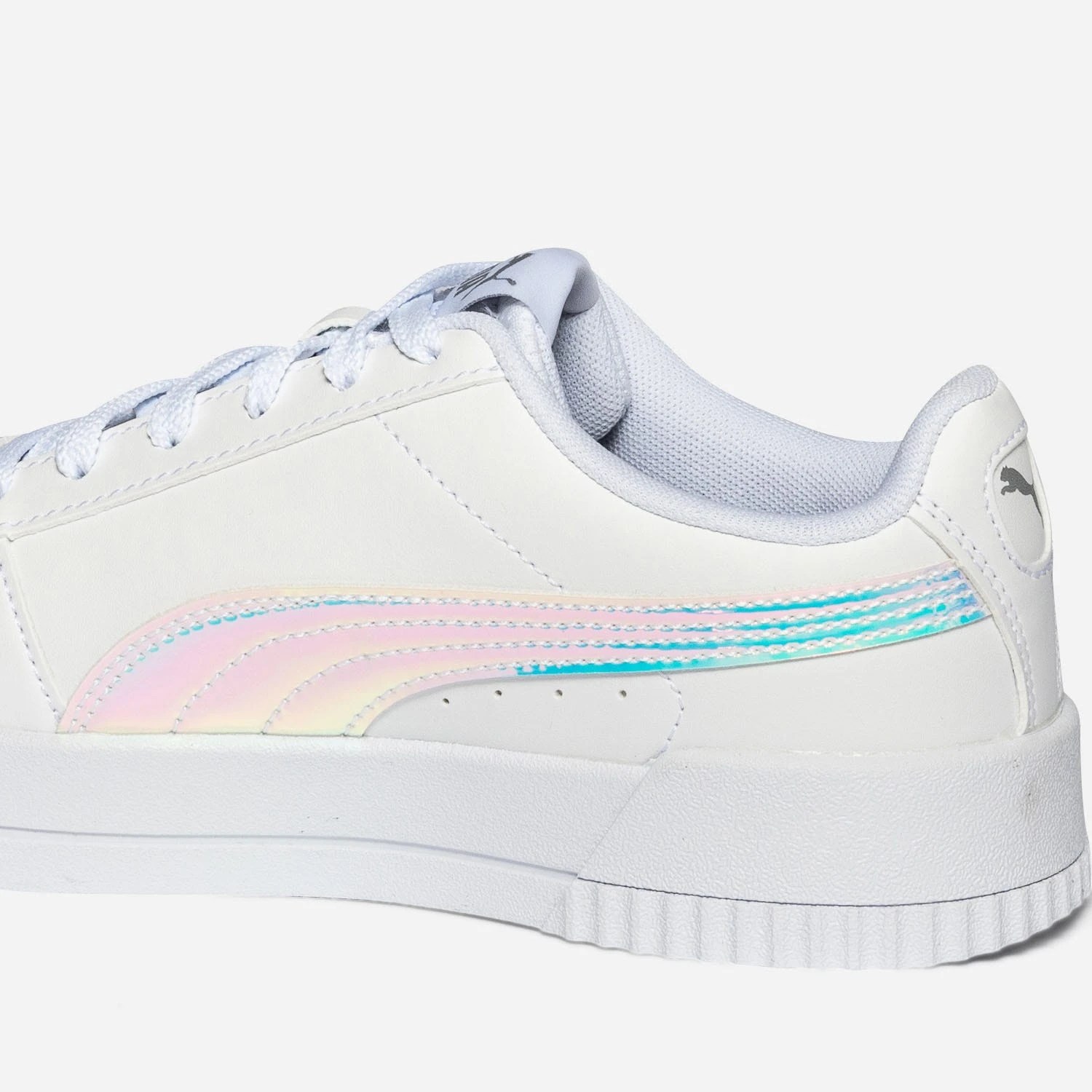 Montée sur une semelle légèrement plateforme, cette tennis PUMA bouscule les codes de l’univers du sport. En matière synthétique, elle se décline en coloris blanc depuis la tige jusqu’au lacet, modernisée de touches grises sur la doublure et les logos et traversée par une ligne identitaire iridescente. La semelle intérieure ‘Softfoam’ assure un confort optimal. Oubliez l’entraînement : associez-la, au quotidien, pour finaliser le look d’une touche décontractée.