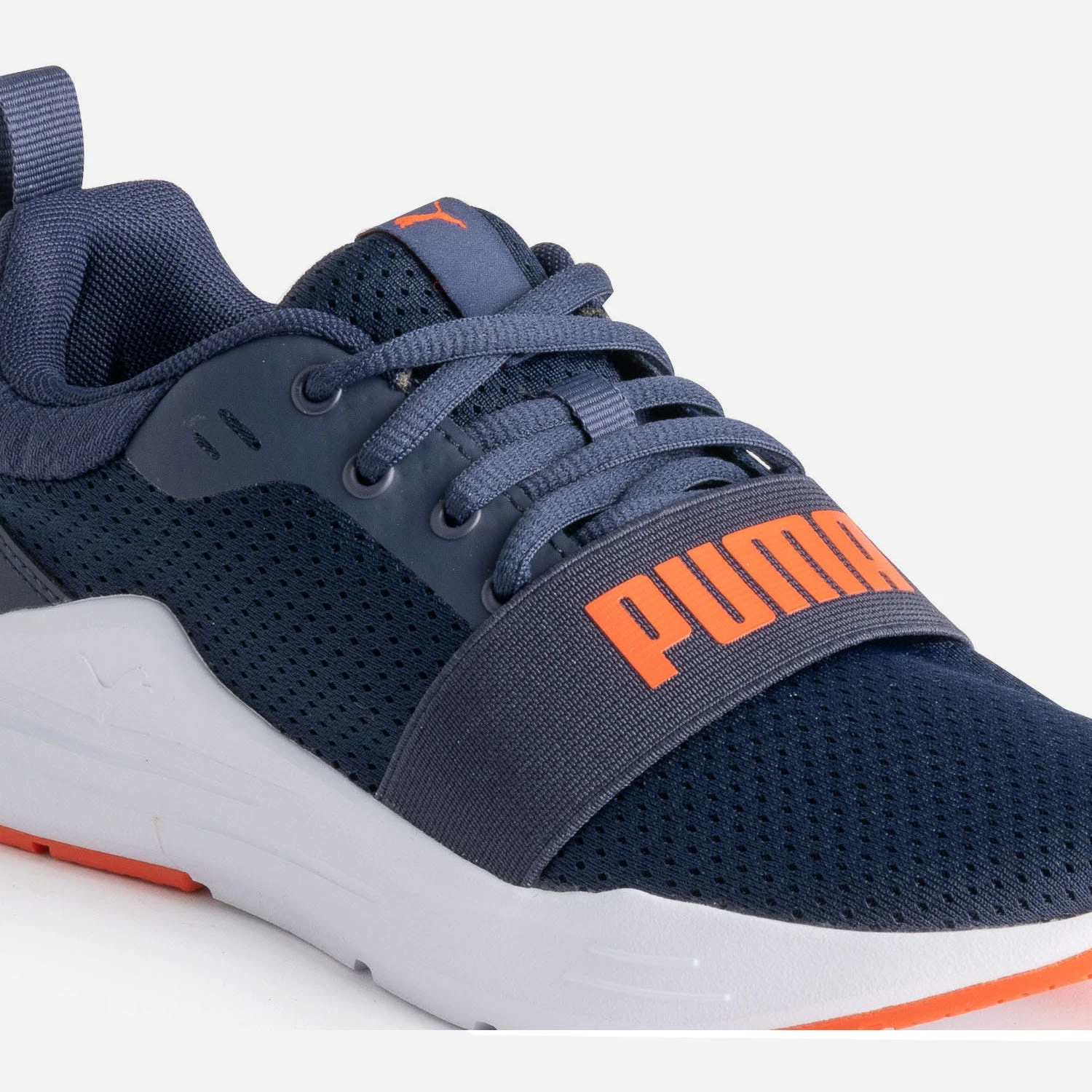 Cette tennis PUMA s’affirme par un design quasi futuriste. ConfectionnĂ©e en mesh bleu marine, elle se ferme par lacet ton sur ton et est dĂ©corĂ©e par un large Ă©lastique animĂ© du logo de la marque en coloris rouge orangĂ©, en Ă©cho aux dĂ©tails de la semelle. Un modèle ultra lĂ©ger pour courir encore plus vite.