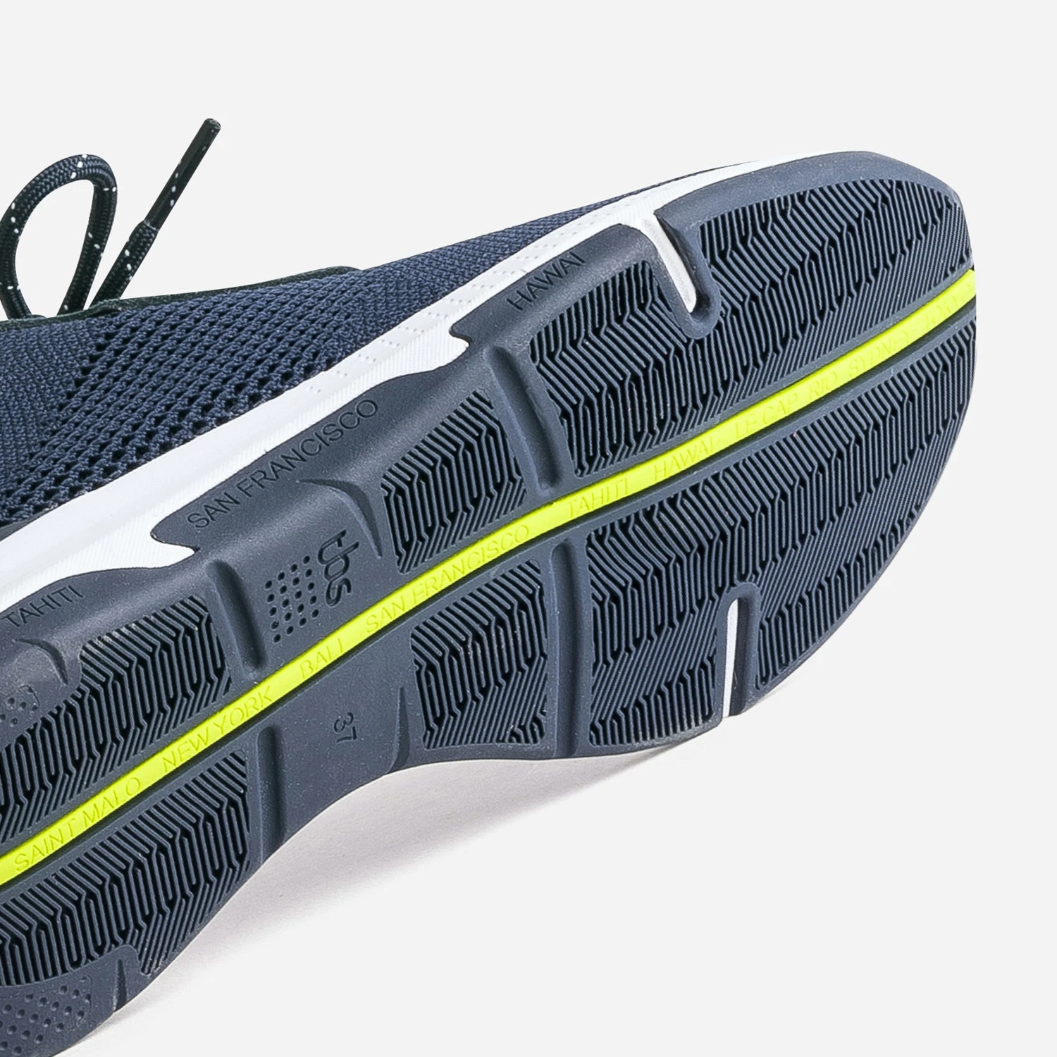 Née du sport, la marque TBS trouve son ancrage dans l’univers nautique. Légitime à terre comme en mer, ses produits sont reconnus pour leur confort. Conçue en textile tricoté marine inspiré du mesh des équipements de sport et non doublé, cette tennis pour femme de la gamme ‘Les Marinières’ adopte un design dans l’air du temps. New York, Hawaï ou Saint Malo, Honolulu ou Hong Kong, les destinations s’affichent sur le bord de la semelle.